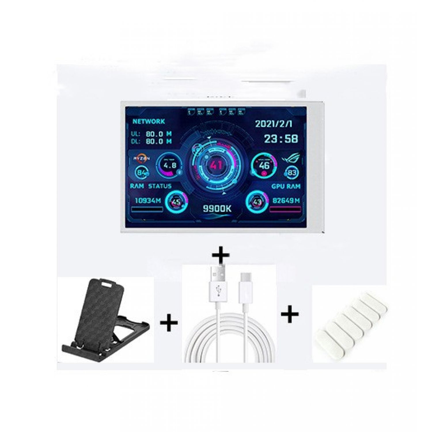 Package 3: Screen +Type-C data cable + stand +usb four-port spliter +Type-C charging base + Elbow data cable type-c+4PIN motherboard transfer cable 9 pins