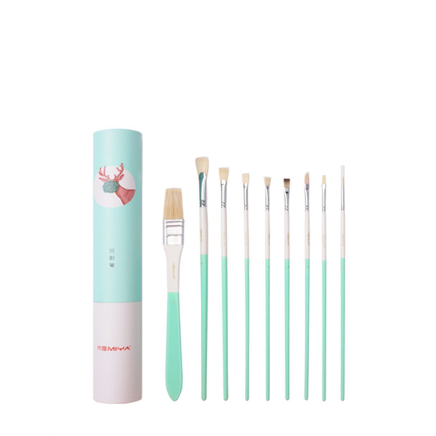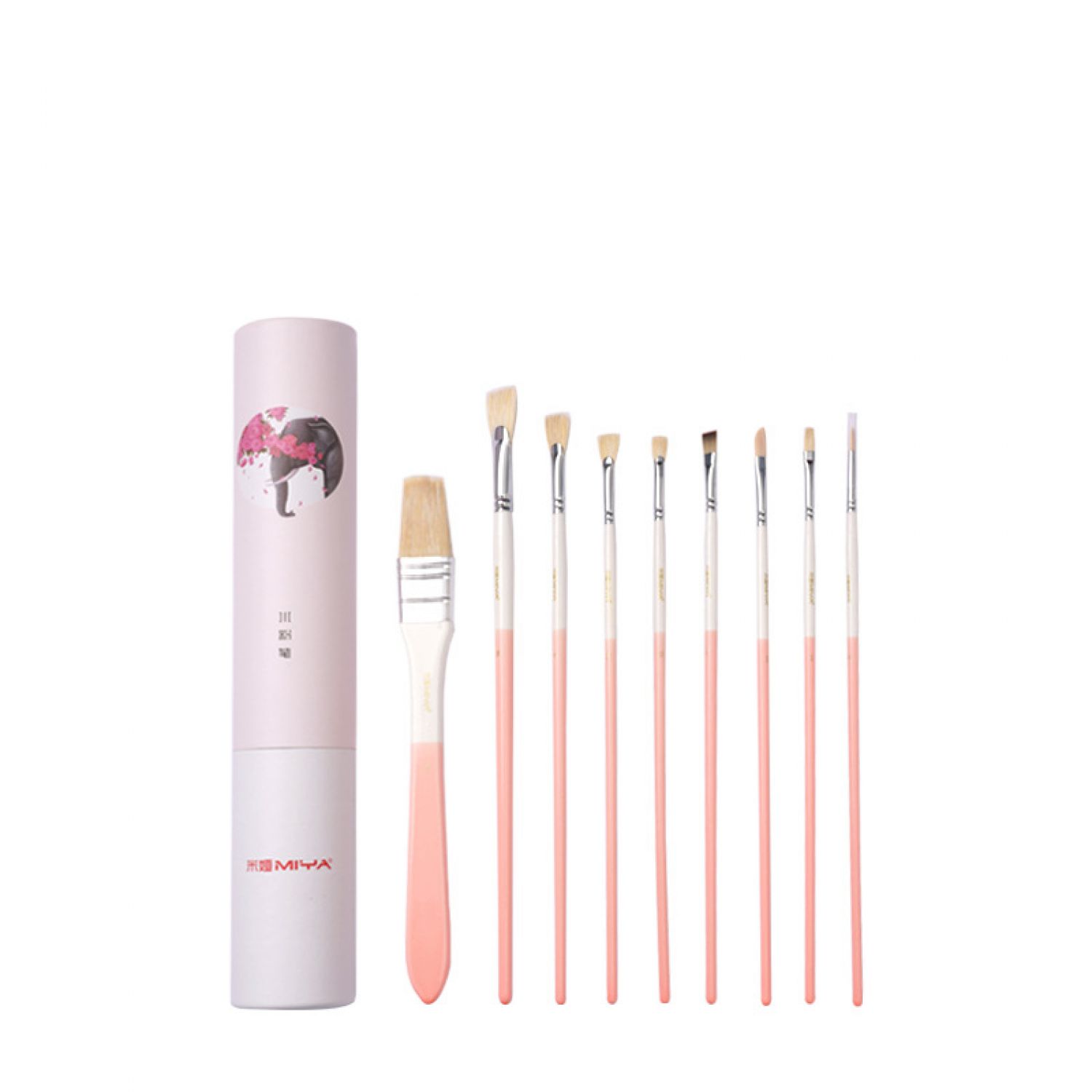 1 wide brush, 1 nylon gouache, 1 eyeliner brush, 1 chalk, 1 corner brush, 4 fan-shaped brushes.
