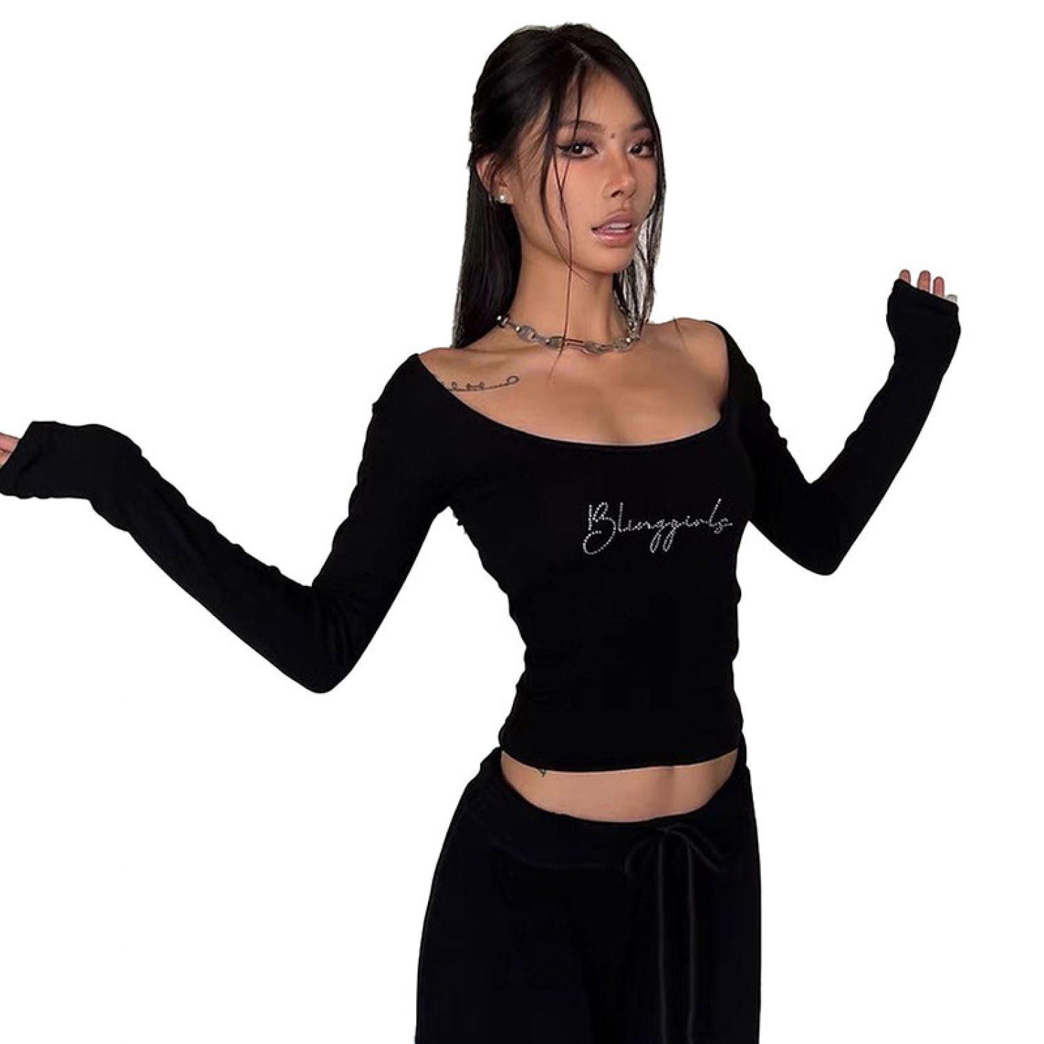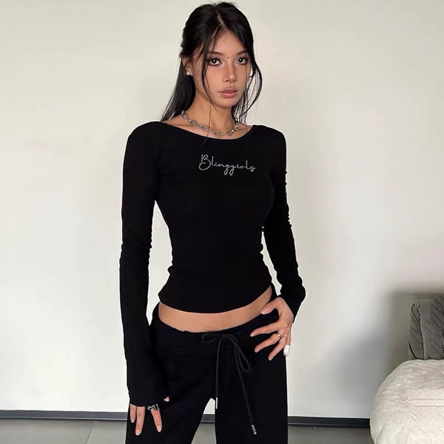 American Retro Style Low Collar Letter Rhinestone Short Navel Black Top Black Q23TP637 S