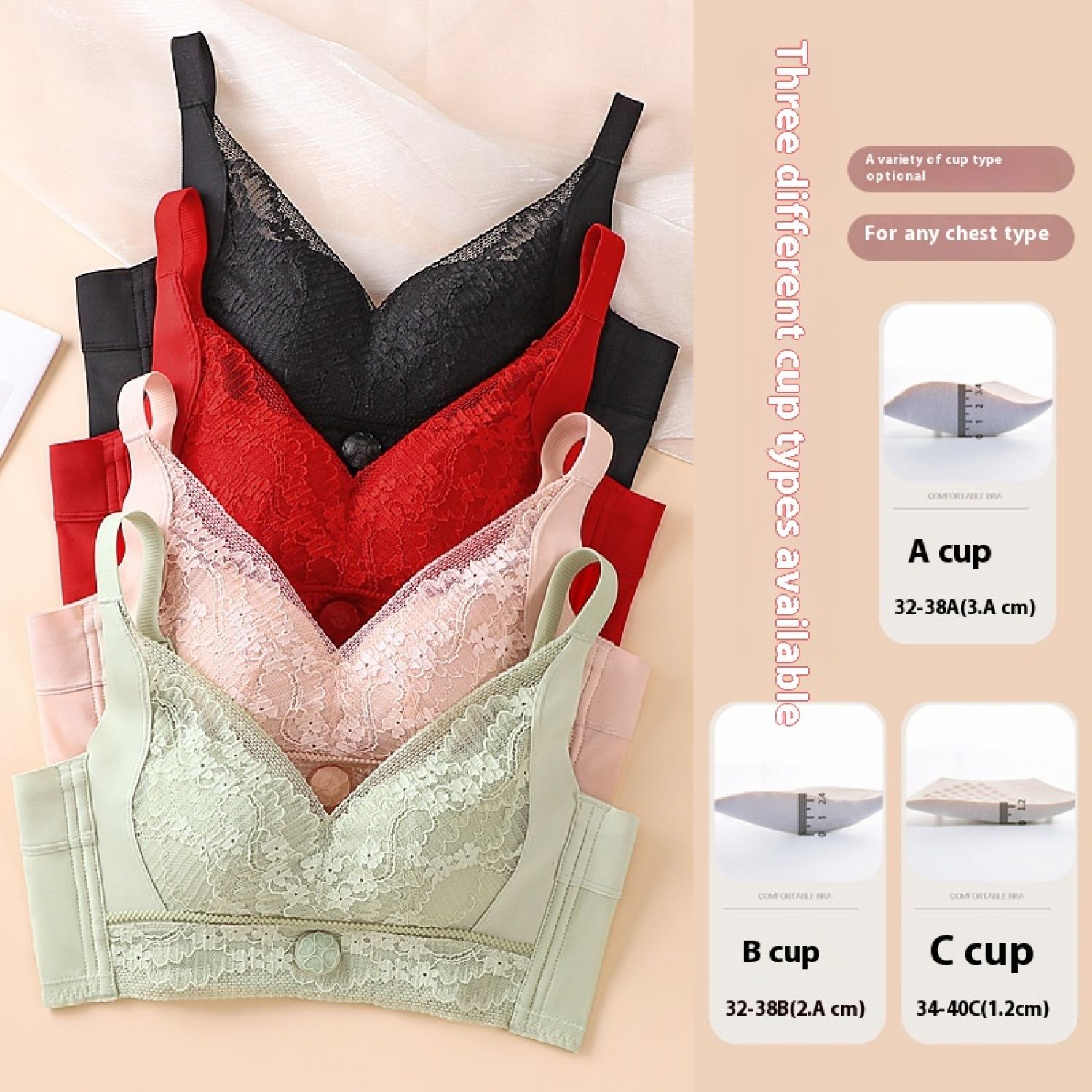 Size: 32/70A thick 3.4cm,34/75A thick 3.4cm,36/80A thick 3.4cm,38/85A thick 3.4cm,32/70B thick 2.4cm,34/75B 2.4cm thick, 36/80B 2.4cm thick, 38/85B 2.4cm thick, 34/75C 1.2cm thin, 36/80C 1.2cm thin, 38/85C thin 1.2cm,40/90C thin 1.2cm