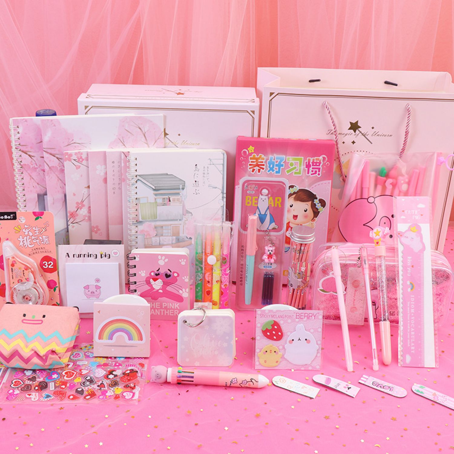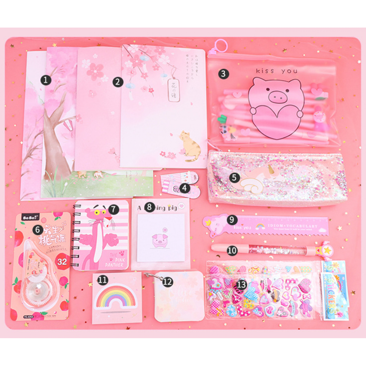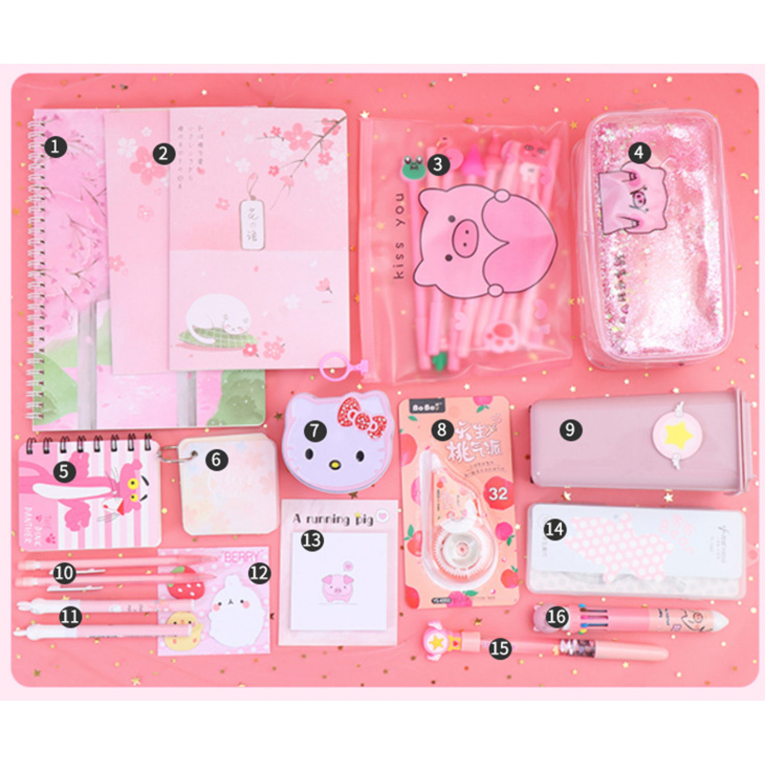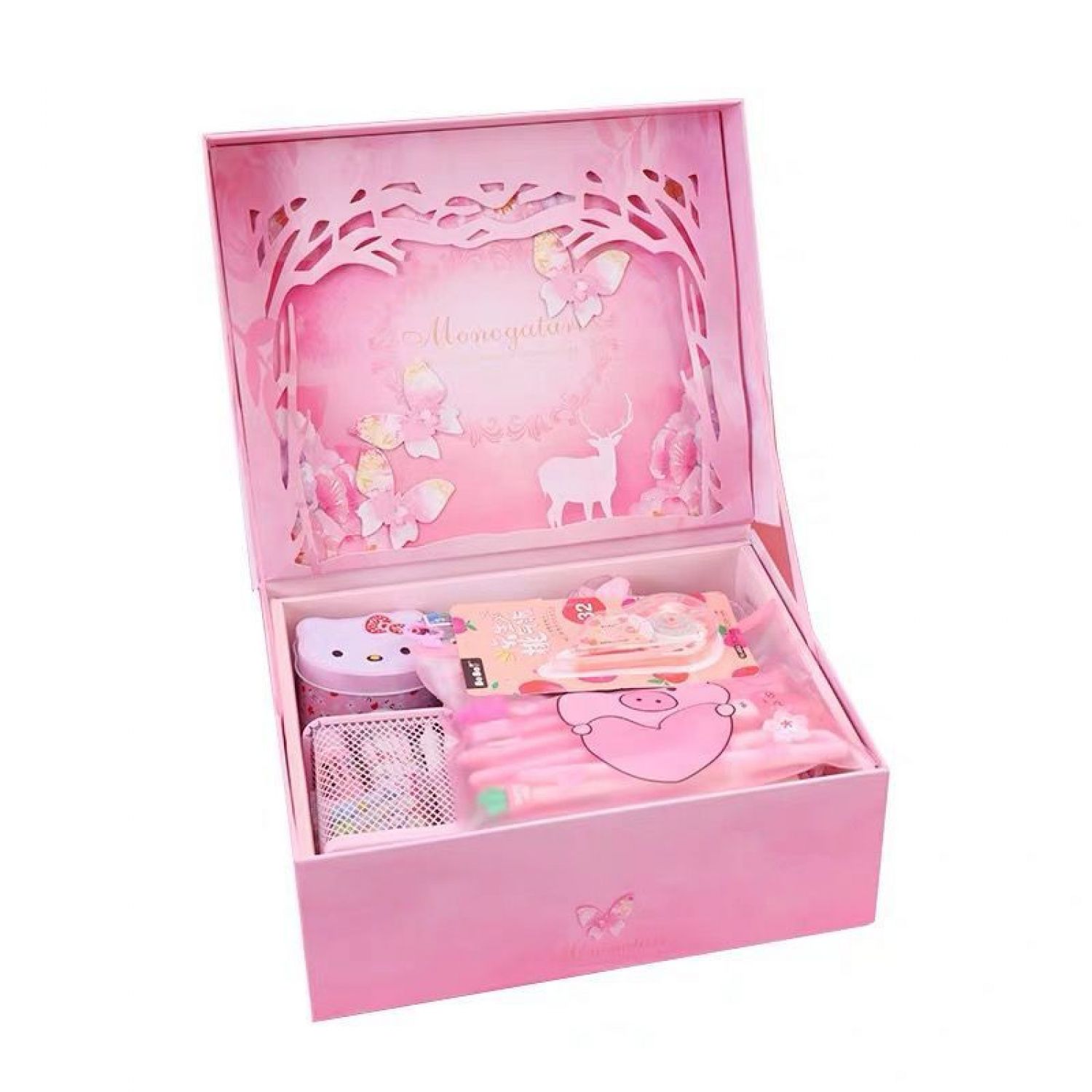 Components: pencil case, gel pen, correction tape, cartoon gift box, etc.