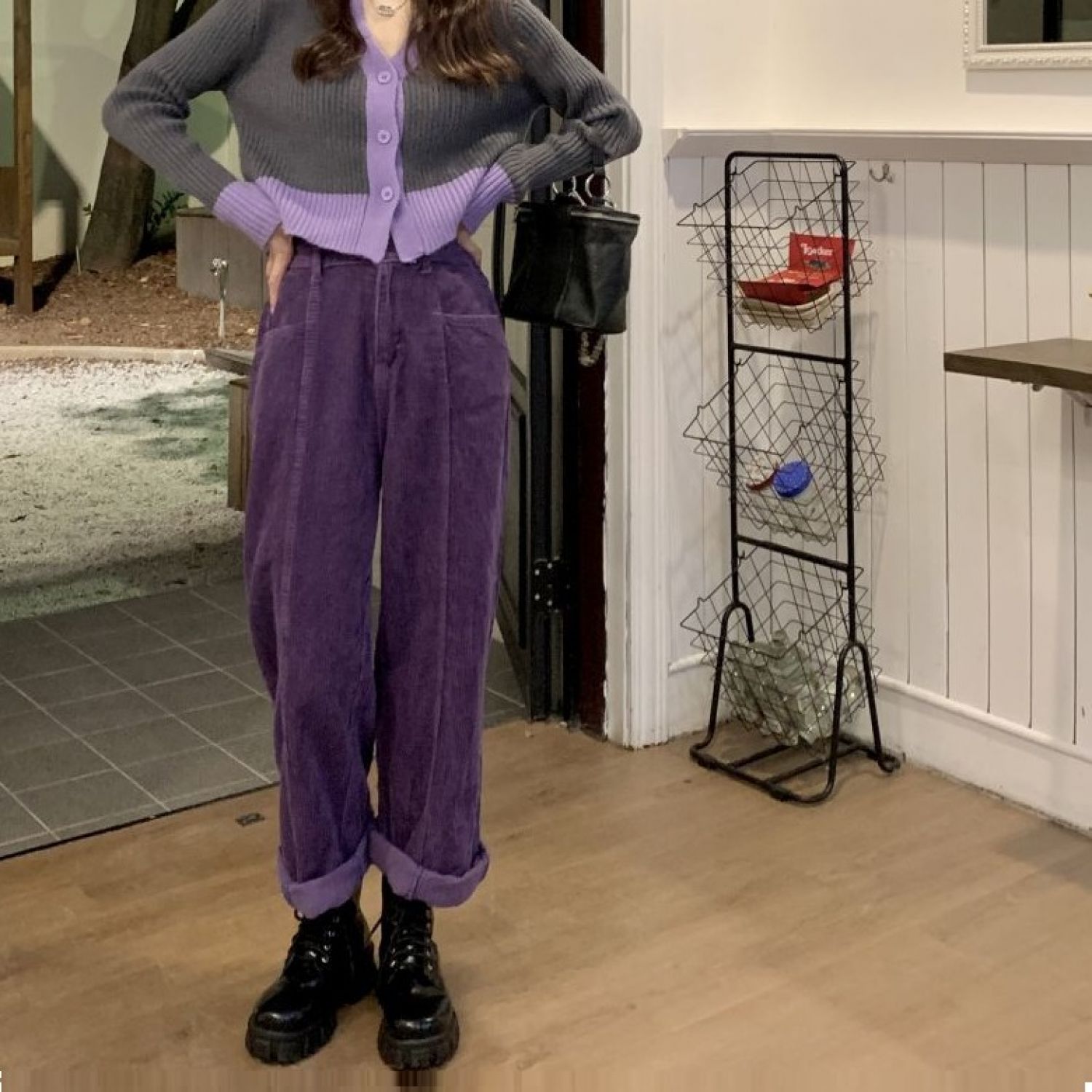 High Waist Slimming And Velvet Padded Straight Purple Corduroy Wide-leg Pants Purple Thin L