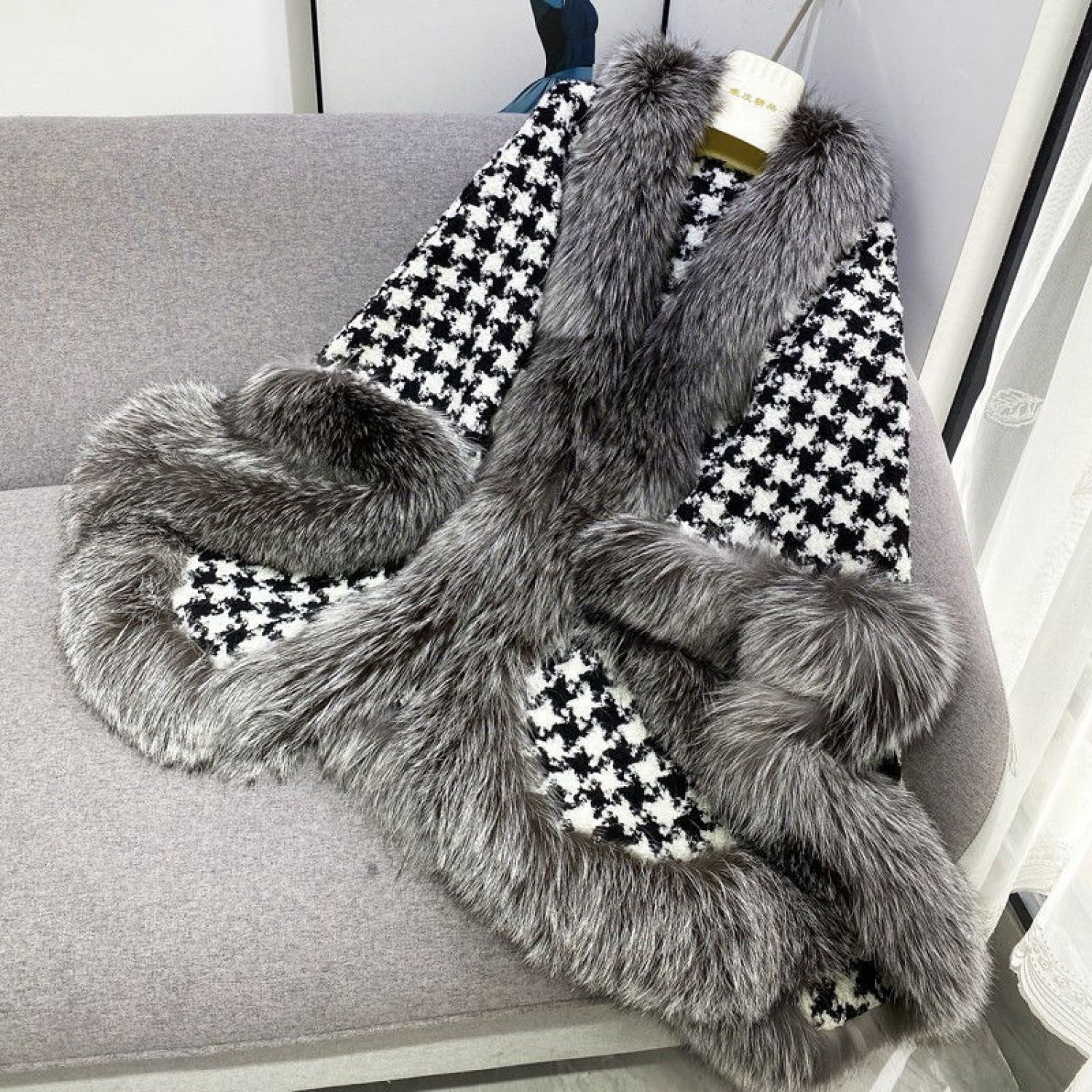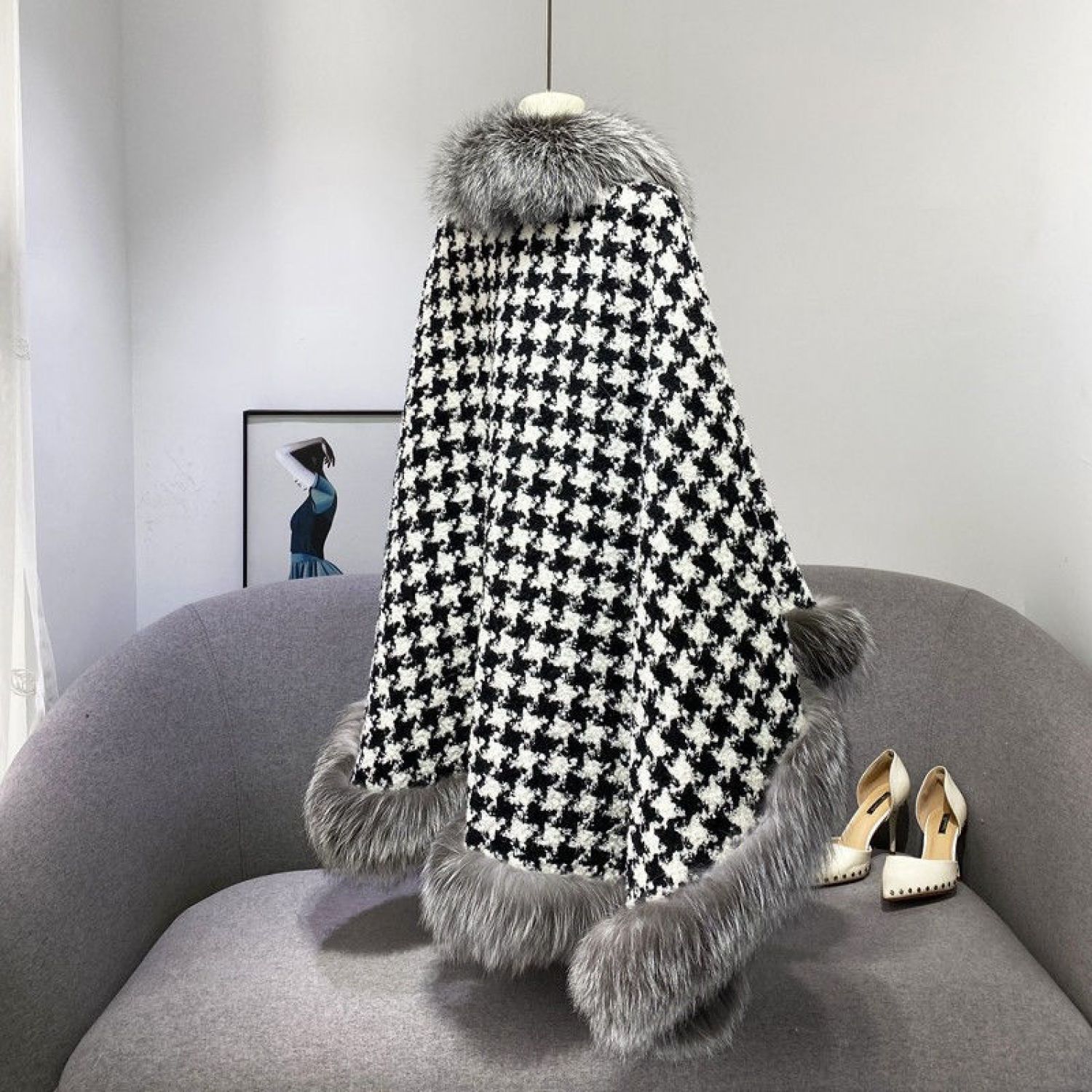 Houndstooth Thickened Net Red Fur Coat Shawl Cloak Picture color One size