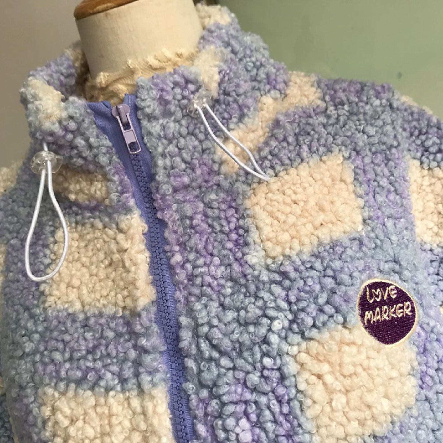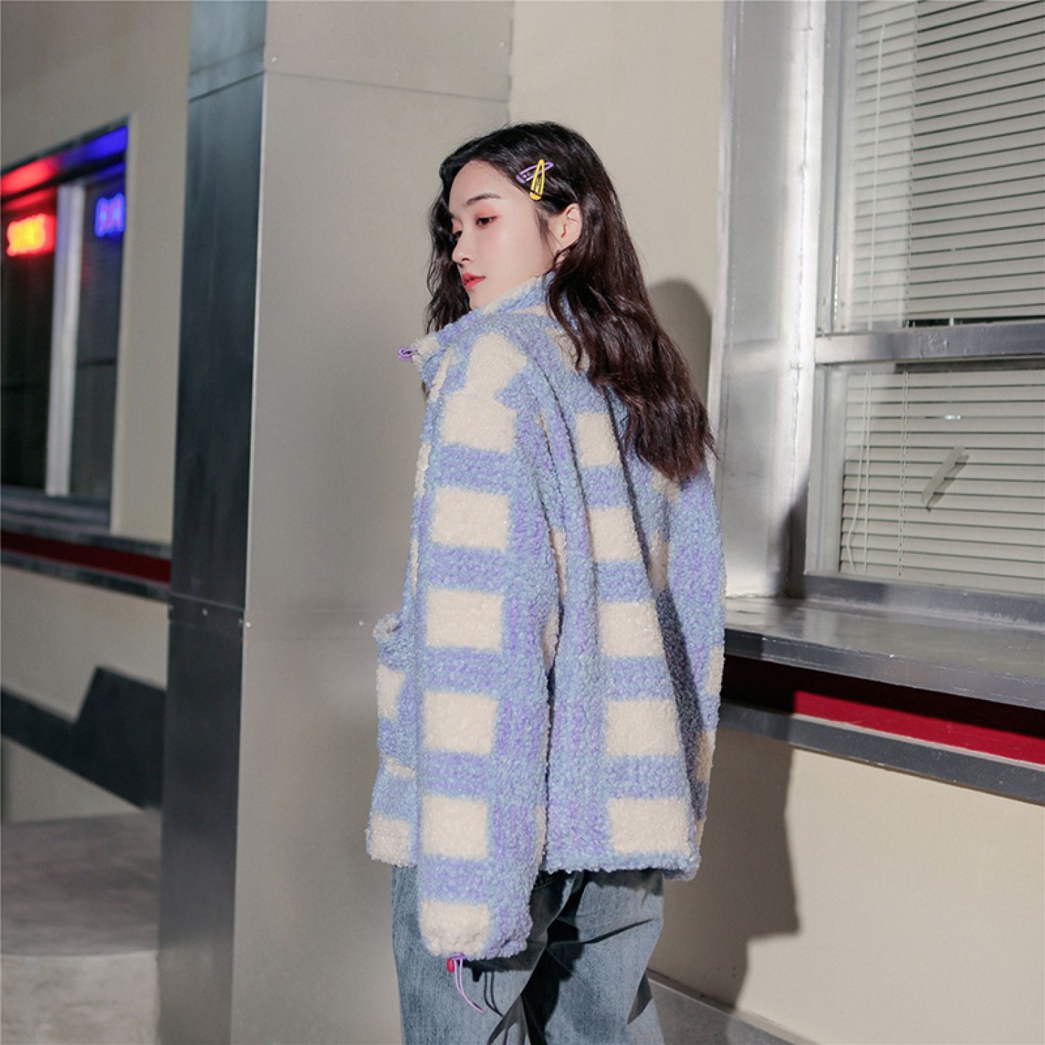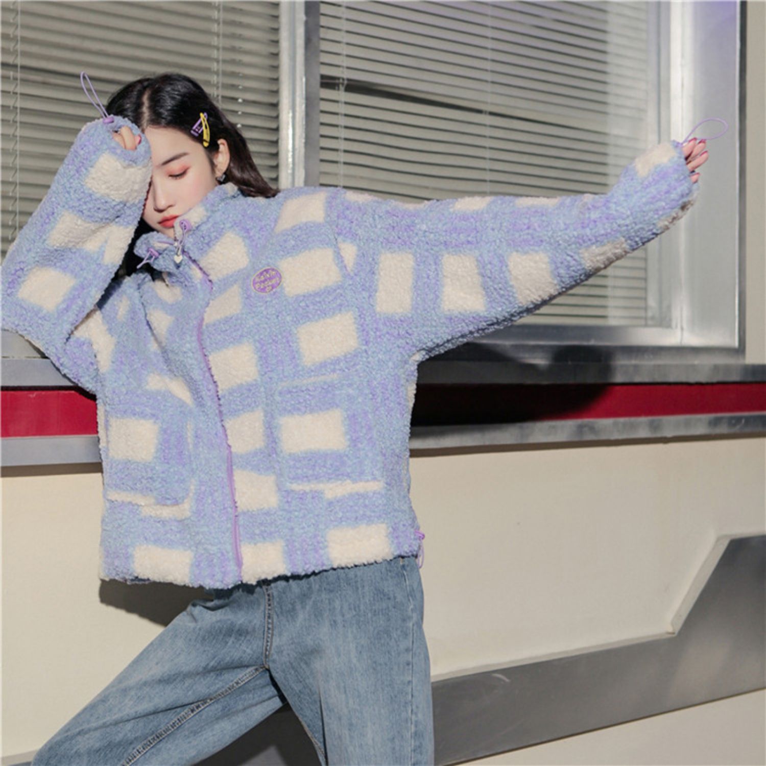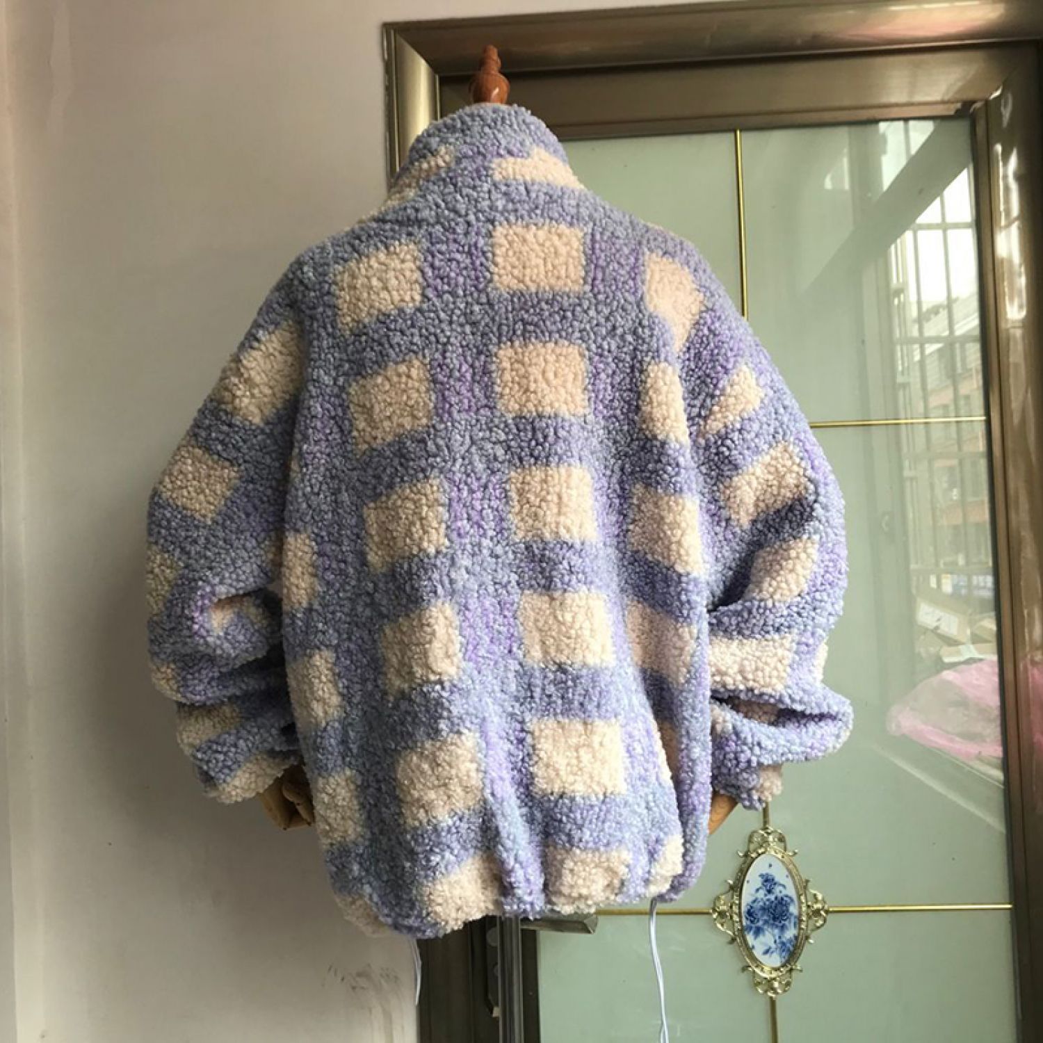Ladies Faux Lamb Velvet Warm Wool Check Jacket Purple plus cotton S