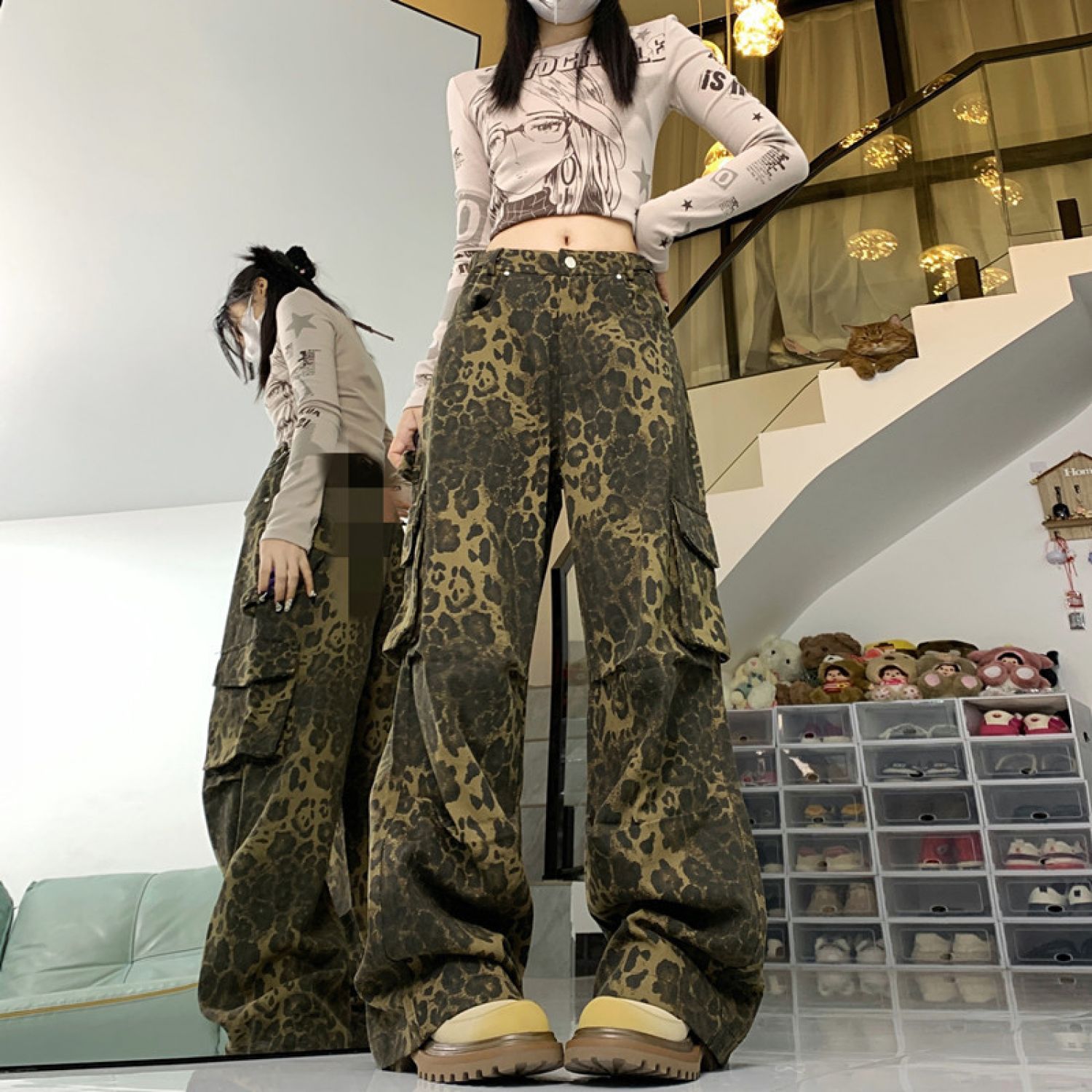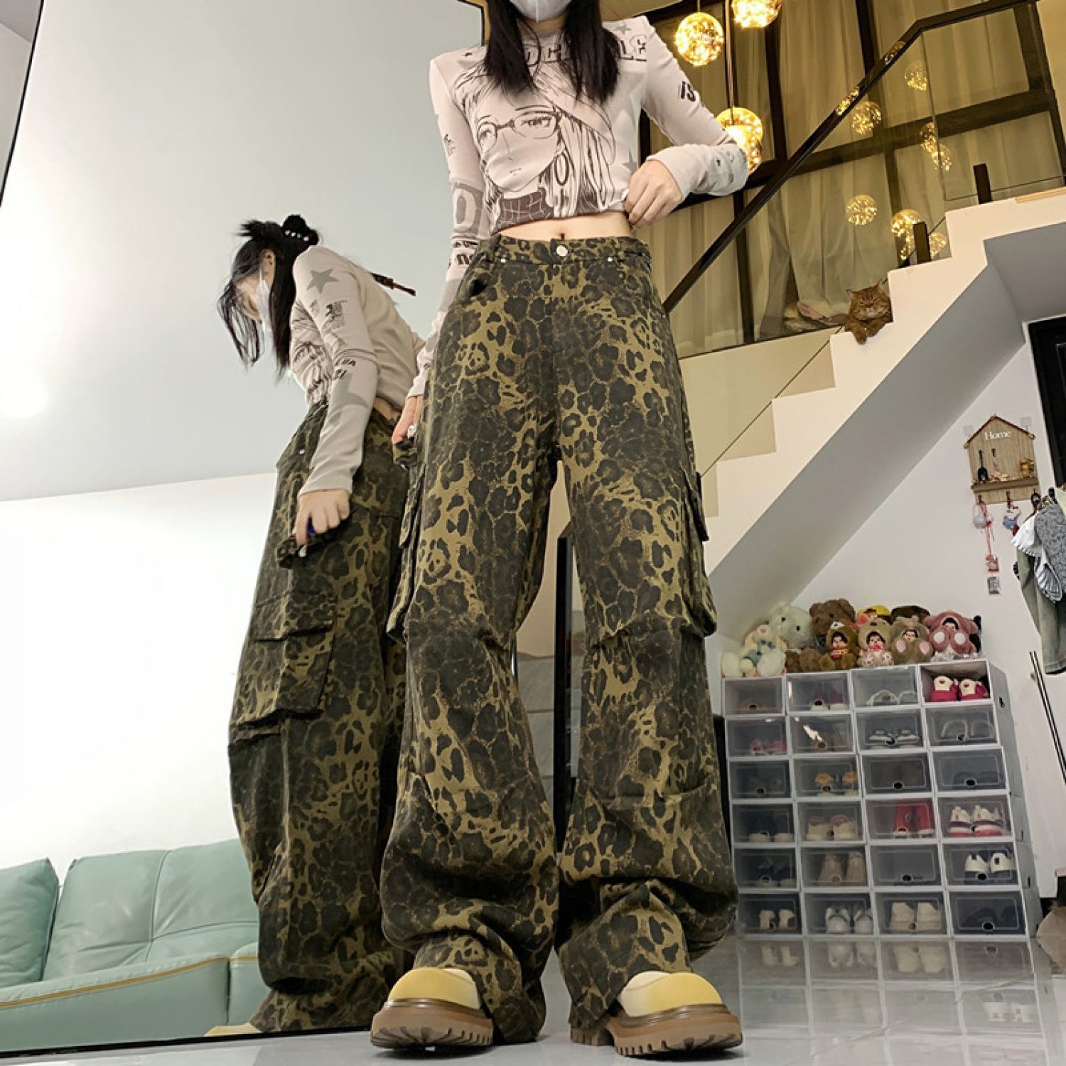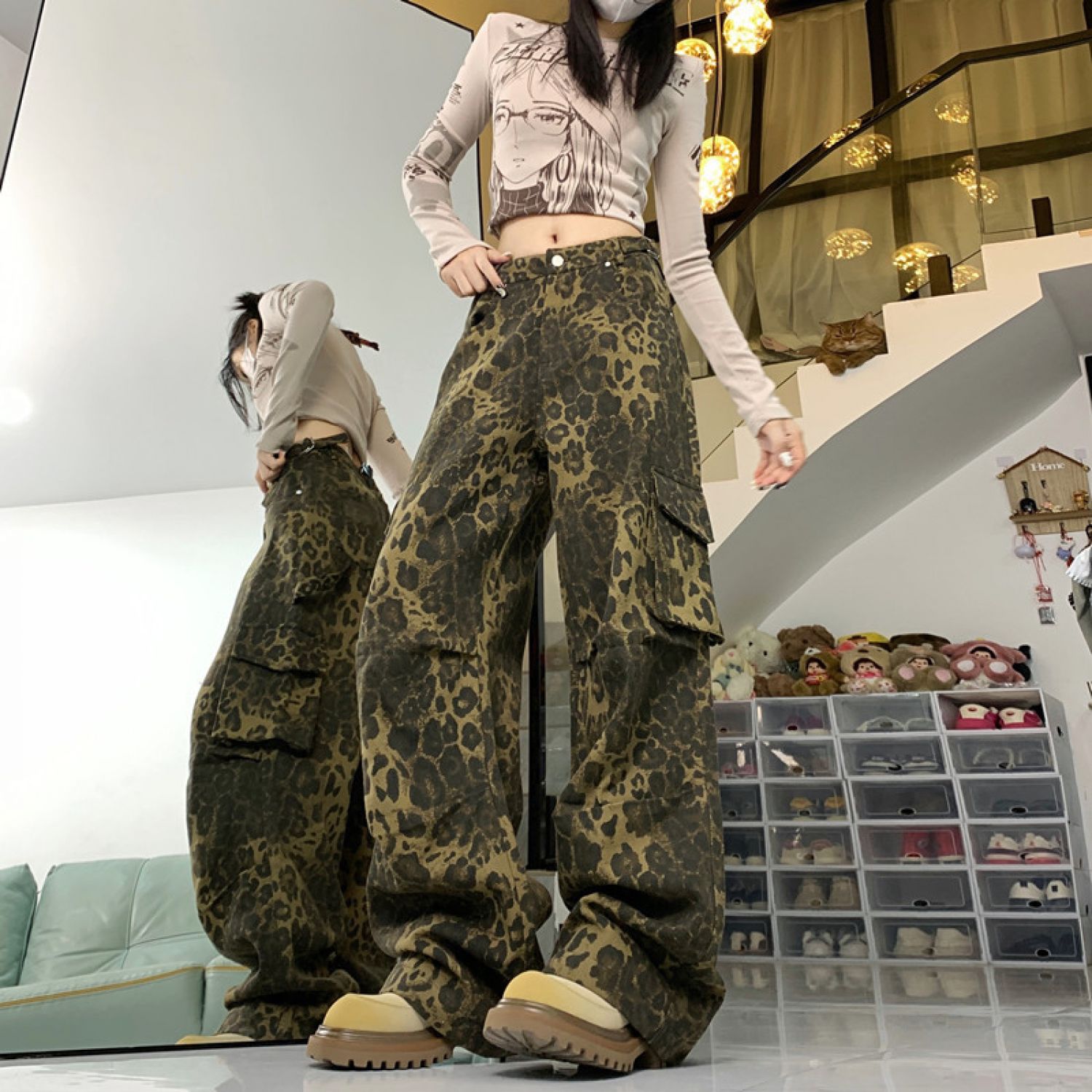 Product information: Color: Leopard work clothes Main fabric composition: Cotton Pants length: trousers Waist type: high waist Size: S,M,L,XL Popular elements: Pocket Style: Three-dimensional cutting