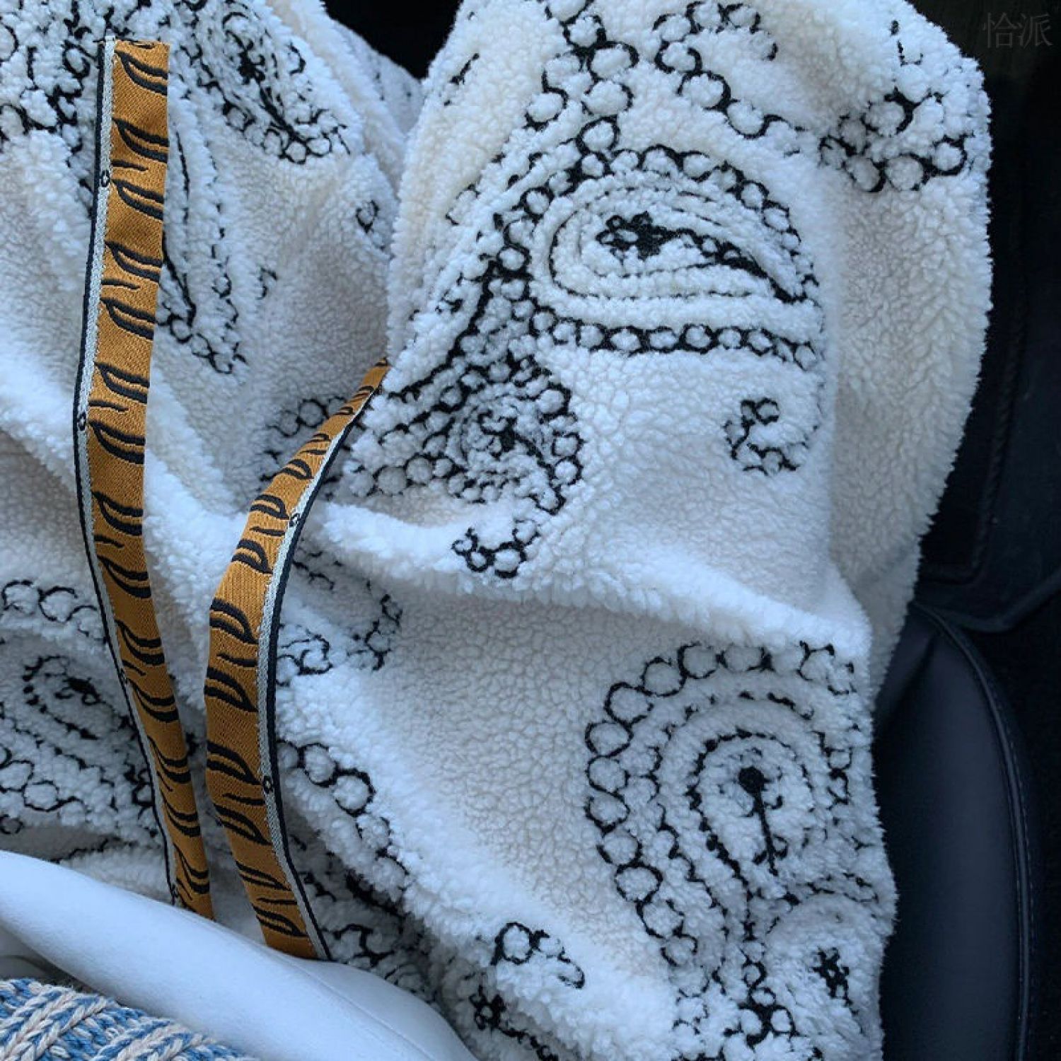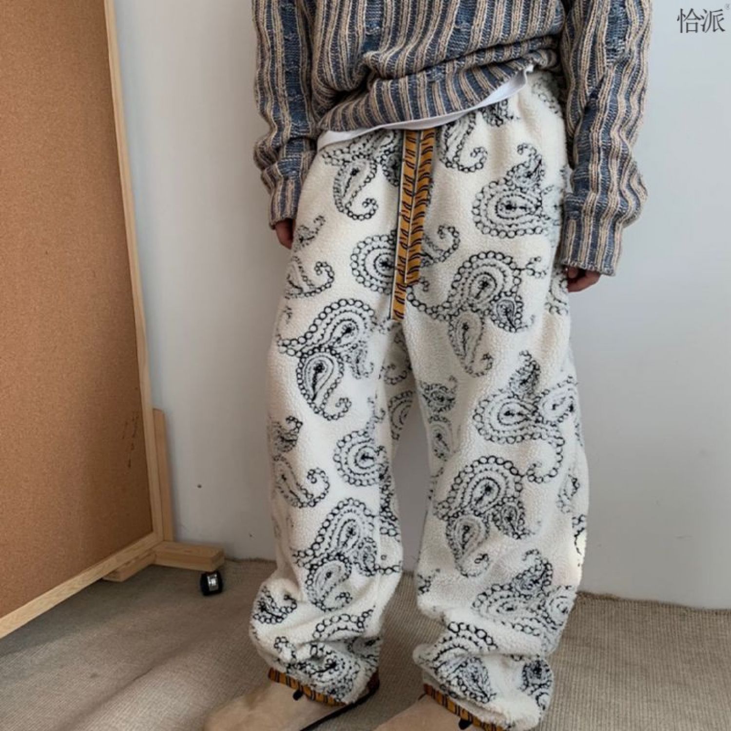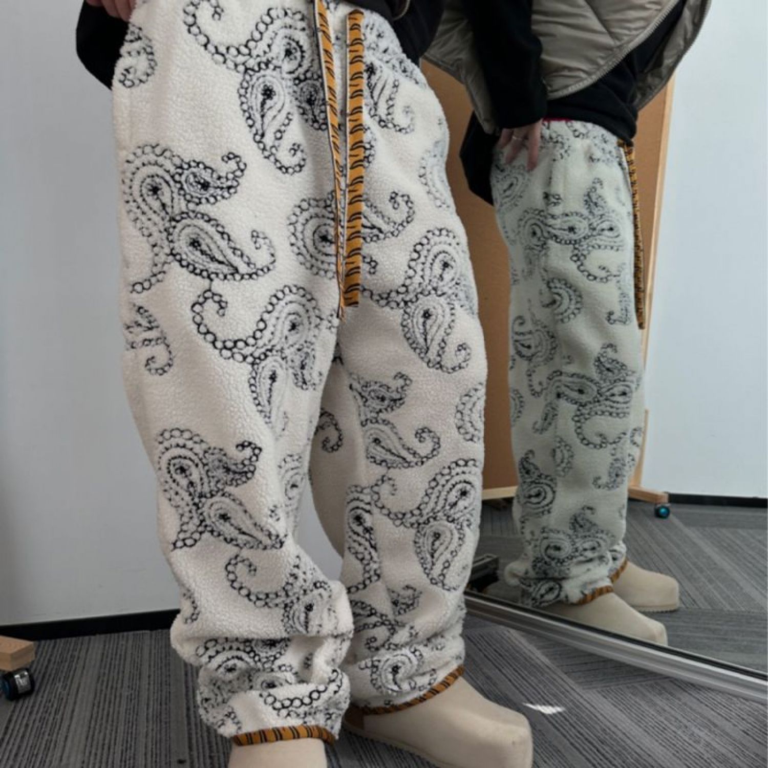 Color: white paisley fleece pants, black paisley fleece pants