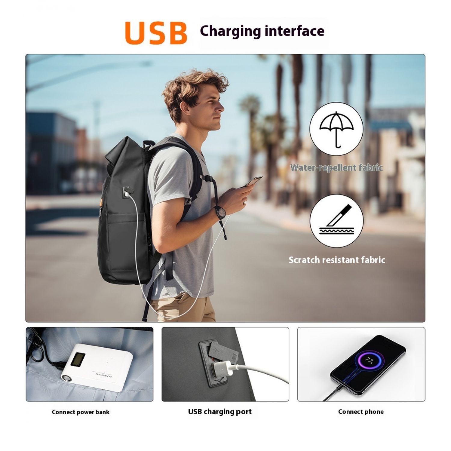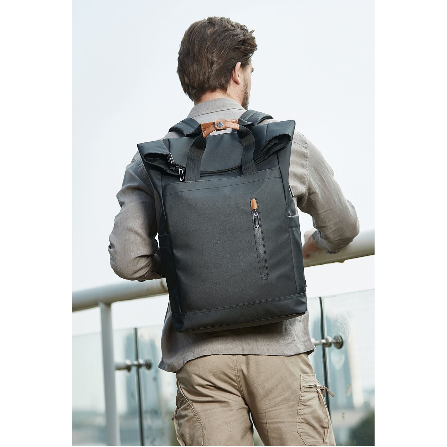 Men's Side Closure Leisure Commute Travel Curved Edge Backpack Black