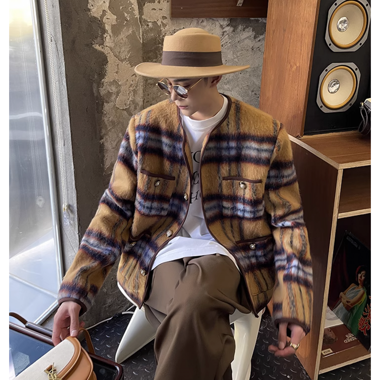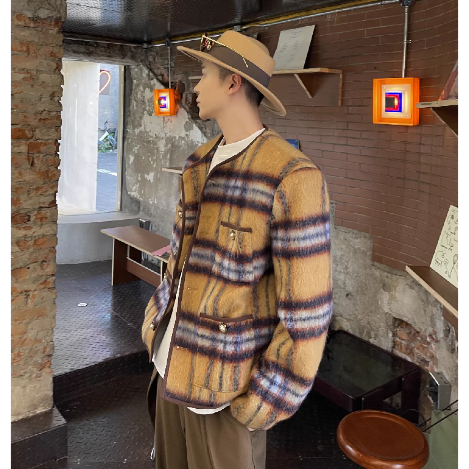 Mohair Plaid Vintage Long Woolen Collarless Jacket Yellow M