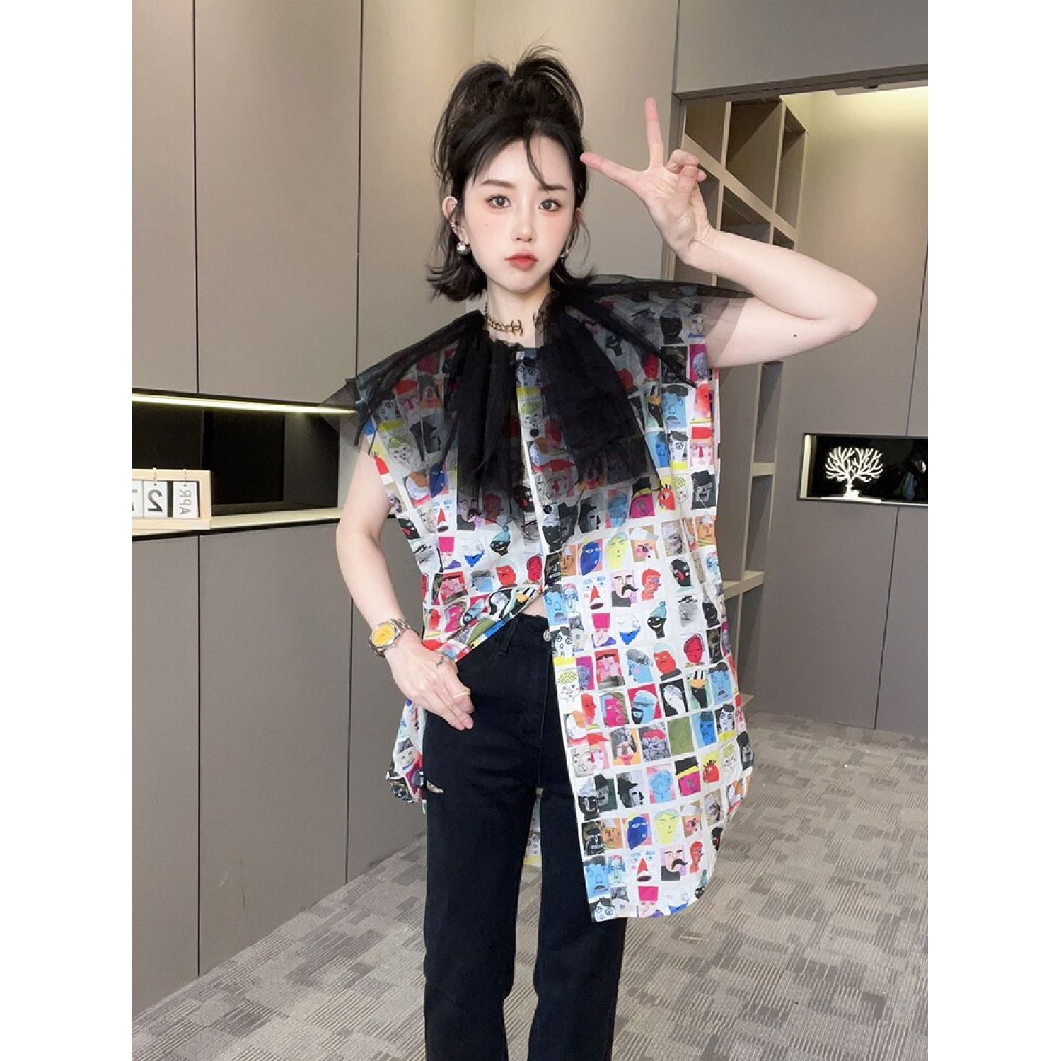 New Mid-length Cartoon Printed Mesh Patchwork Top Printing S