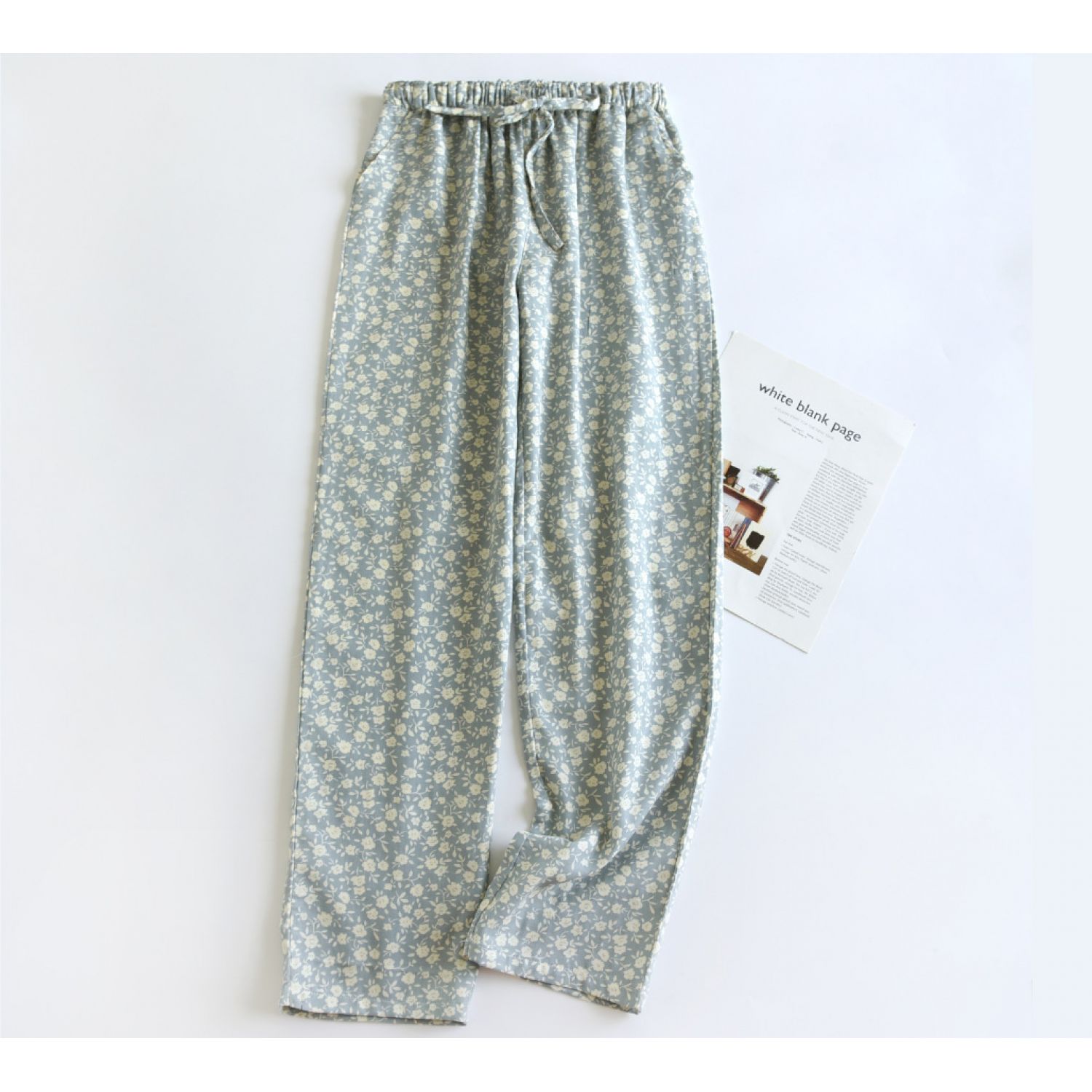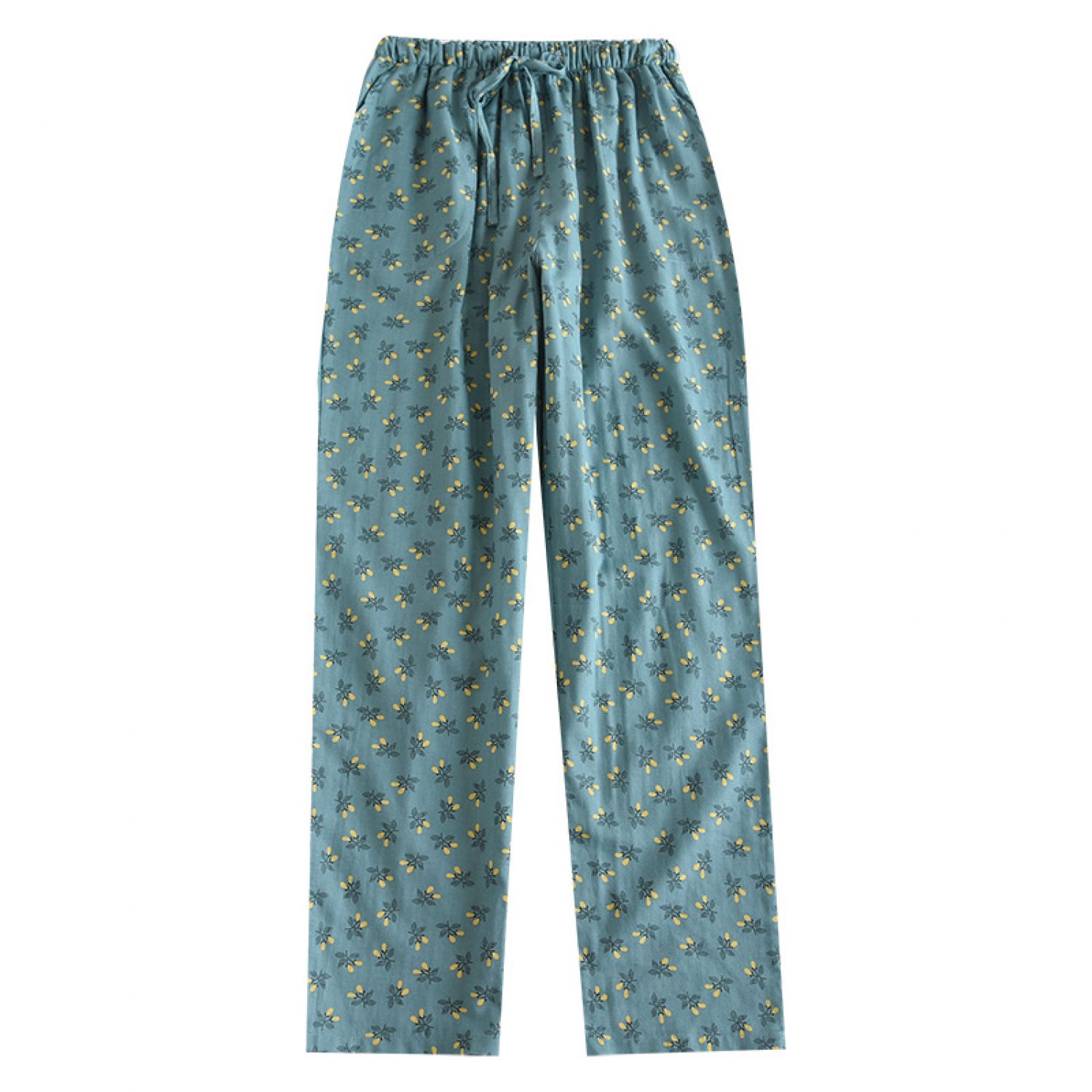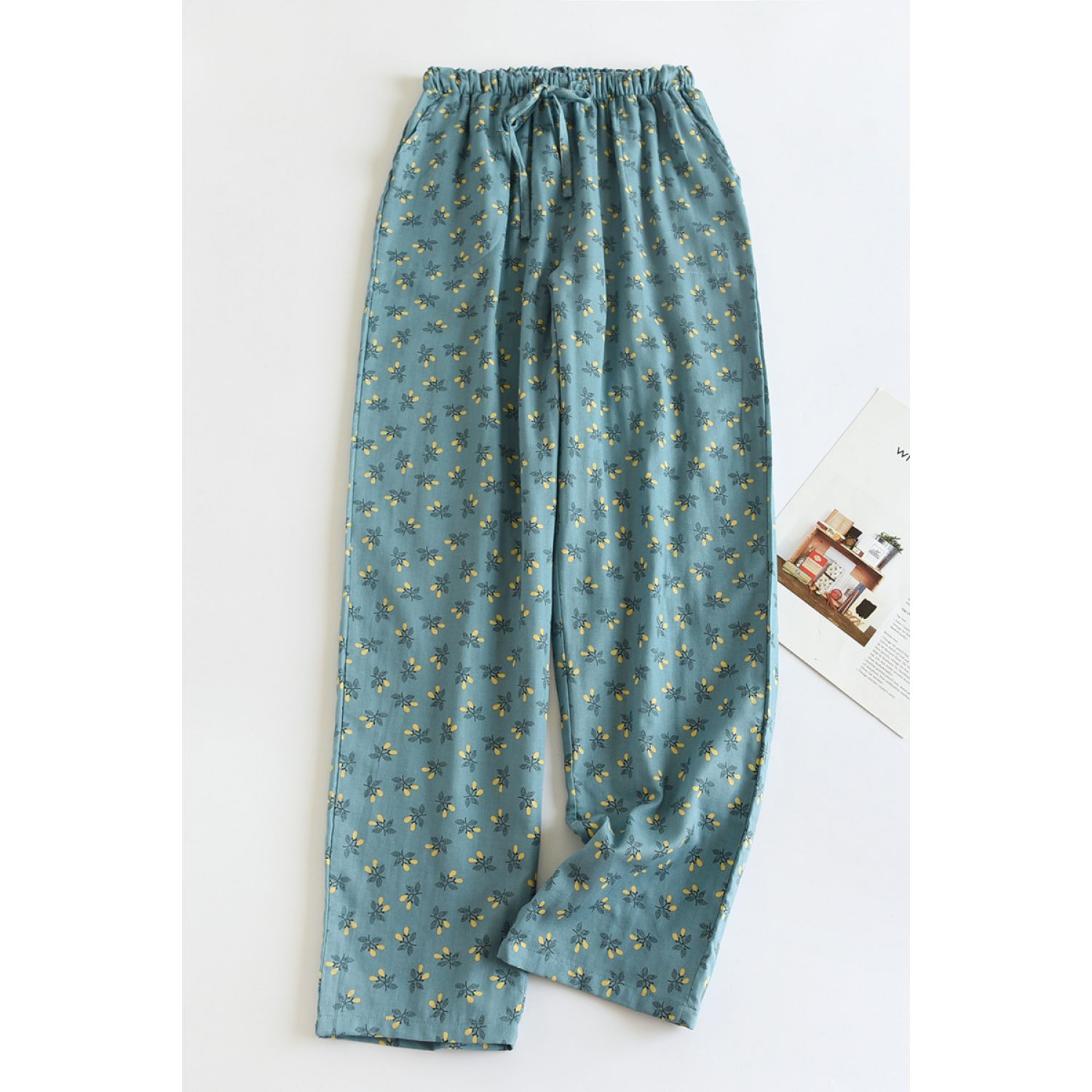 Color: dark blue fruitful gauze pajama pants, yellow fruitful gauze pajama pants, orange fruitful gauze pajama pants, Lisa Blue Flower gauze pajama pants, Lisa crushed flower gauze pajama pants