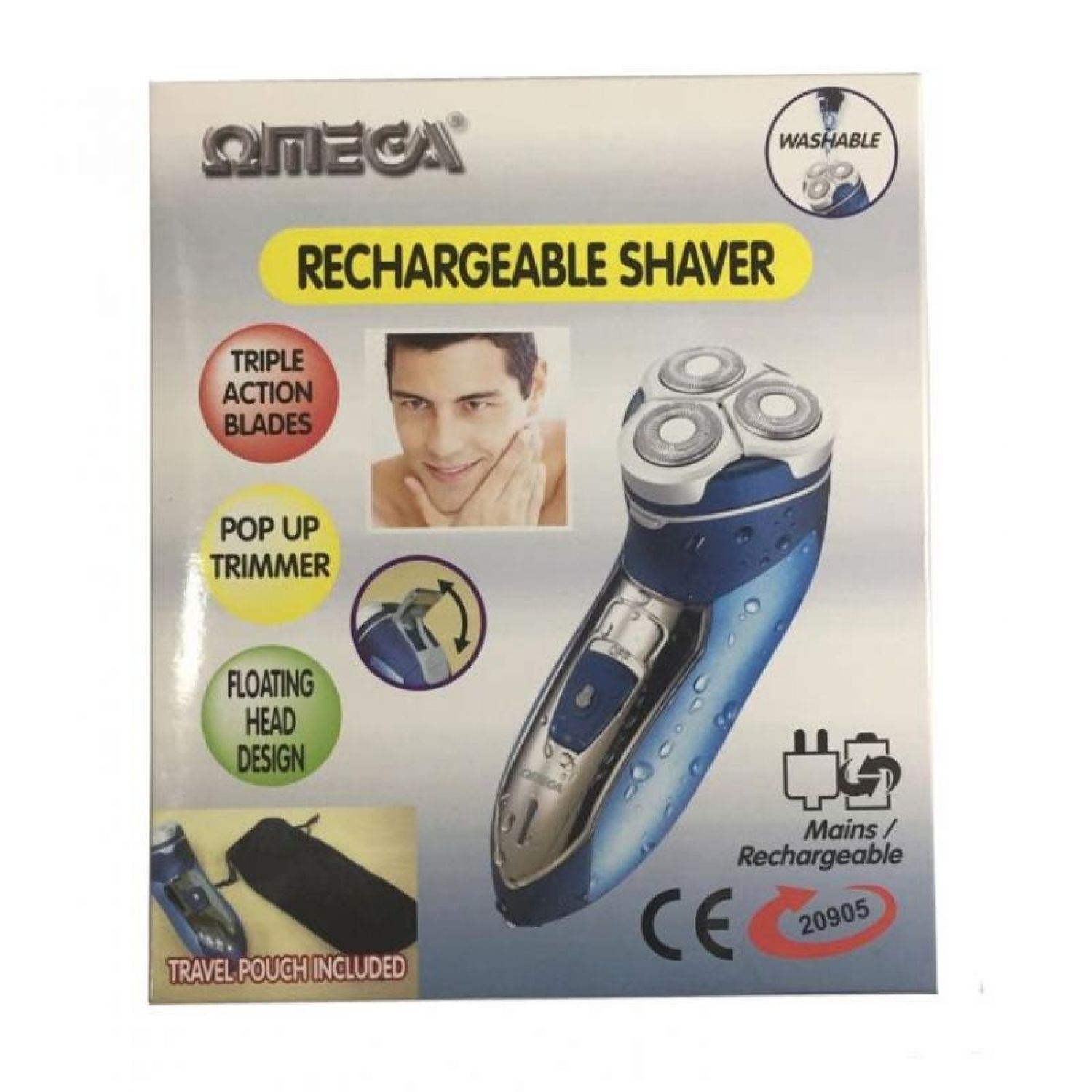 Omega Rechargeable Shaver. Triple Action Washable Blades (Not waterproof). Mains / Rechargeable Operation, with a travel pouch. Features: