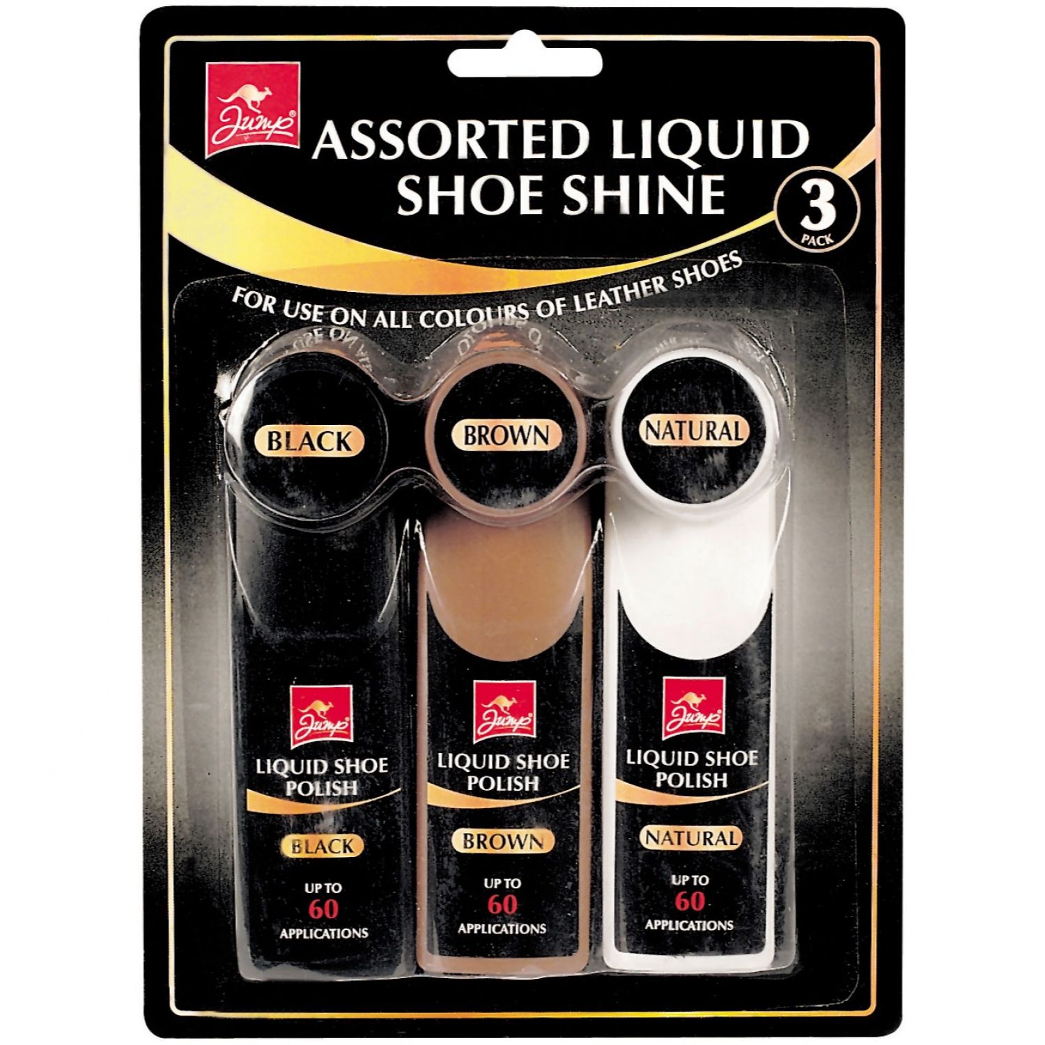These Assorted Jump Liquid Shoe Shine designed for use on leather shoes which come in three different colours.