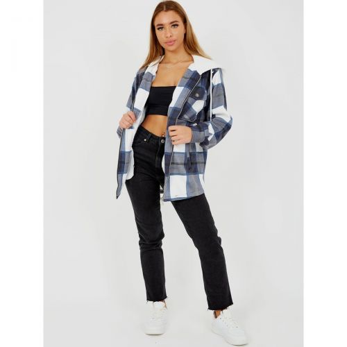 Women's Thick Checked Shirt Shacket With Zip & Hooded Jacket - Navy