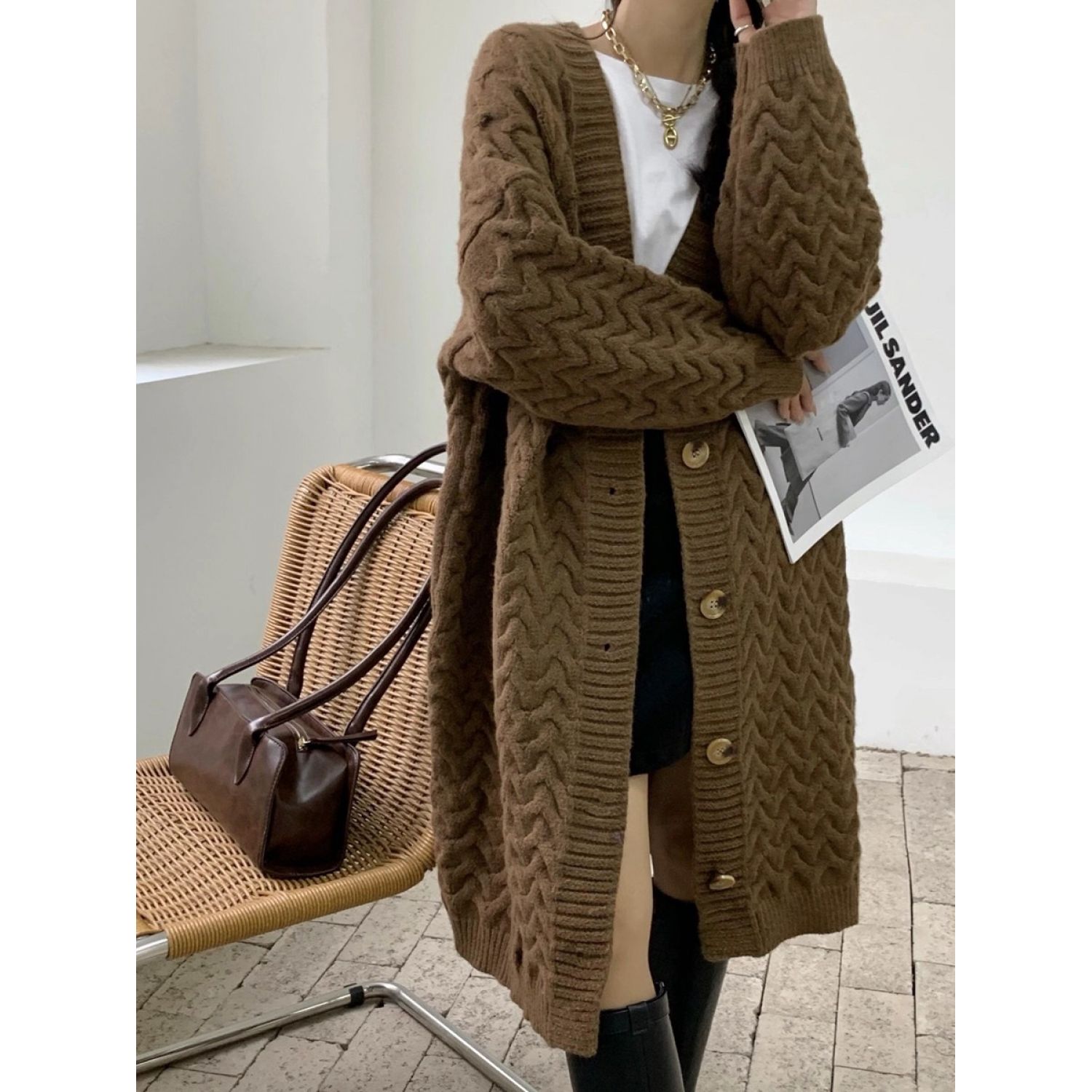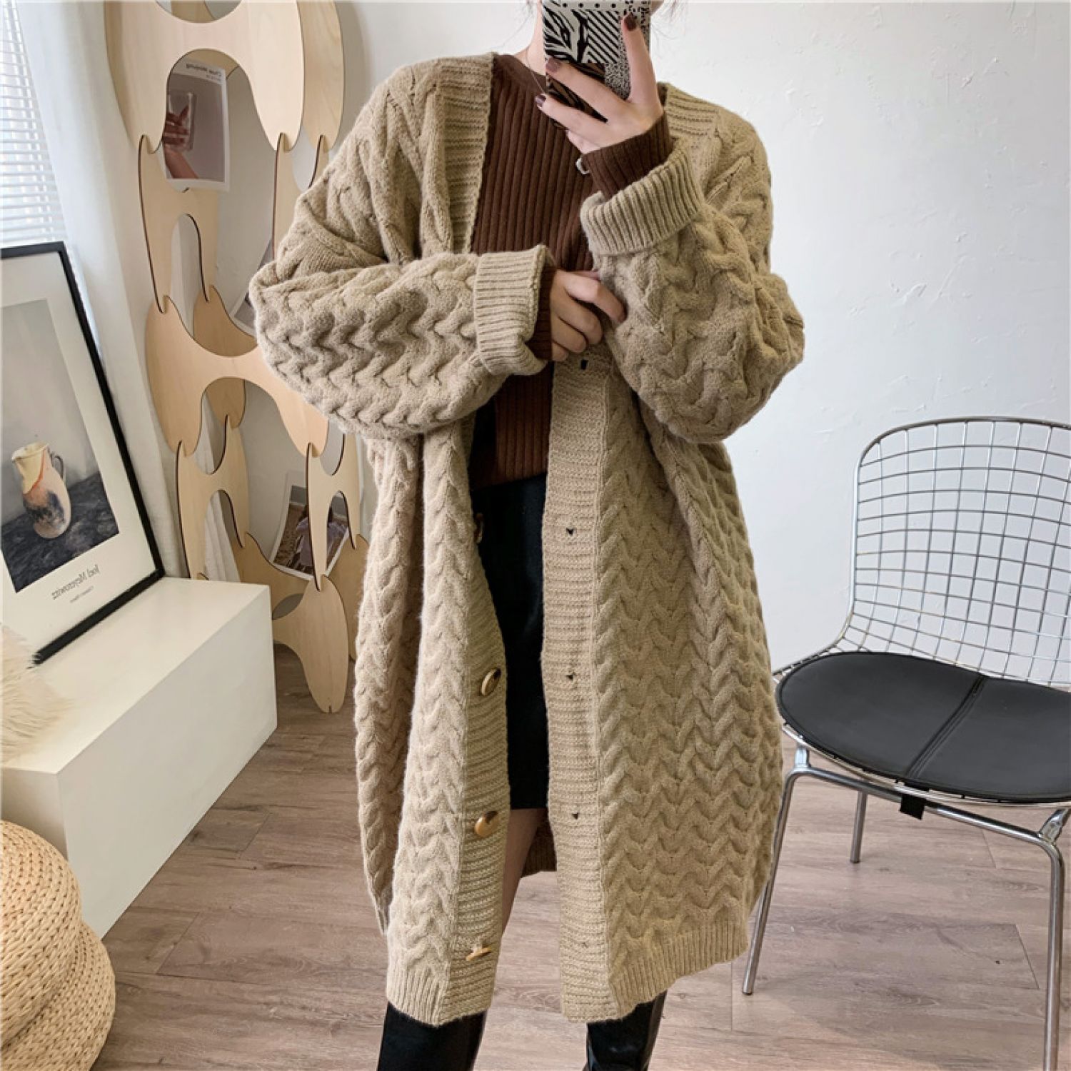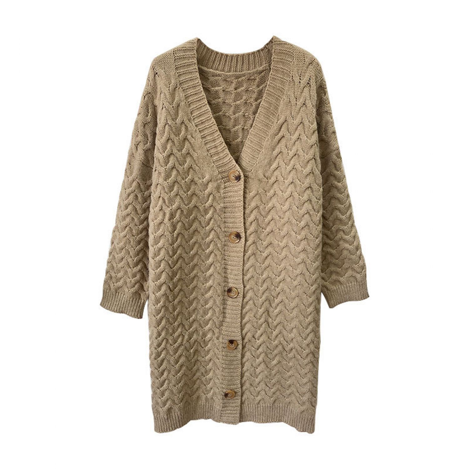 Retro Twist New Loose Large Version Lazy Style Long Thick Knitted Cardigan Khaki One size