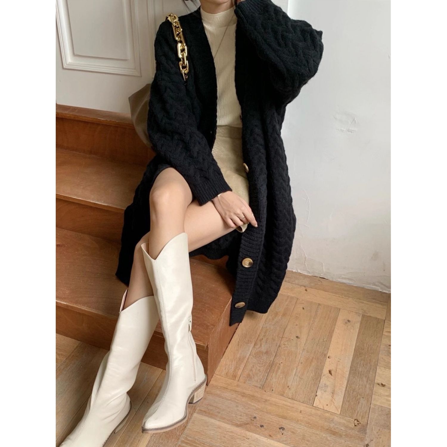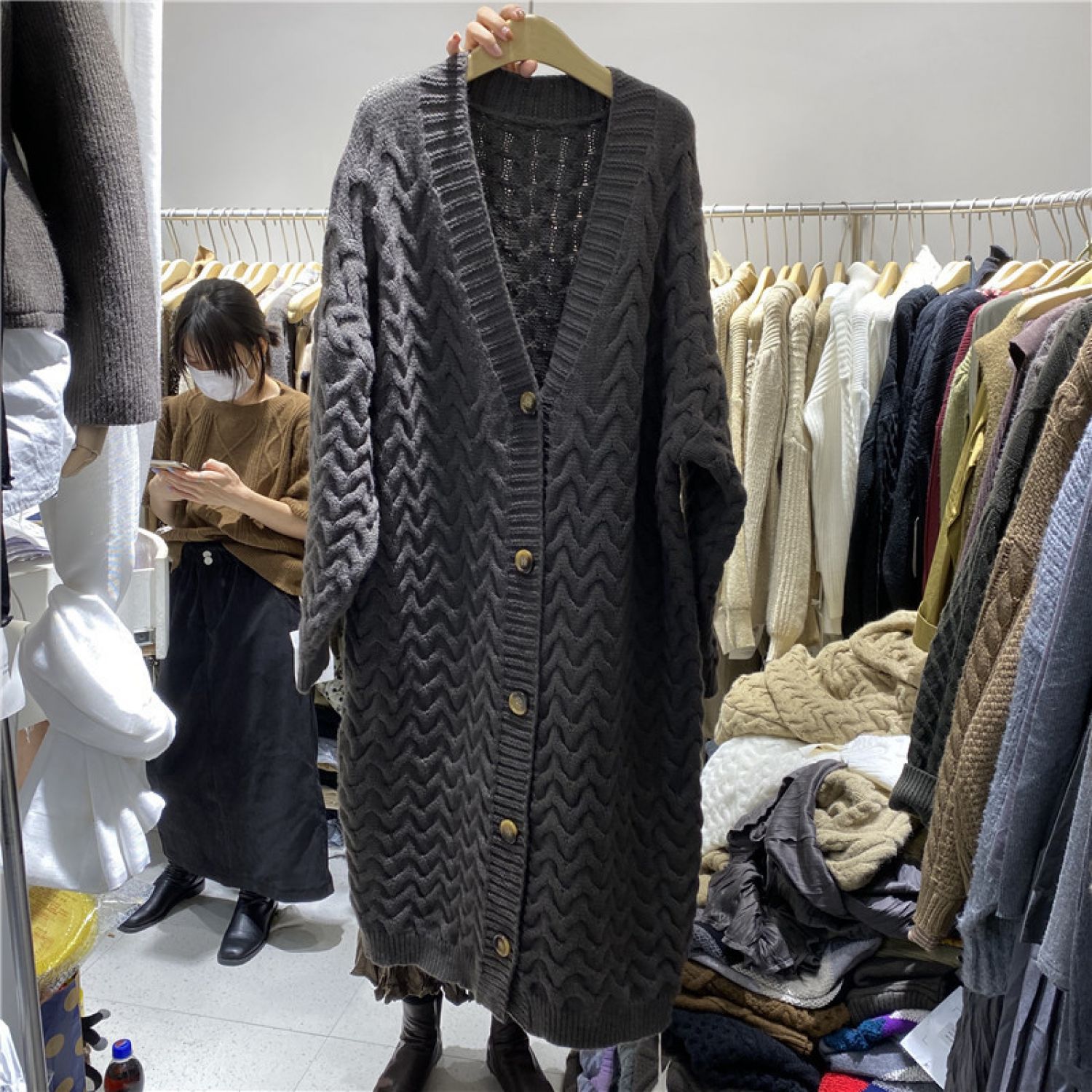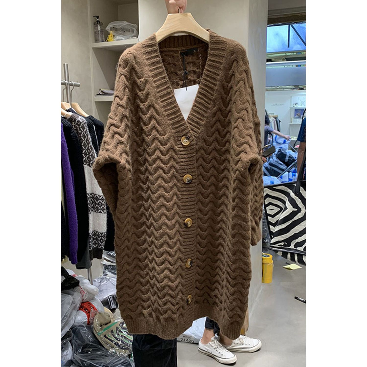 Retro Twist New Loose Large Version Lazy Style Long Thick Knitted Cardigan Khaki One size