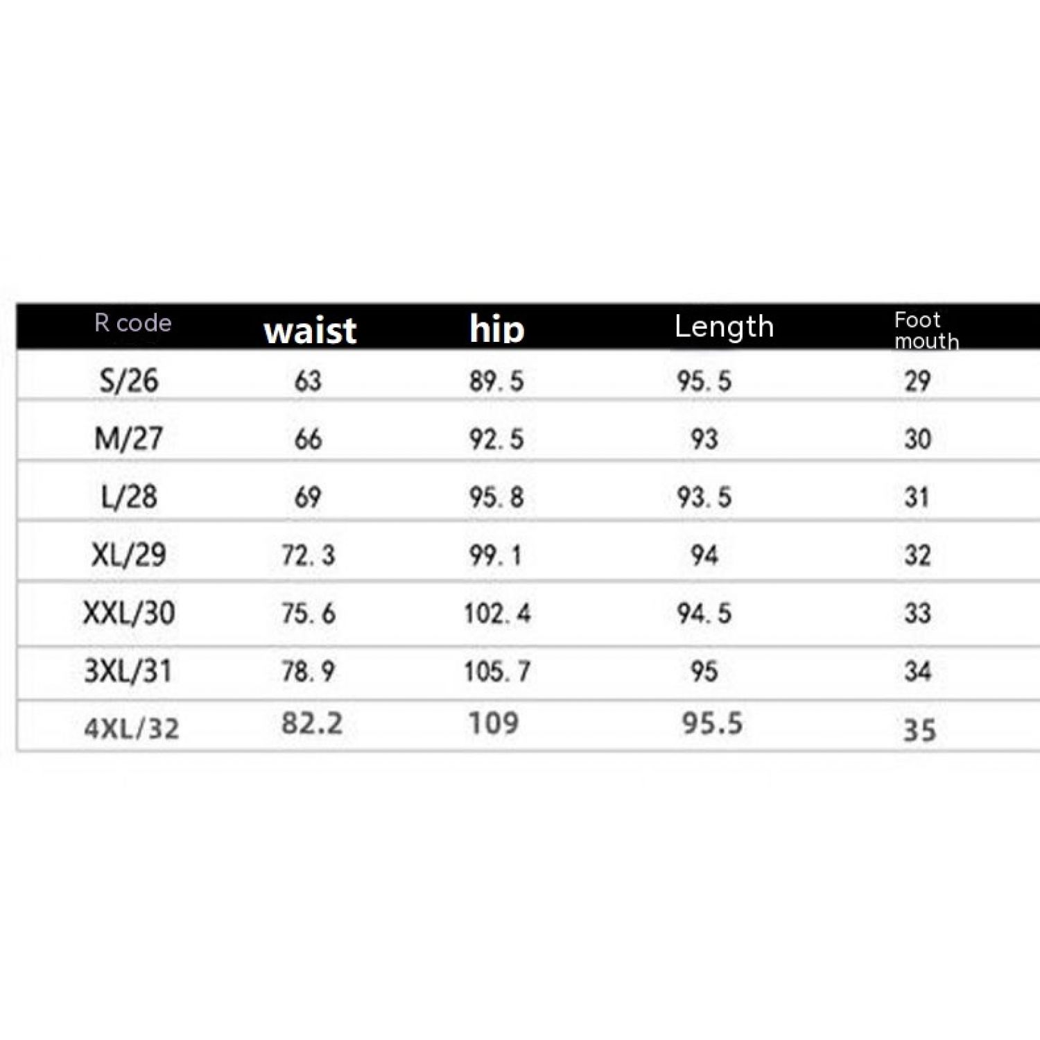 Size: 26 below 95kg, 27 48.00 kg-52.50 kg, 28 106-115kg, 29 116-125kg, 30 126-135kg, 31 136-145kg, 32 146-155kg