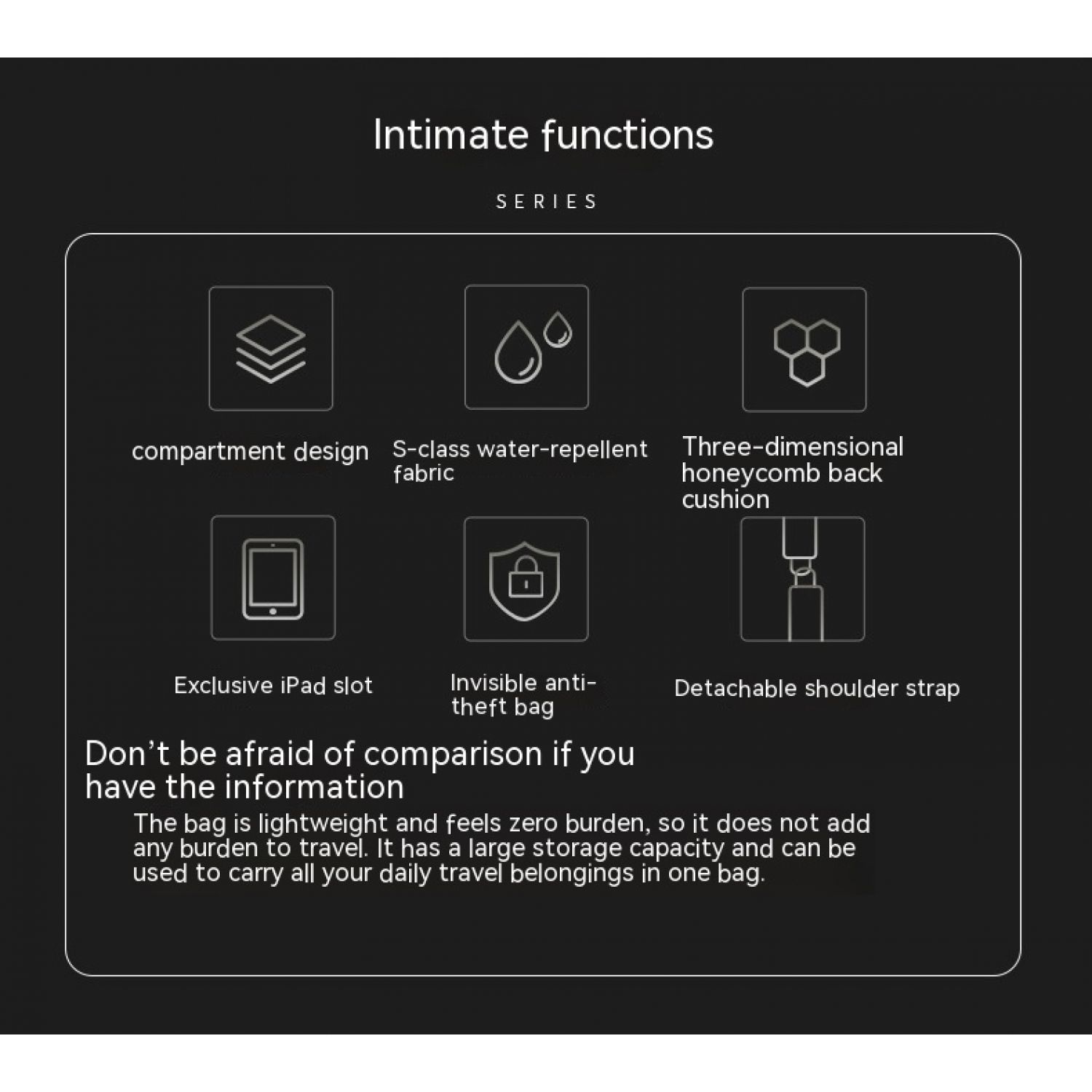 Function: breathable, waterproof, wear-resistant, burden-reducing, storage