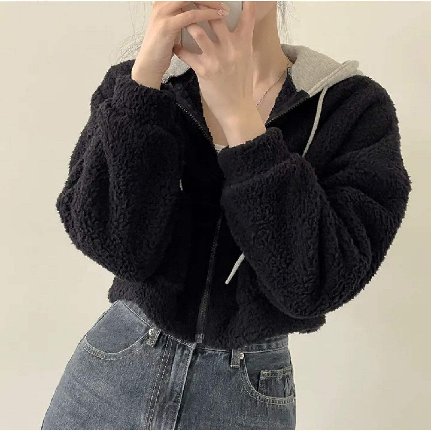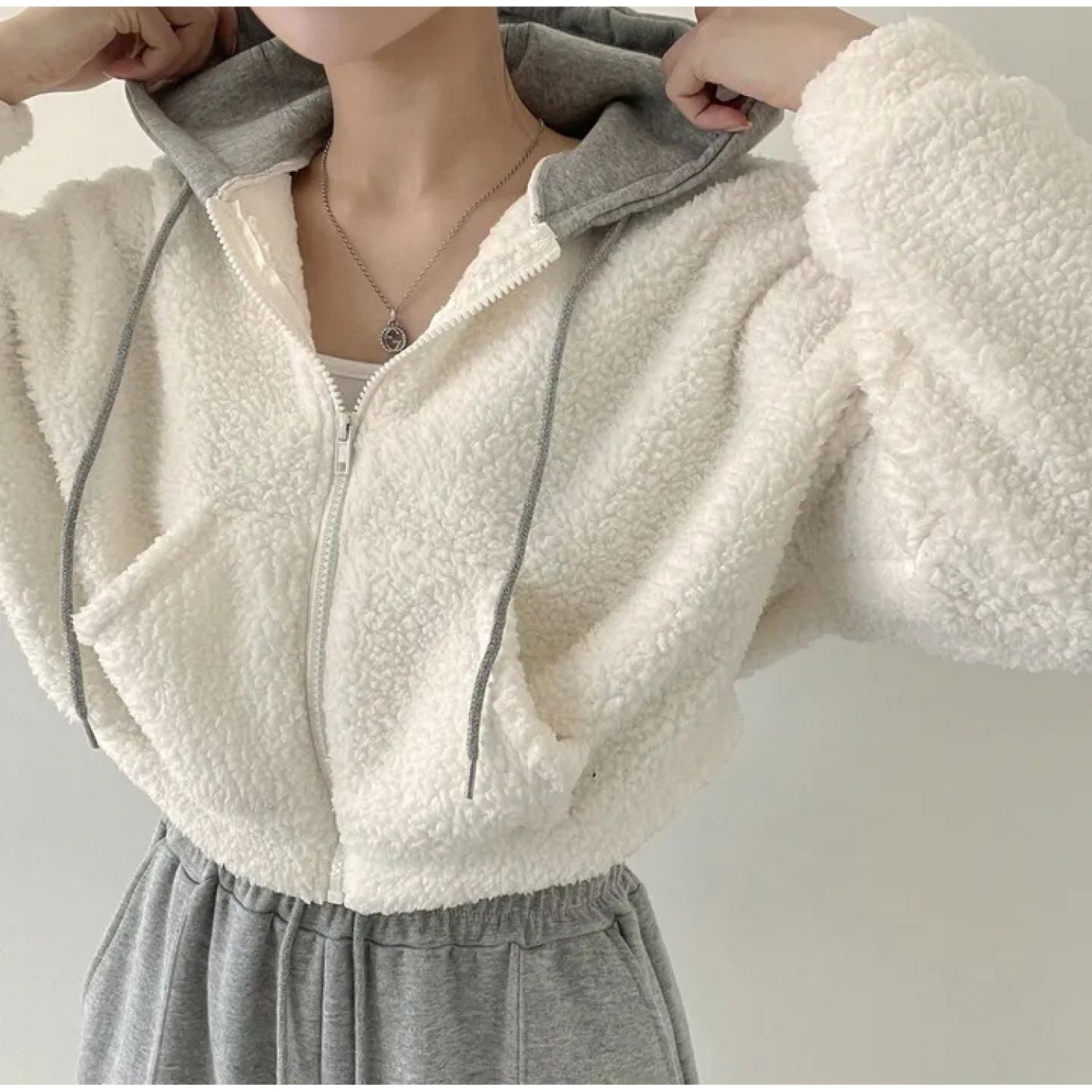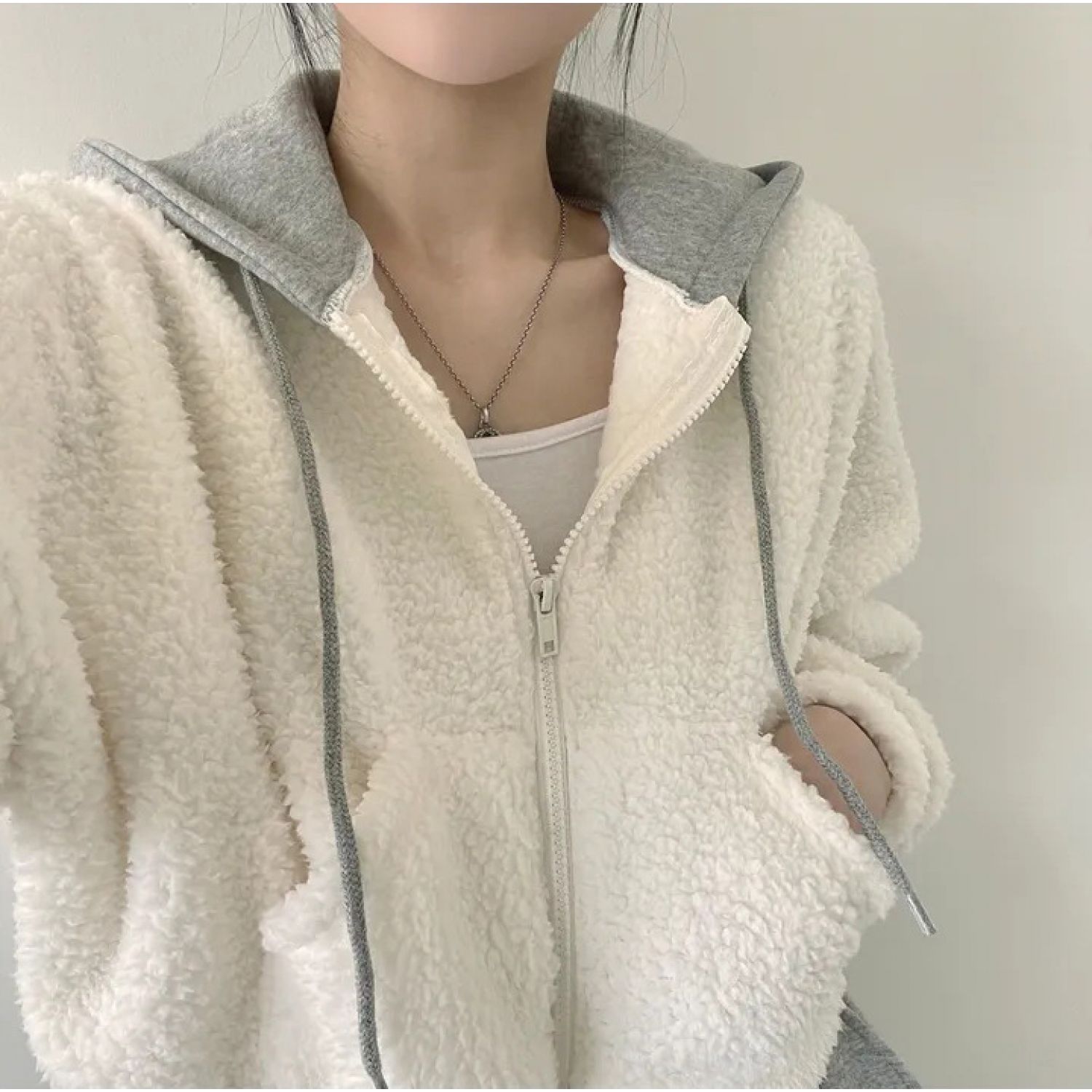 Warm Leisure Sports Loose Lamb Fur Hooded Pocket Small Plush Coat Beige S
