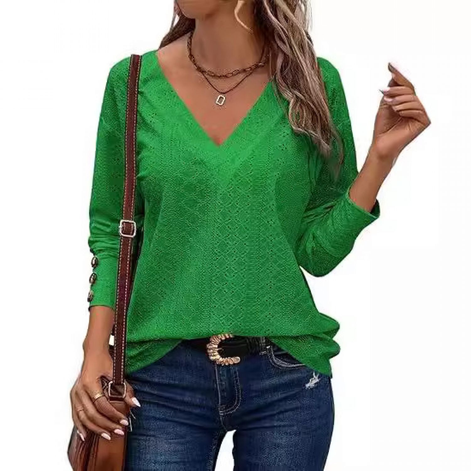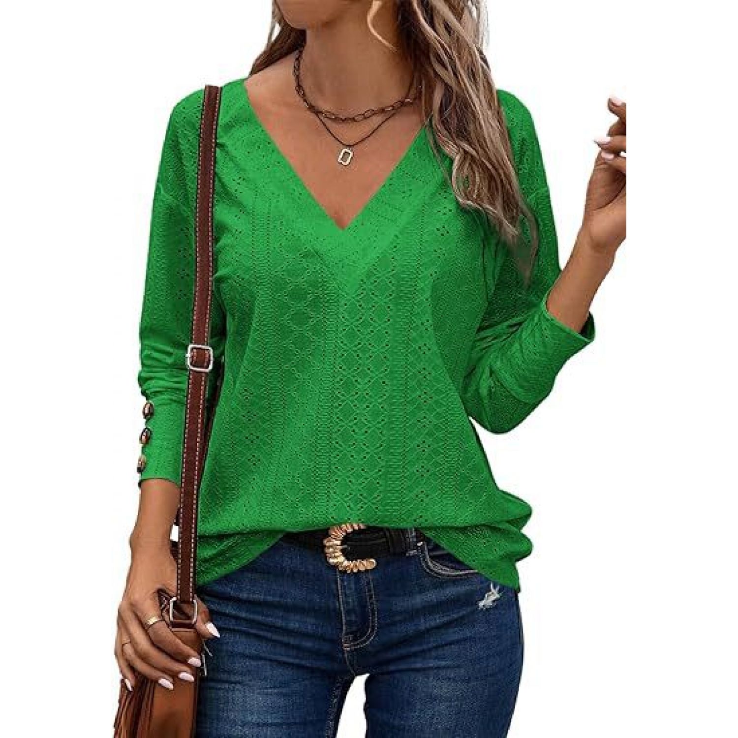 Women's Casual V-neck Long Sleeved Lace Embroidered Shirt White S