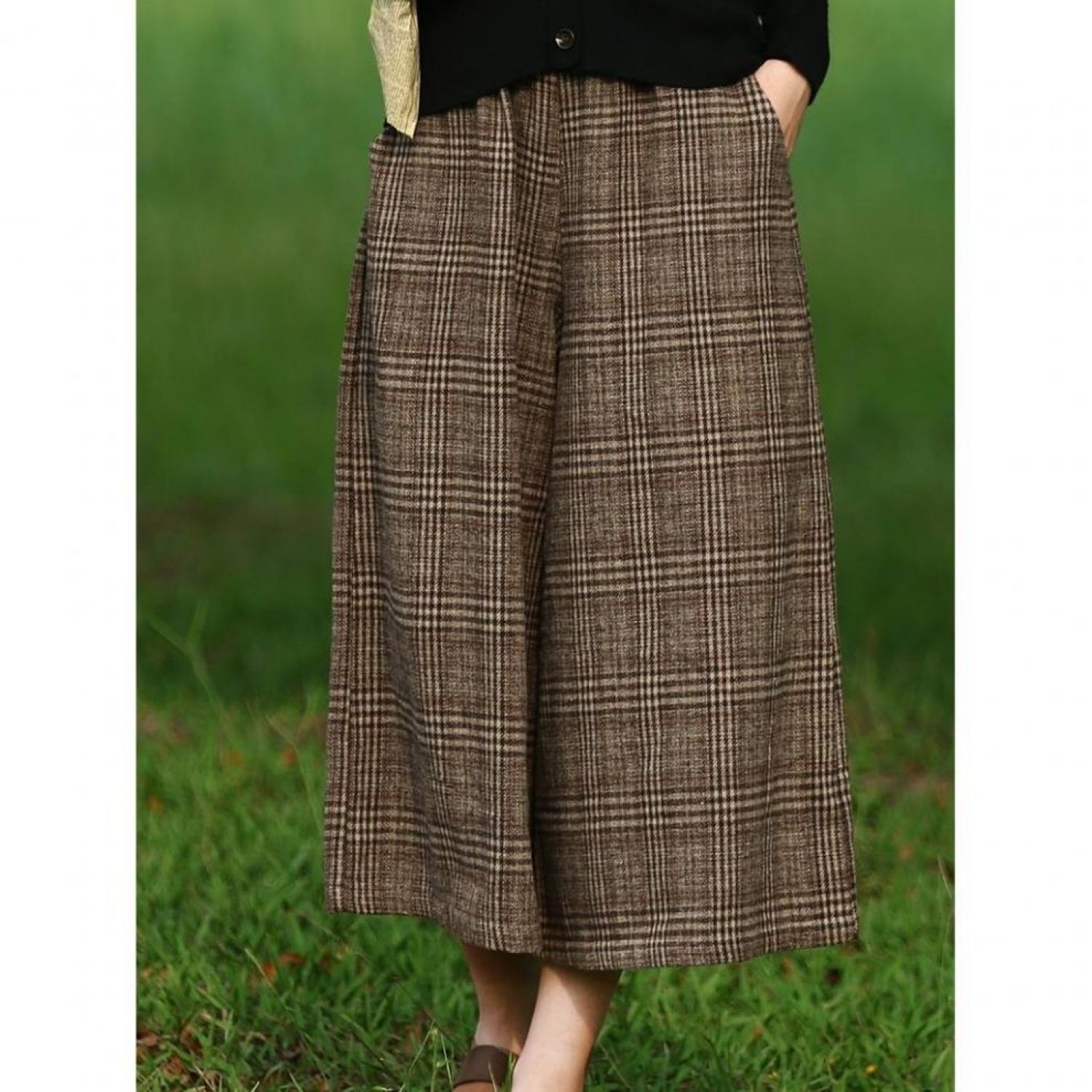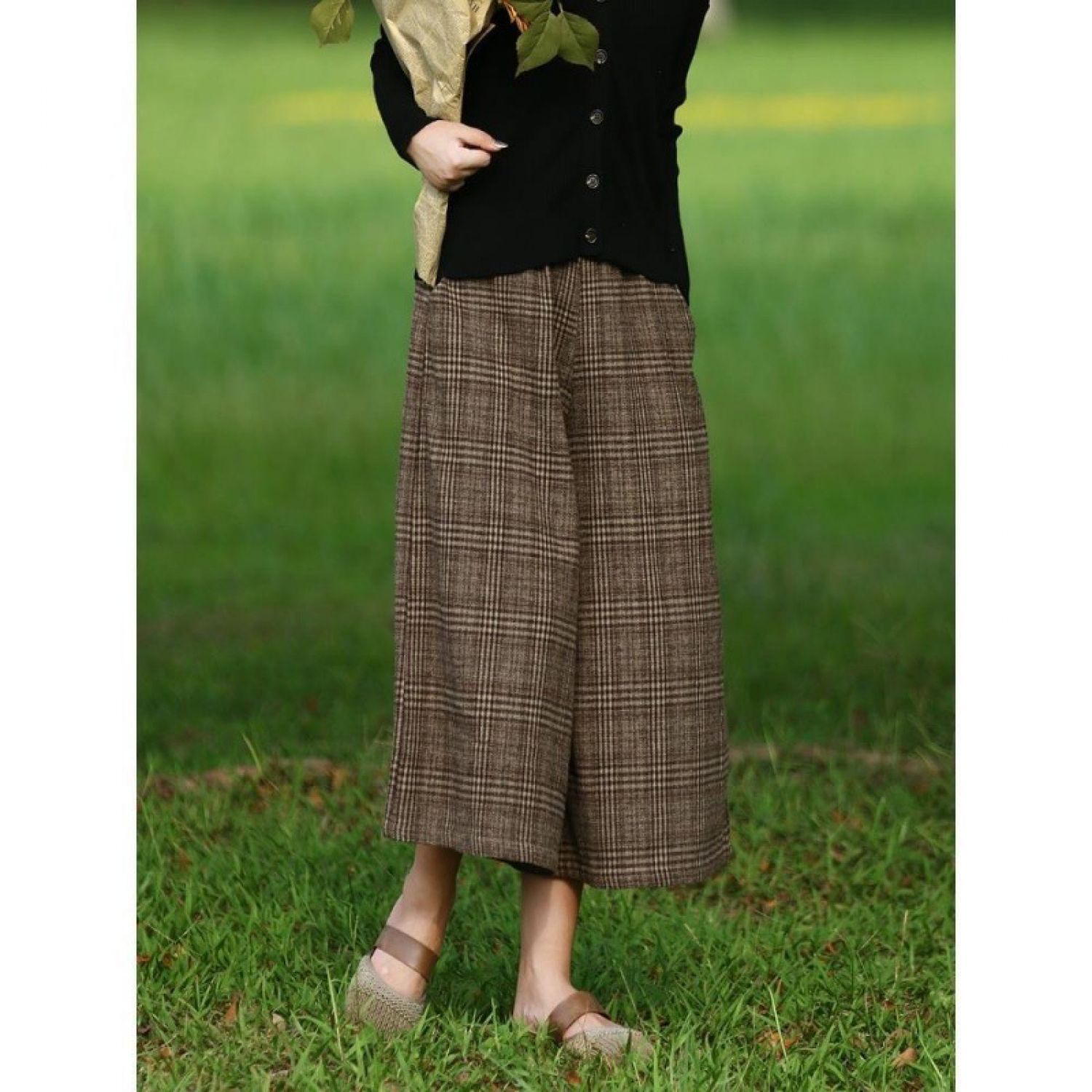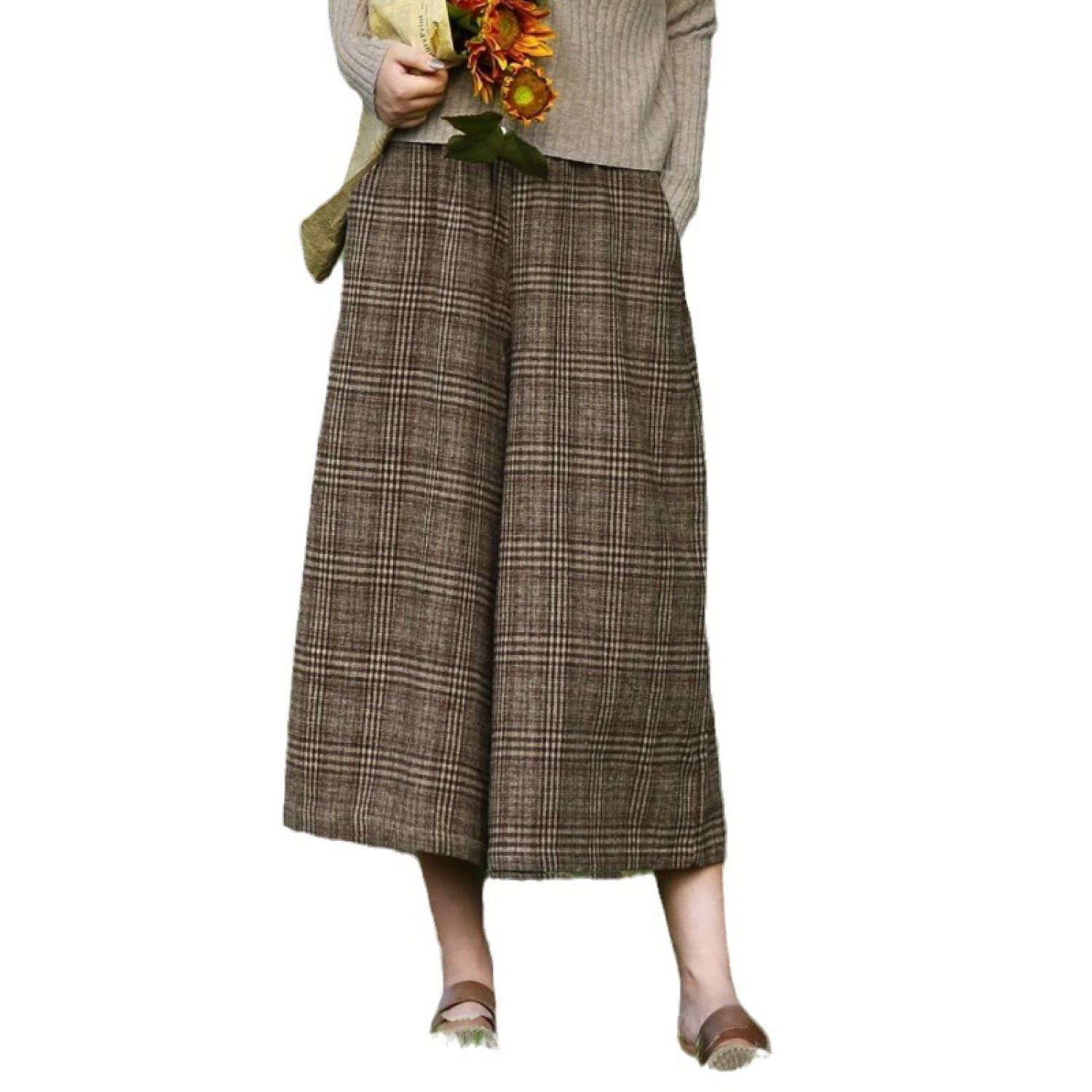 Women's Western Style Checkered Slim Fit Casual Cropped Wide Leg Pants Gray Free Size