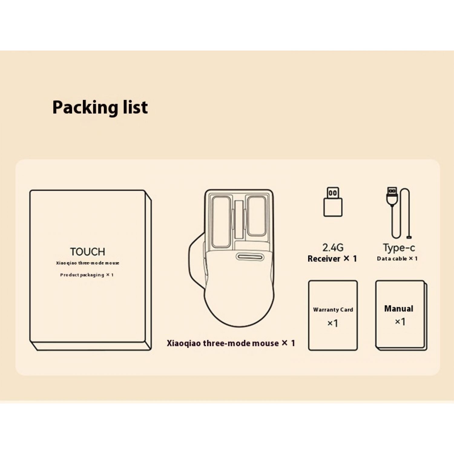 Receiver x1 Warranty Card x1 Type-C data cable x1 Instruction manual x1 Small tilt the third mock examination mouse x1