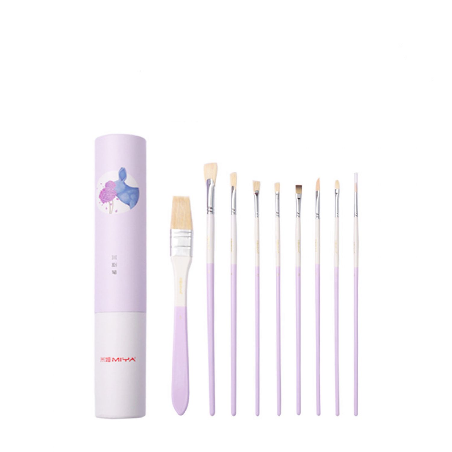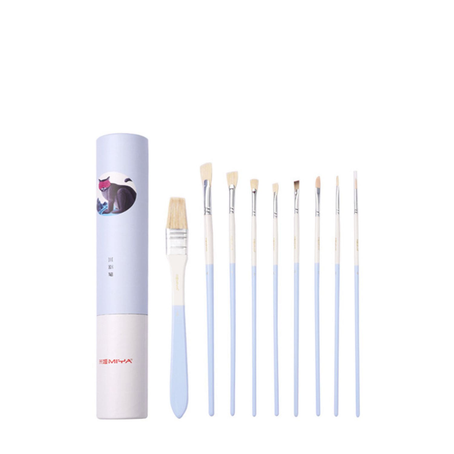 1 wide brush, 1 nylon gouache, 1 eyeliner brush, 1 chalk, 1 corner brush, 4 fan-shaped brushes.