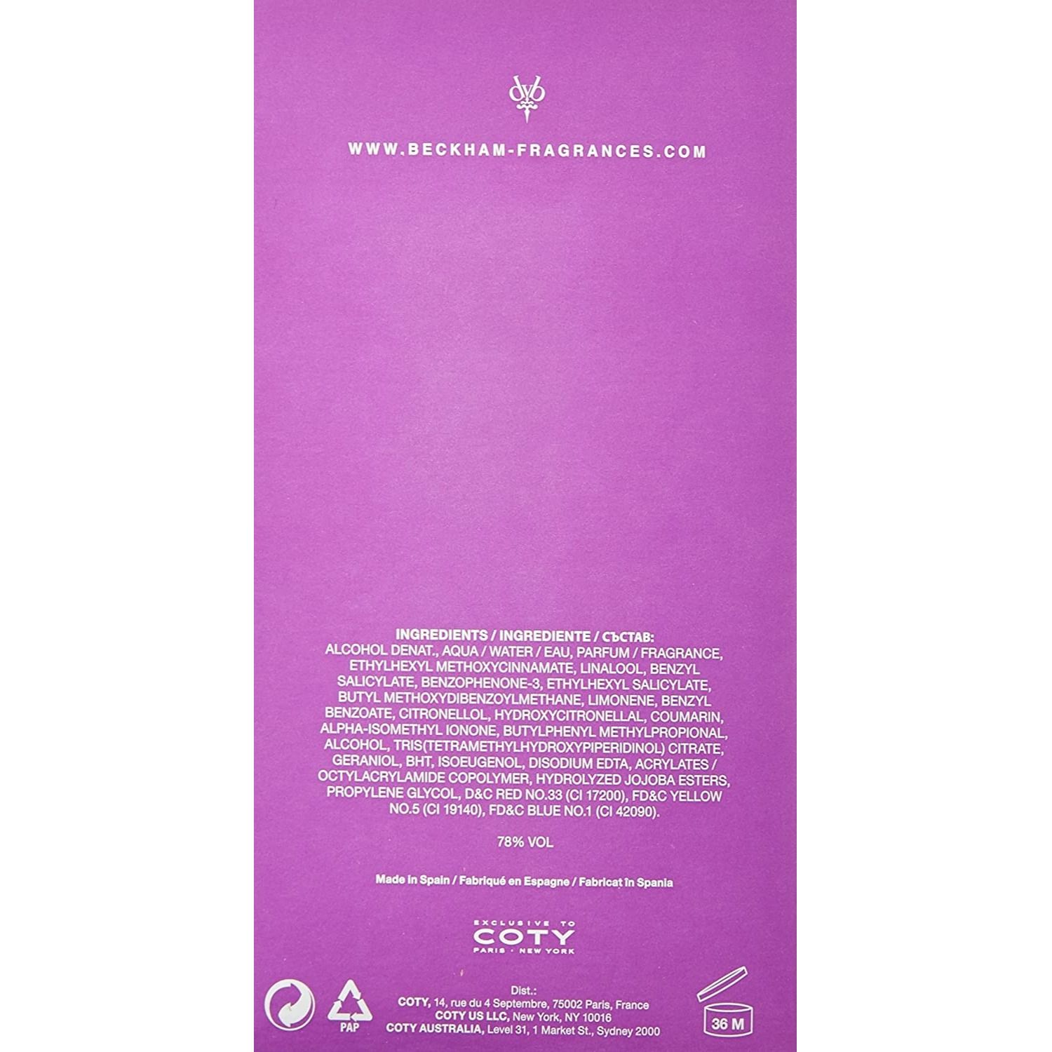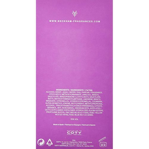 This Beckham Signature is a scent of full seduction and feminity which has sweet notes of anise flower and candy apple that invite and entice. A floral heart of orchid and heliotrope warmed with soft vanilla. The scent settles on a soft but sophisticated base of patchouli, amber and musk.