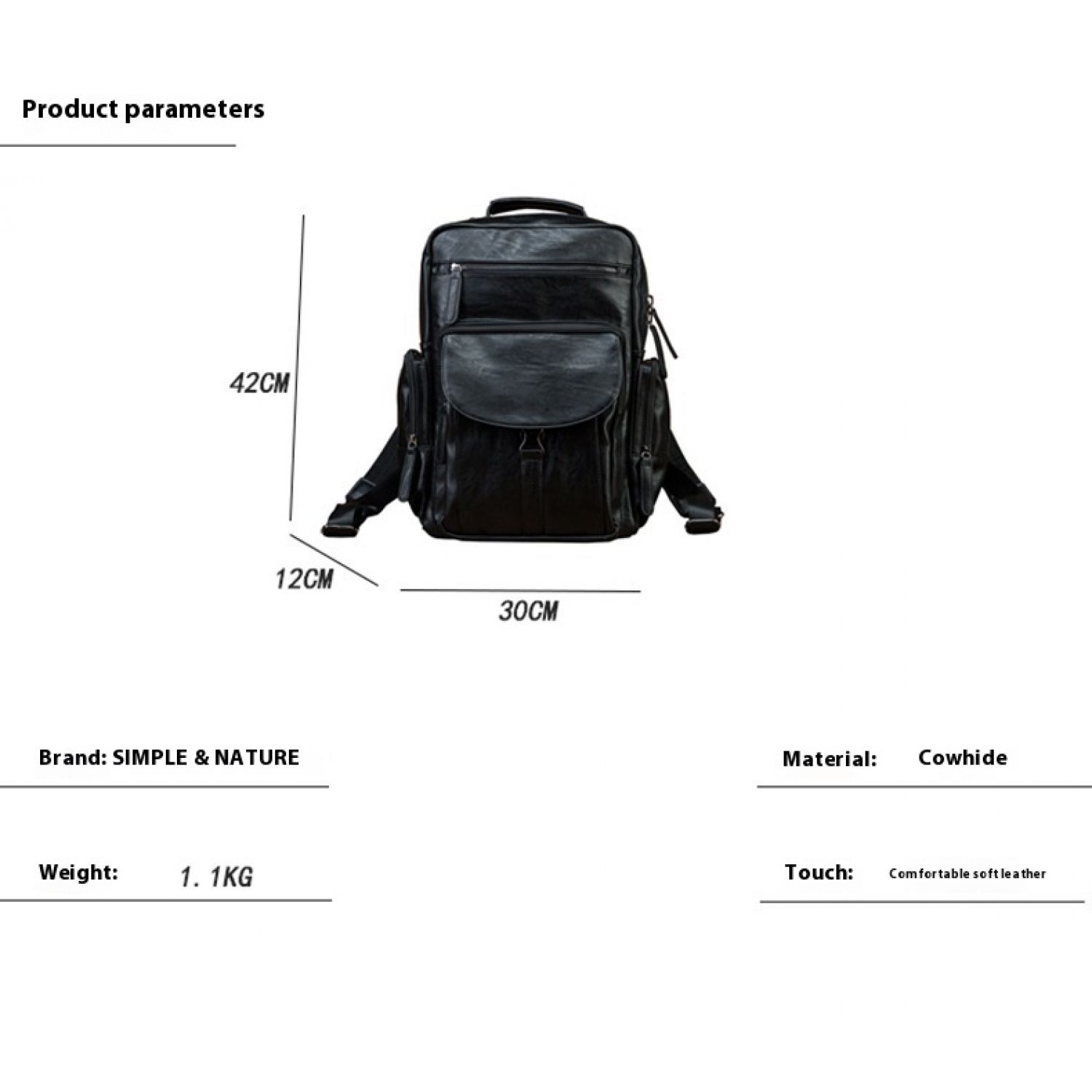 Casual Cowhide Large Capacity Backpack Men's Dermal Leather Men's Backpack Schoolbag Fashion Black 30x12x42cm