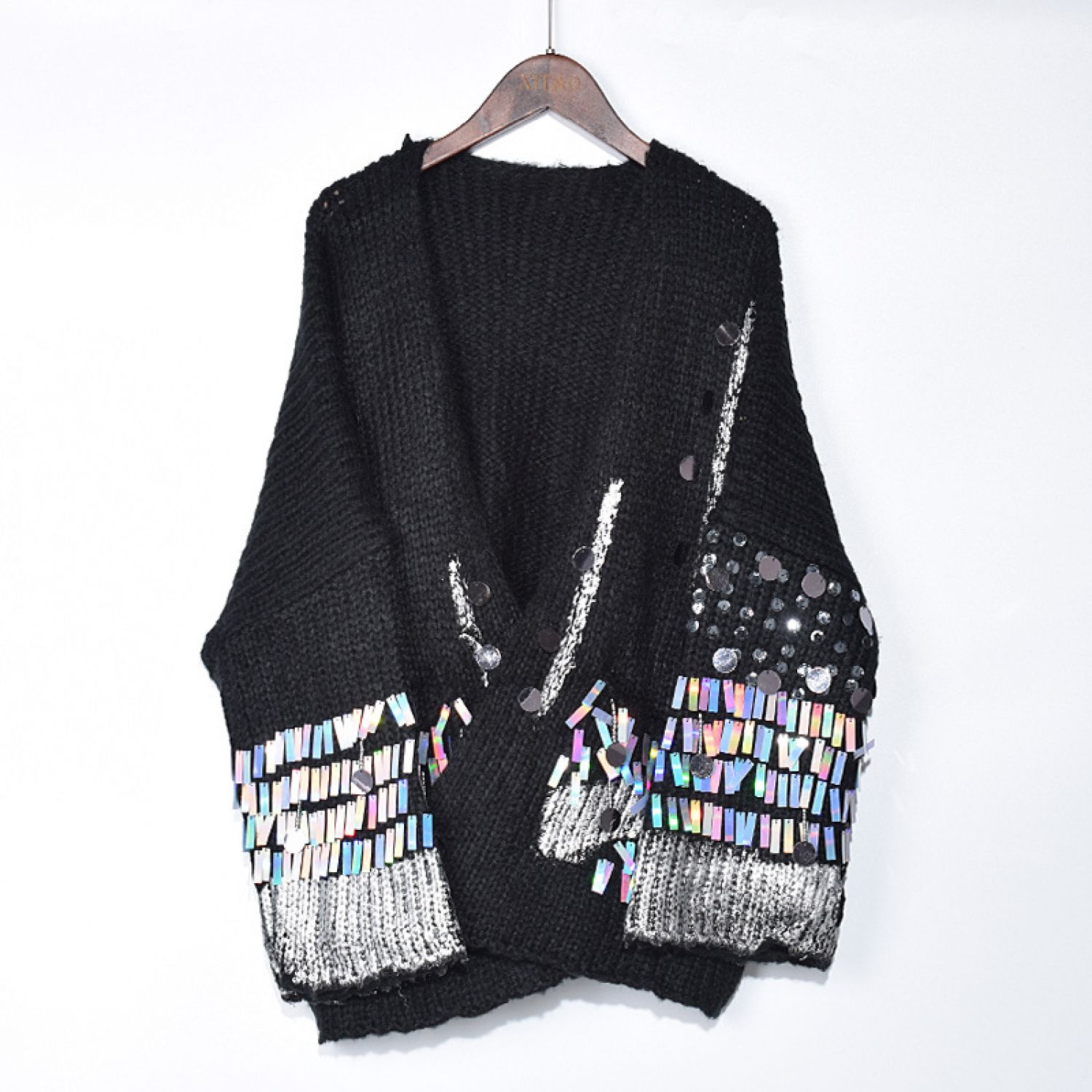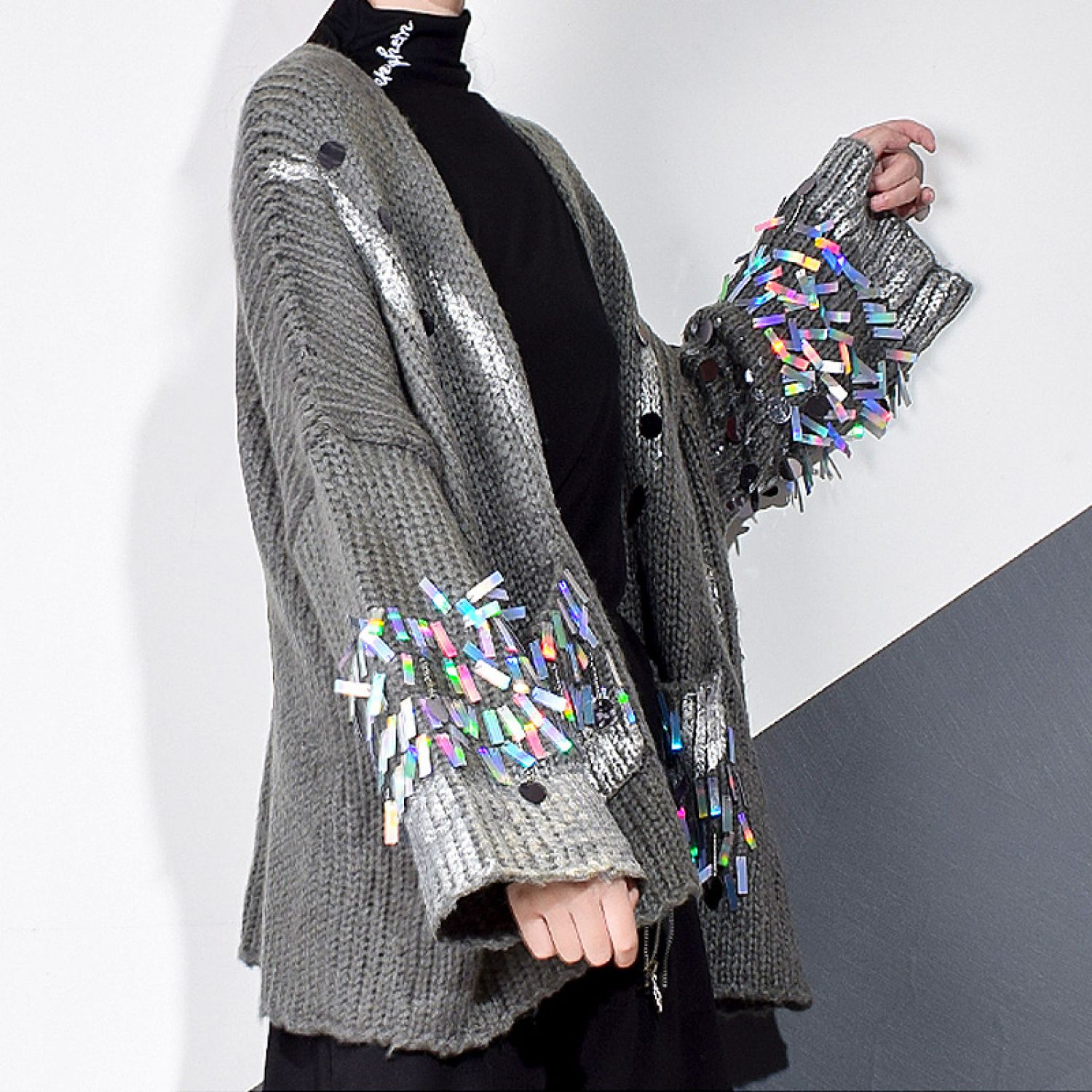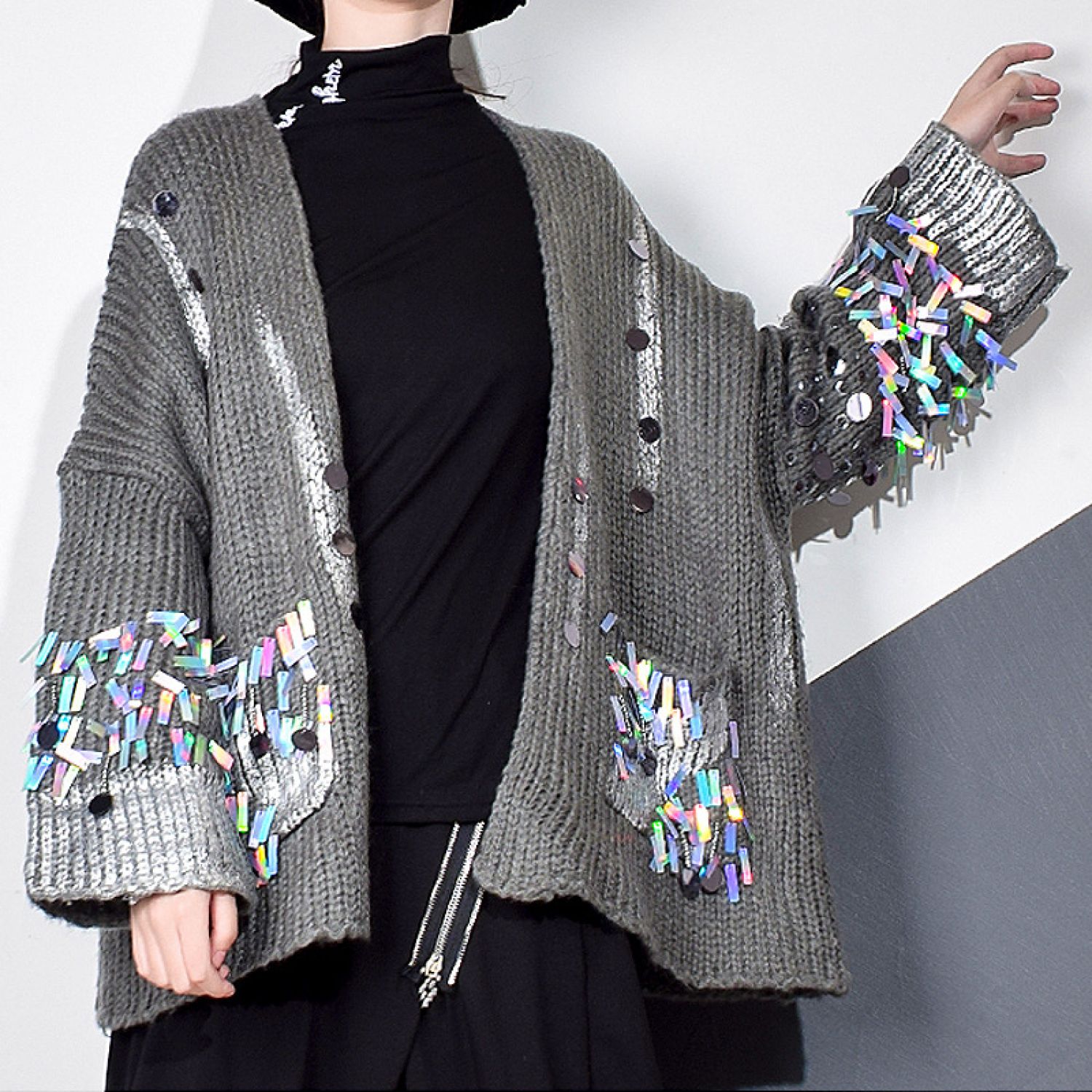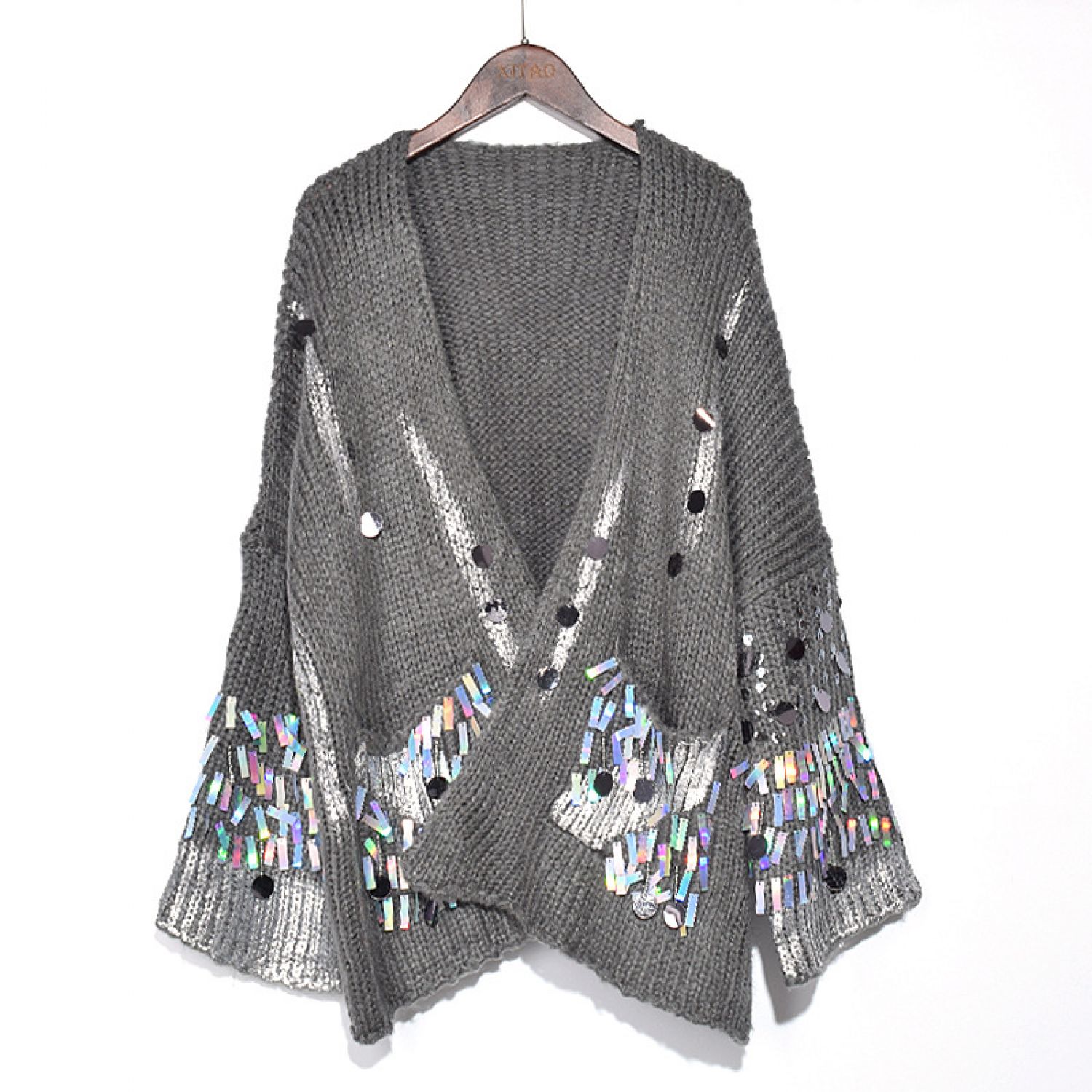 Casual Patchwork Sequined Sweater For Women Gray Average Size
