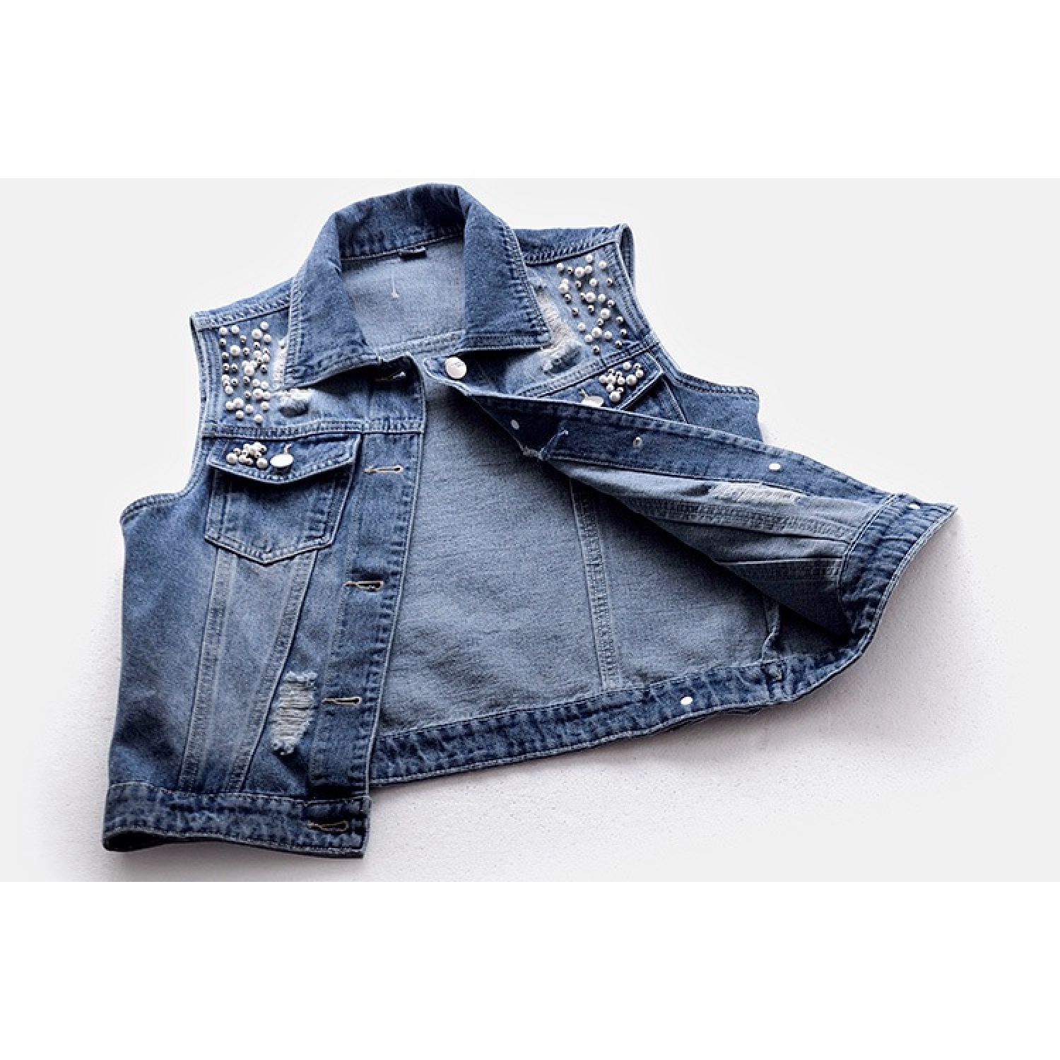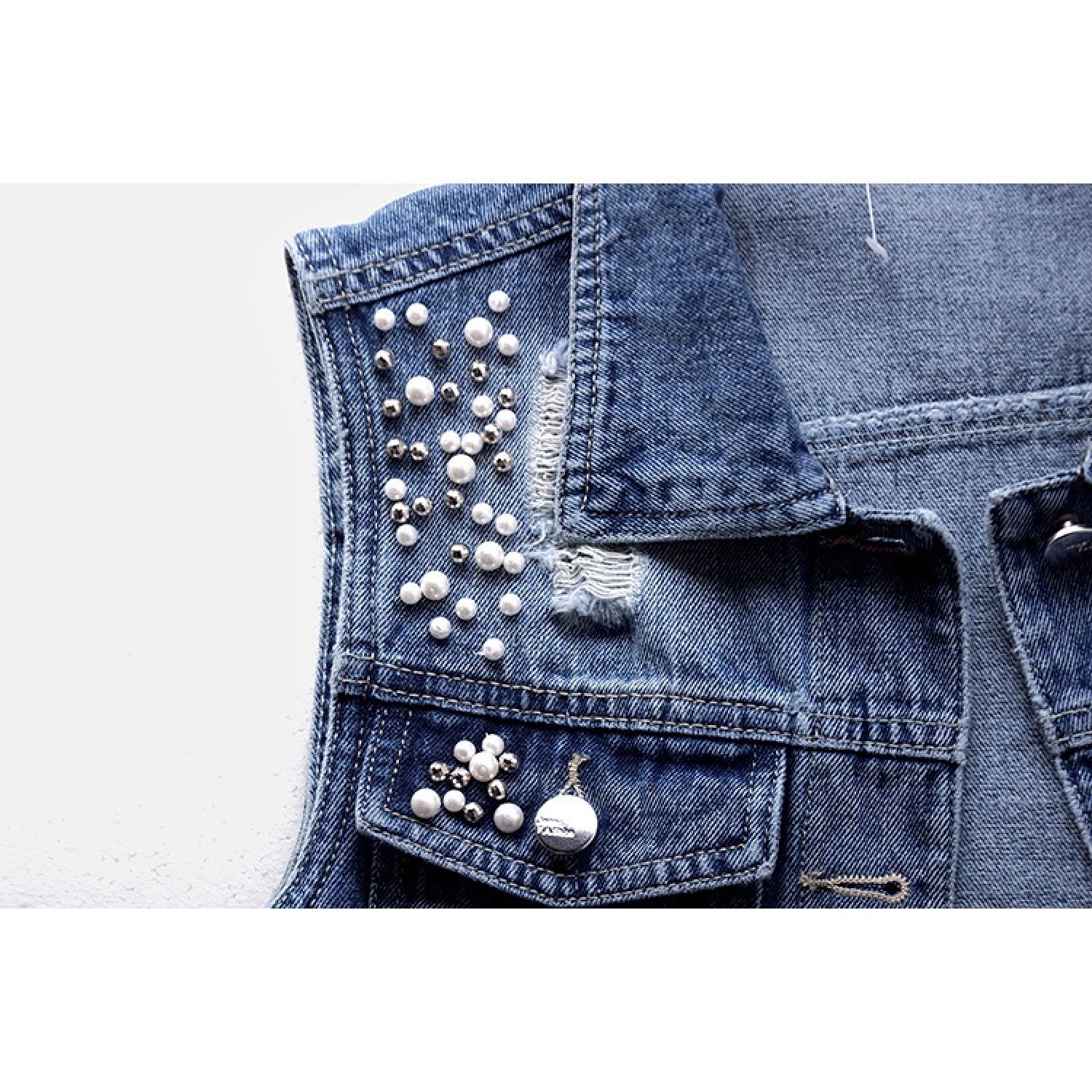 Denim Vest Women's Short Hole Beaded Sleeveless Blue S