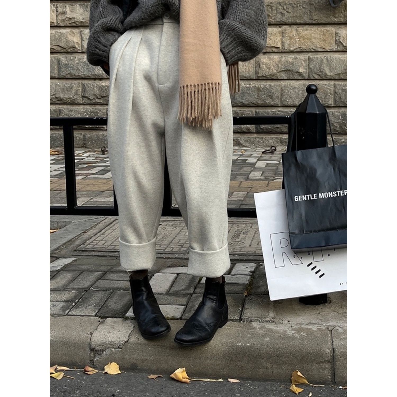 Draping Effect Harem Pants Loose Wool Suit Pants Casual Pants Cropped Pants Oats S