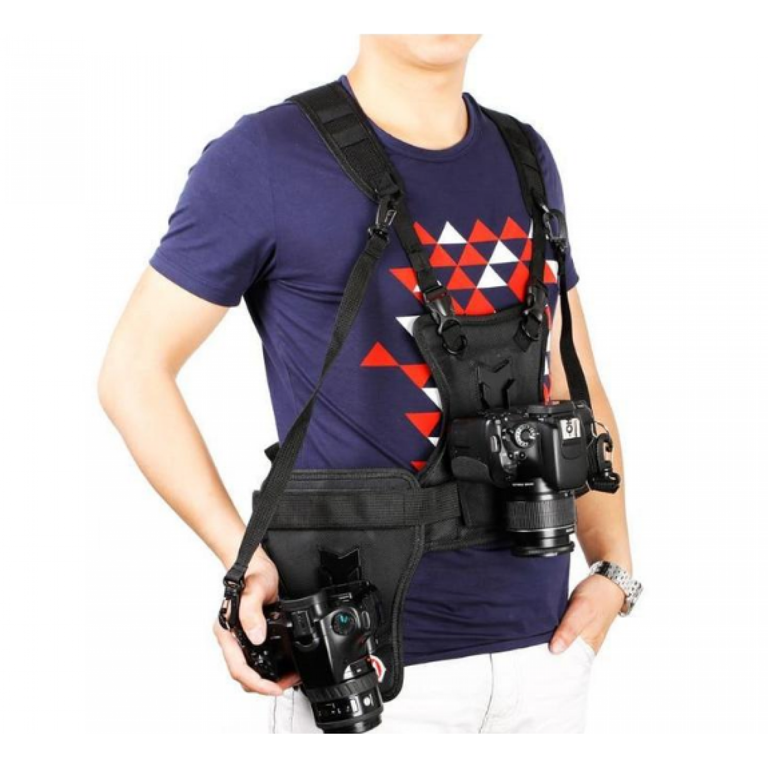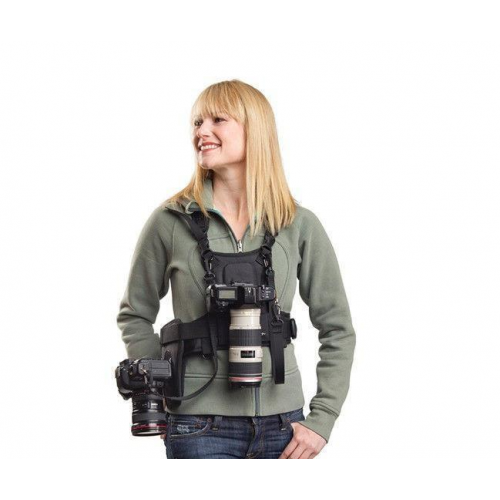 It’s a unique chest harness system that supports 1 or 2 cameras eliminating the neck strain usually associated with shooting long jobs such as weddings, sports, public relations and photojournalism.