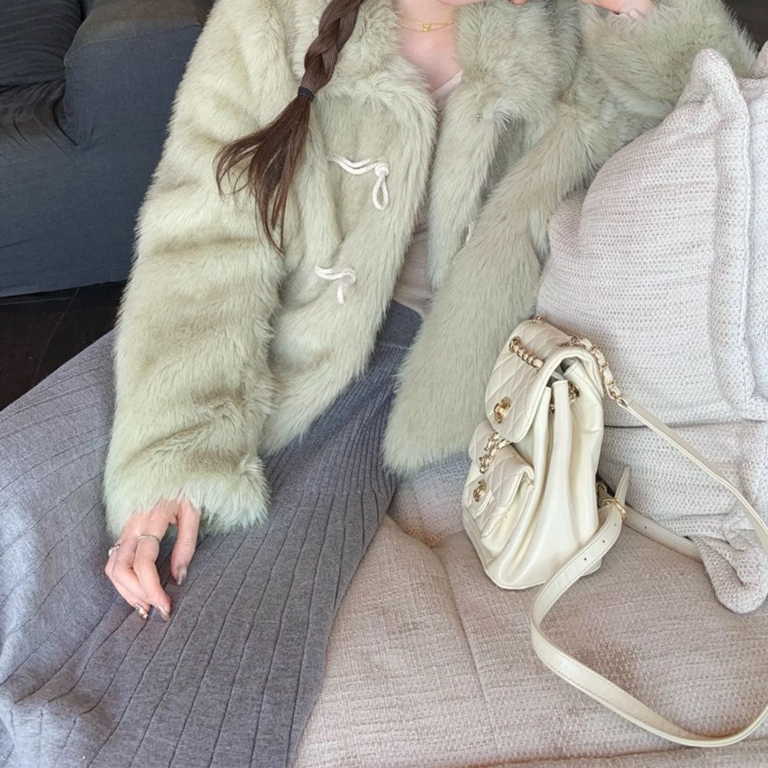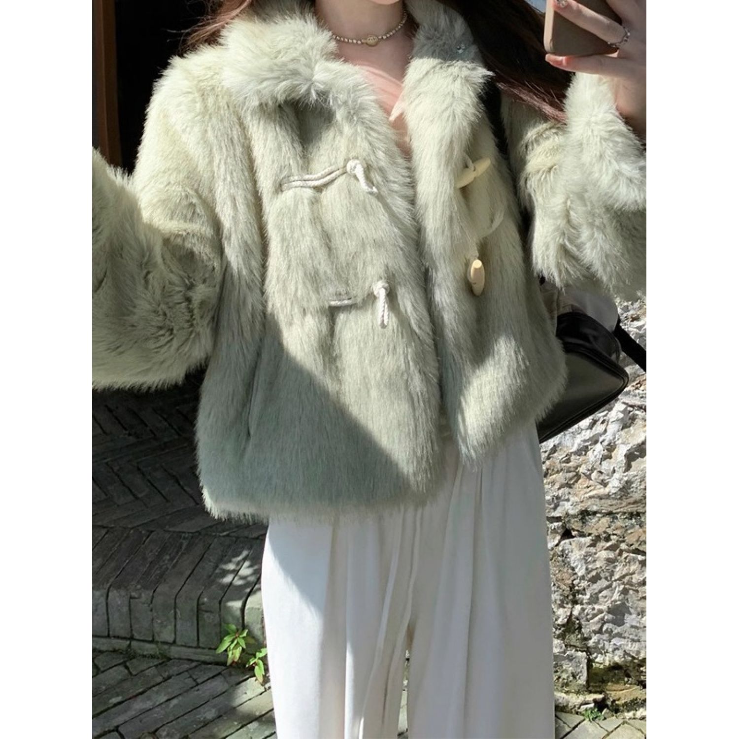 Green Horn Button Green Fur Short Plush Coat Matcha Green Free Size