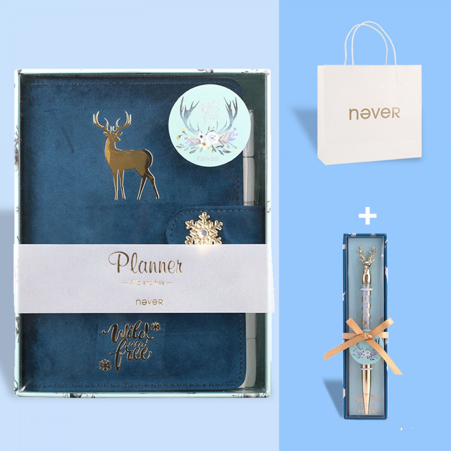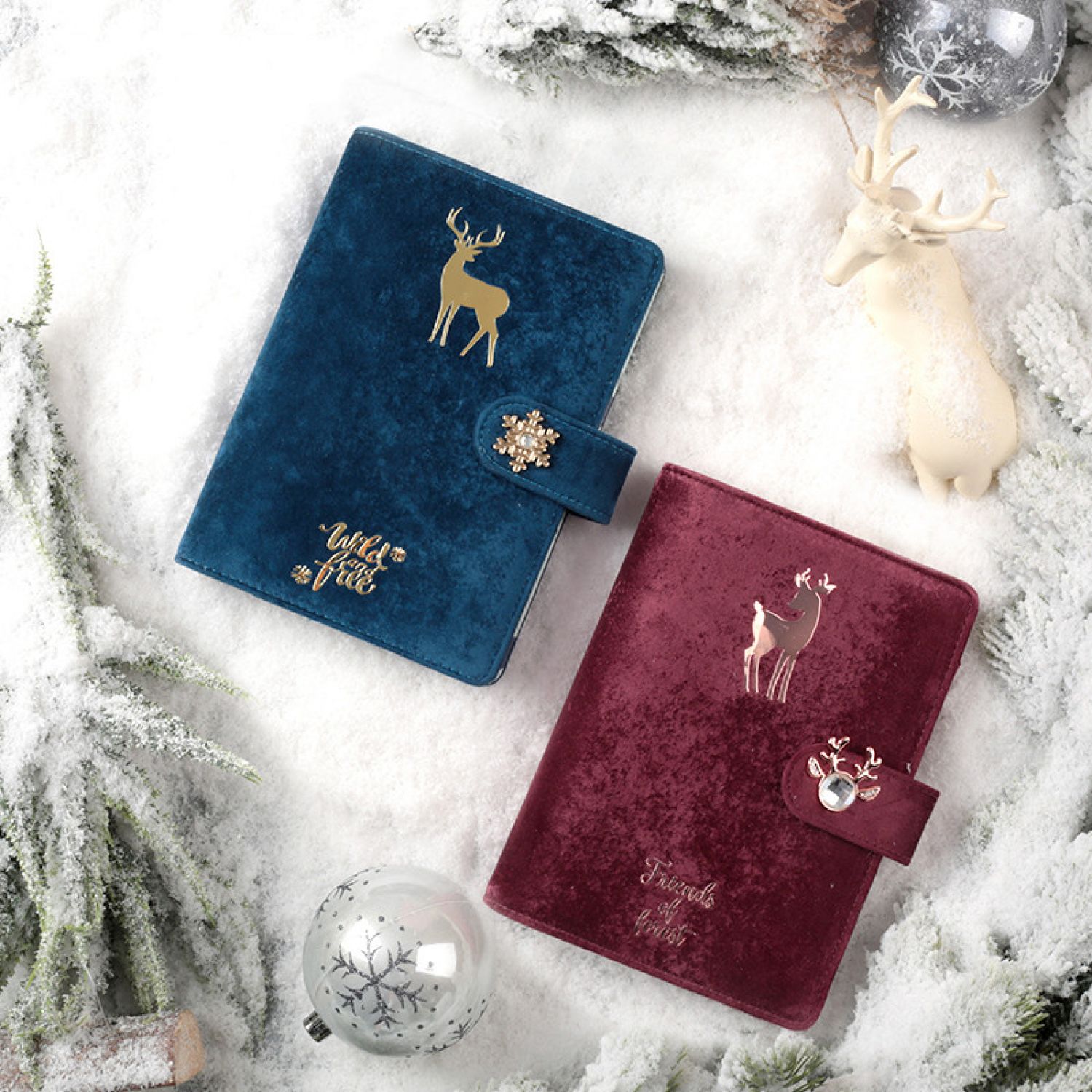 (D) Blue velvet A6 loose-leaf book + diamond deer head pen