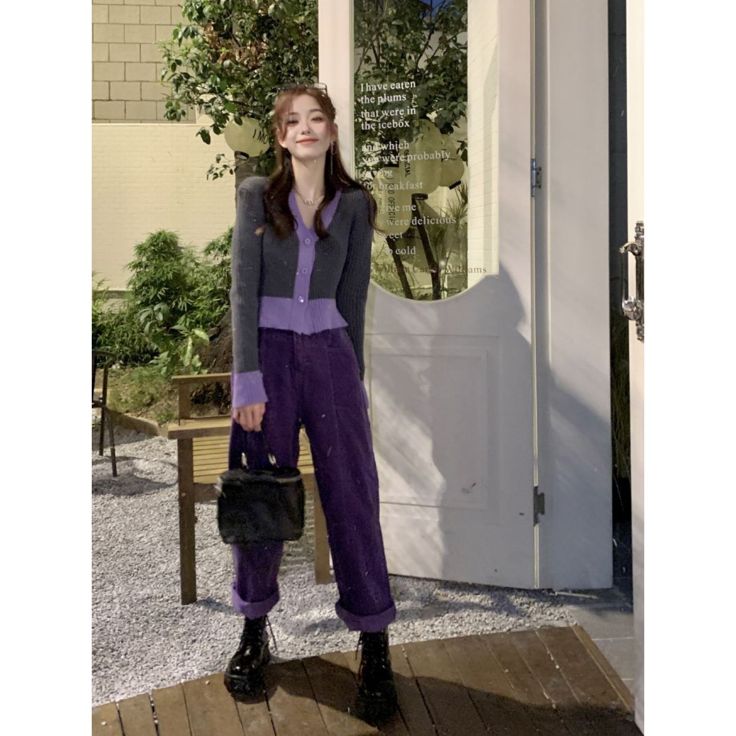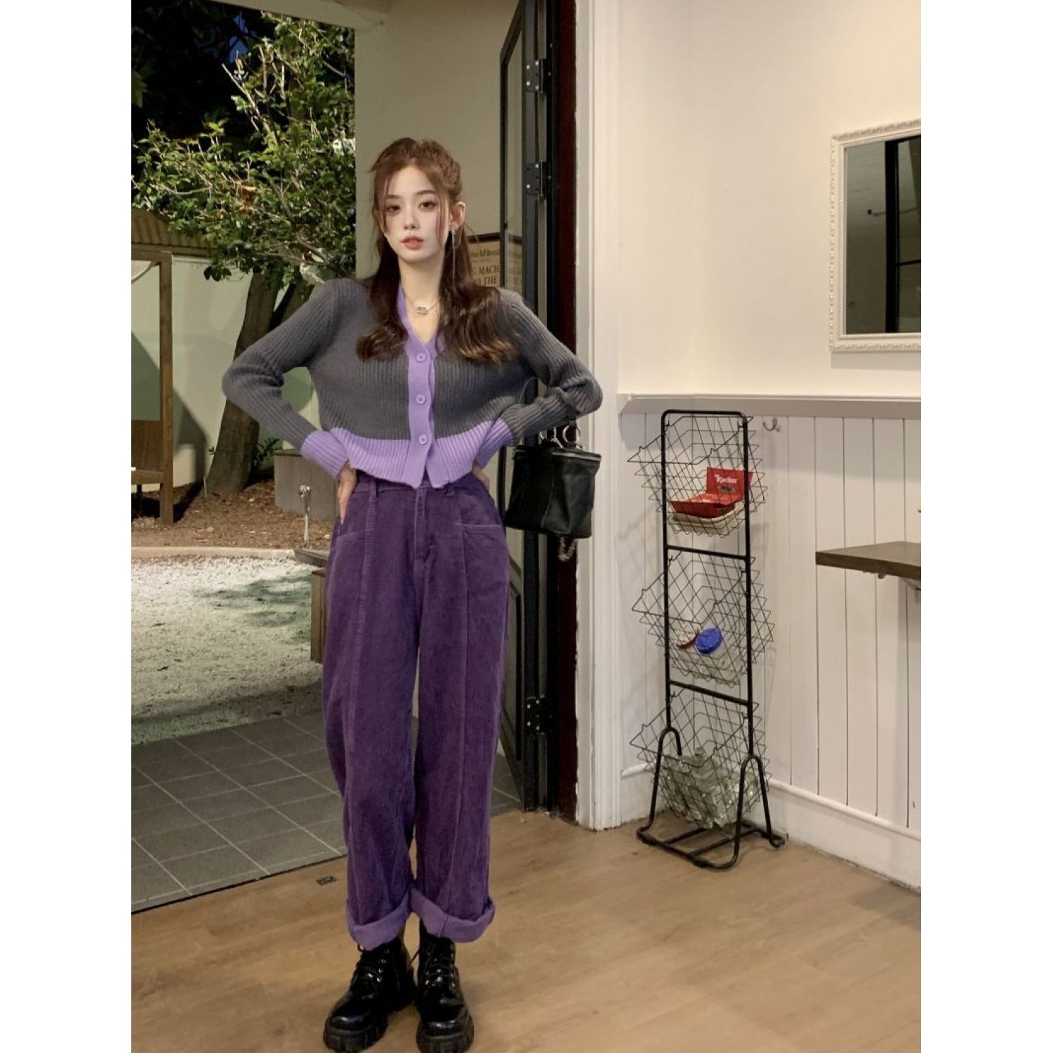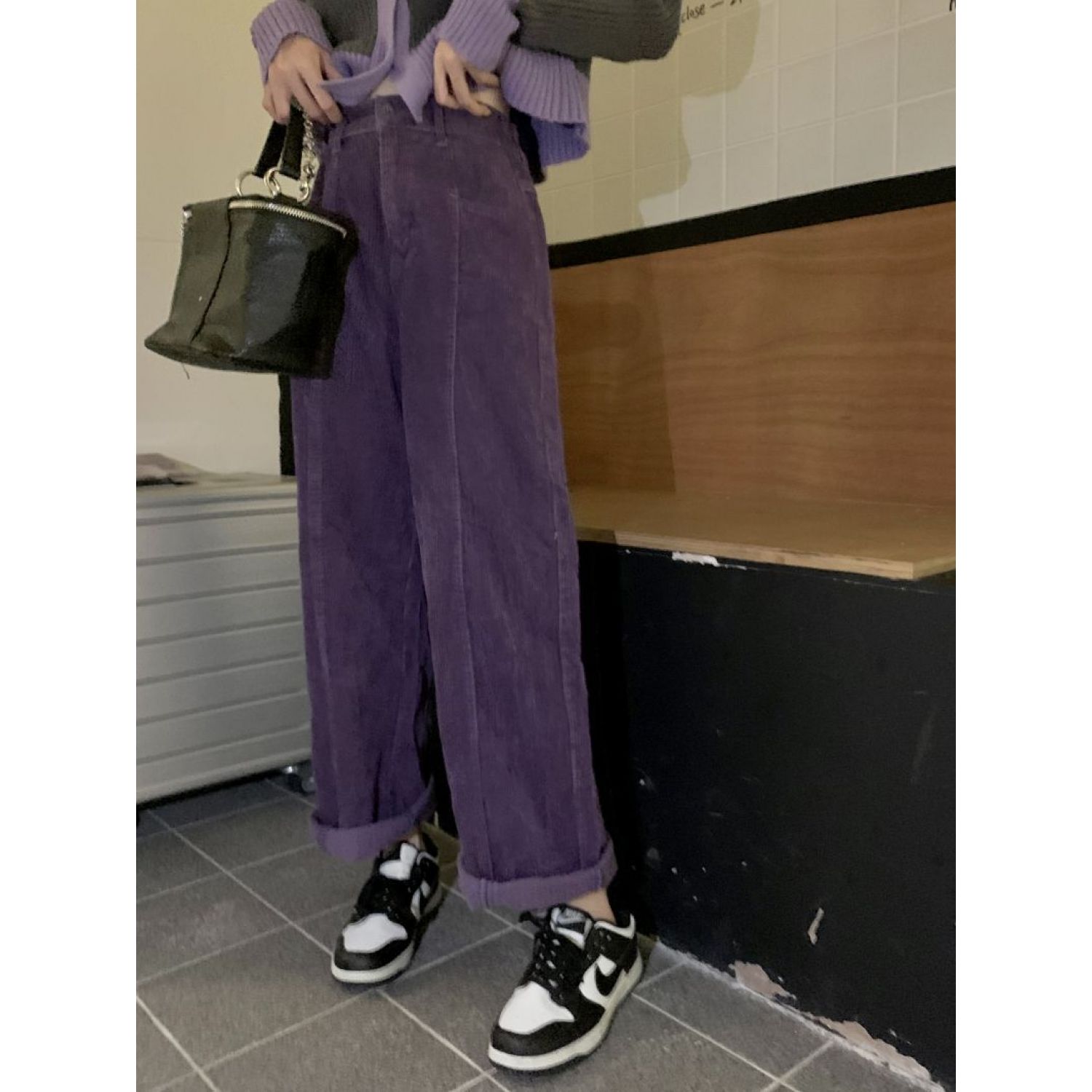 High Waist Slimming And Velvet Padded Straight Purple Corduroy Wide-leg Pants Purple Thin L