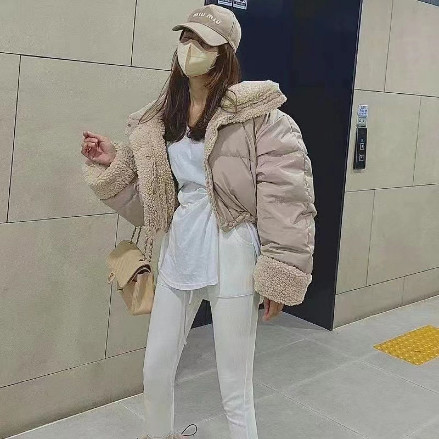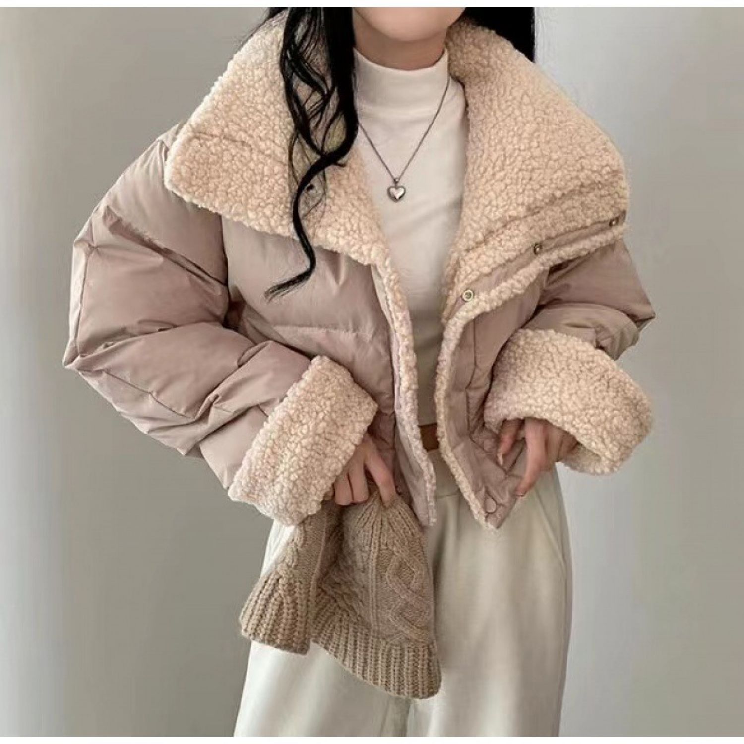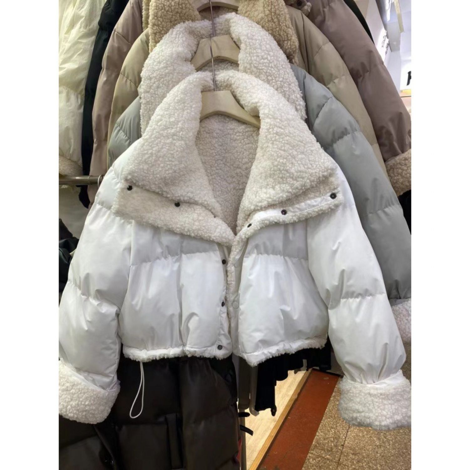 In Stock South Korea Chic Lapel Loose Thickening Keep Warm Reverse Short Wadded Jacket White Free Size