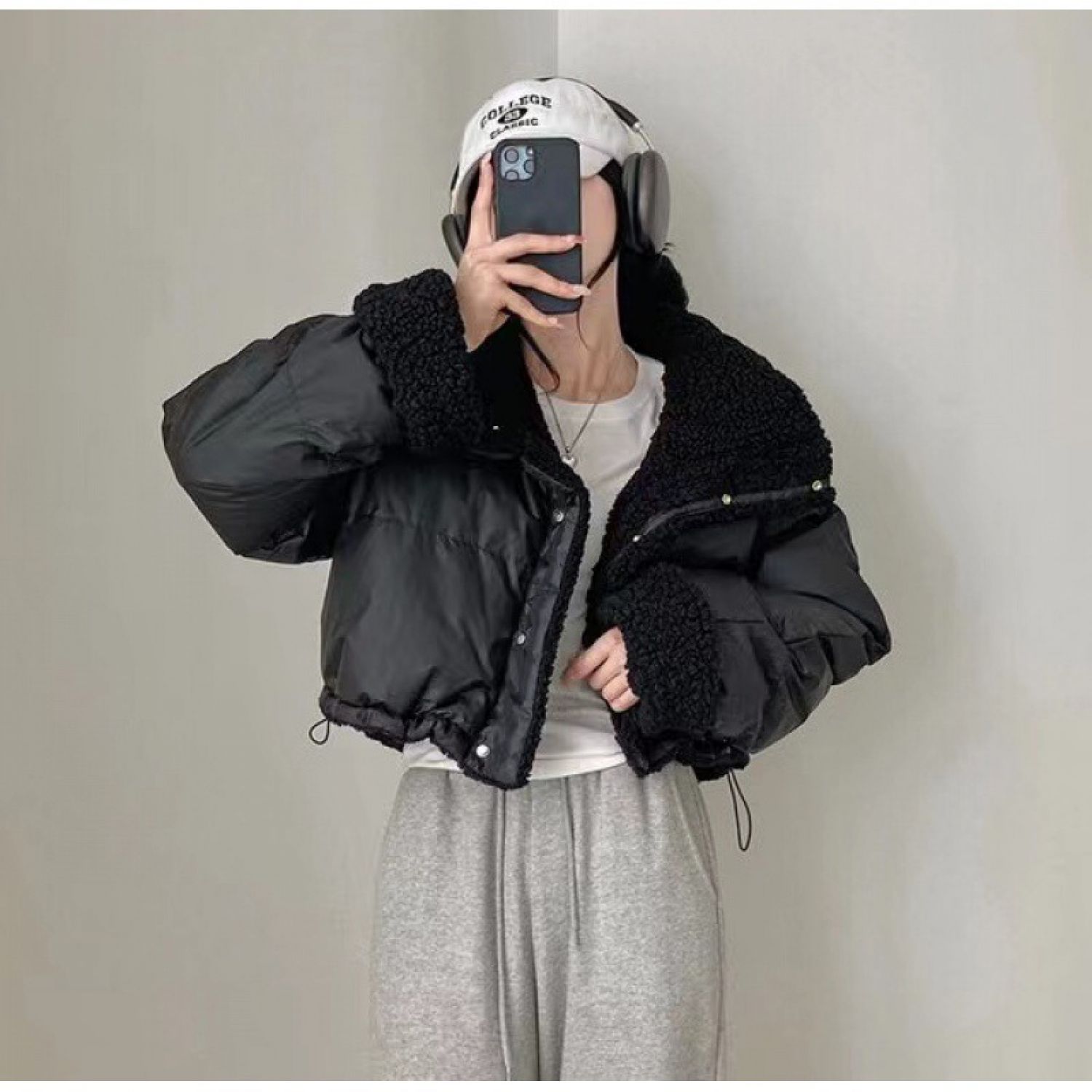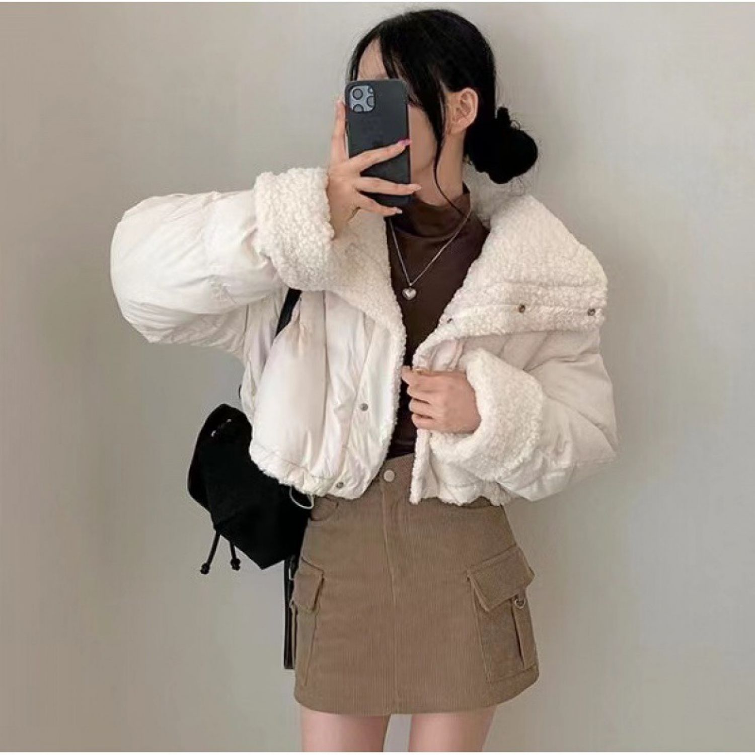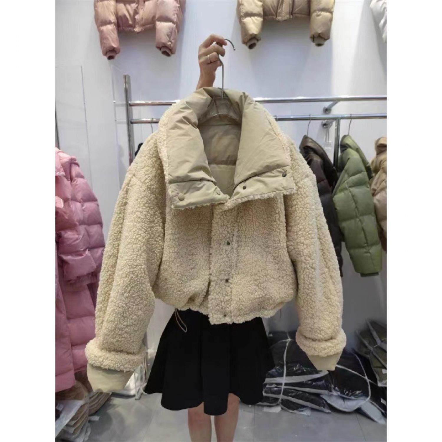 In Stock South Korea Chic Lapel Loose Thickening Keep Warm Reverse Short Wadded Jacket White Free Size