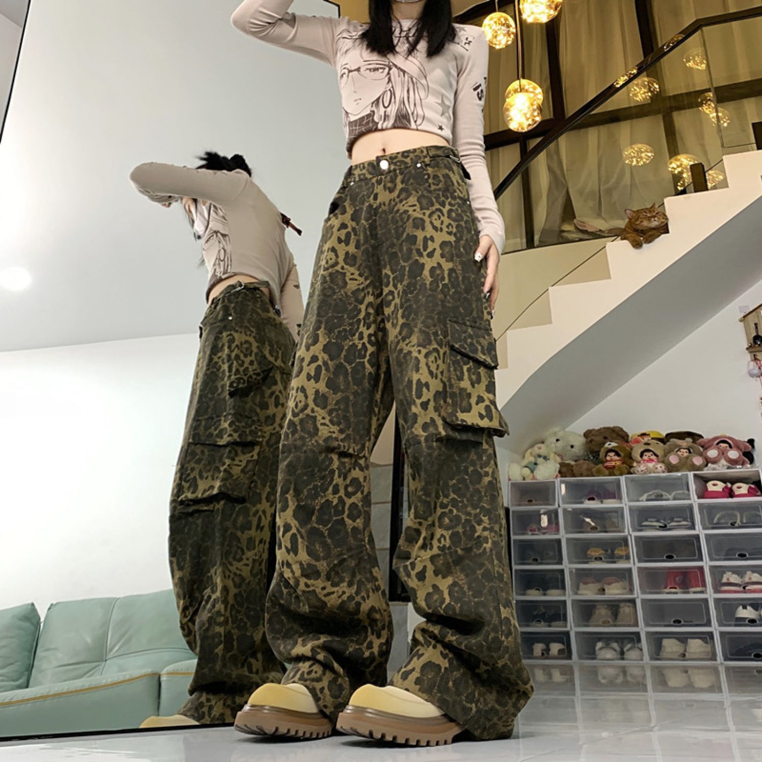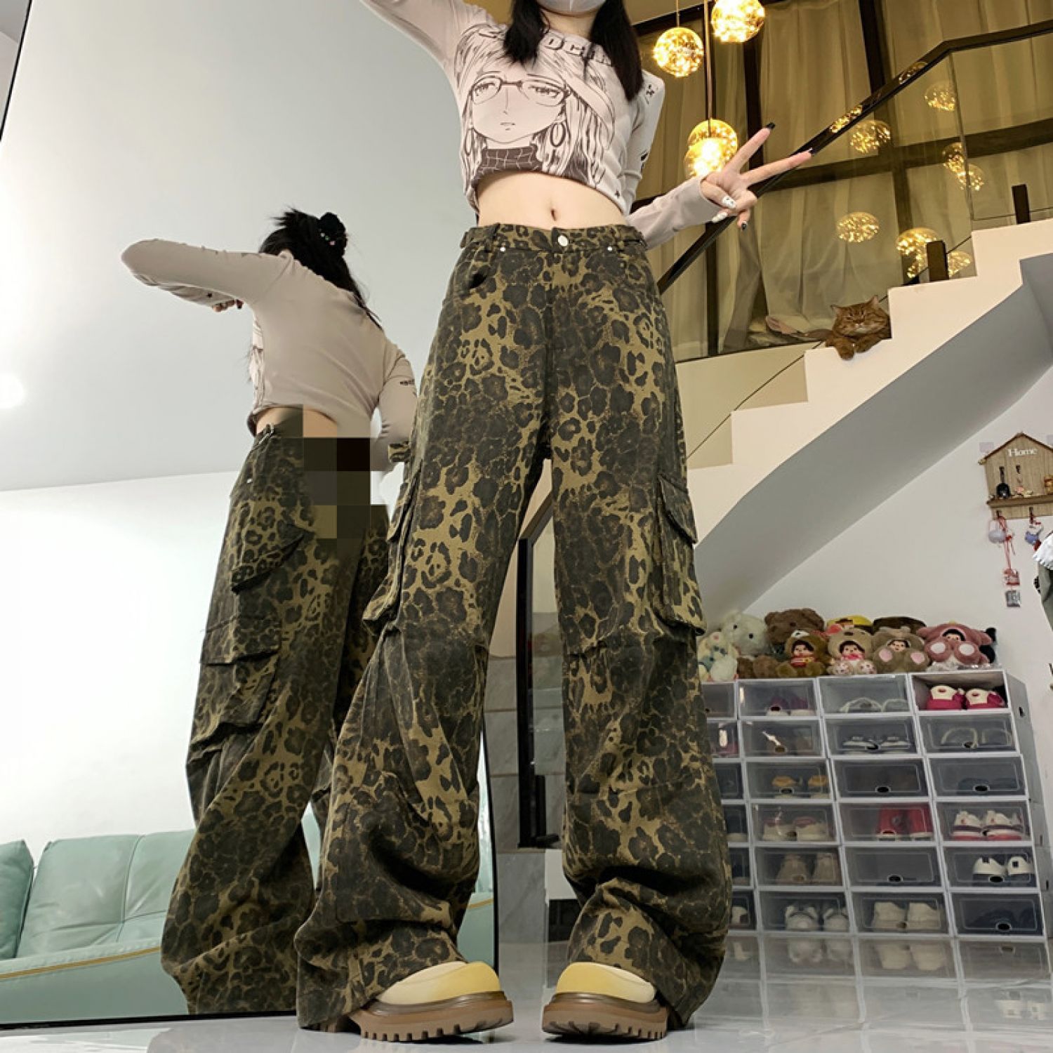 Product information: Color: Leopard work clothes Main fabric composition: Cotton Pants length: trousers Waist type: high waist Size: S,M,L,XL Popular elements: Pocket Style: Three-dimensional cutting