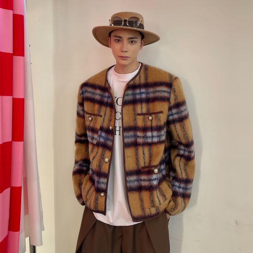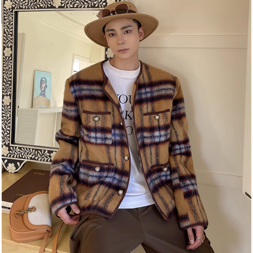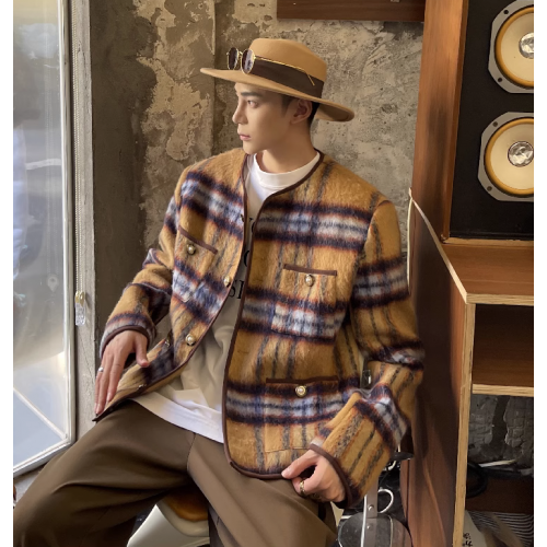 Mohair Plaid Vintage Long Woolen Collarless Jacket Yellow M