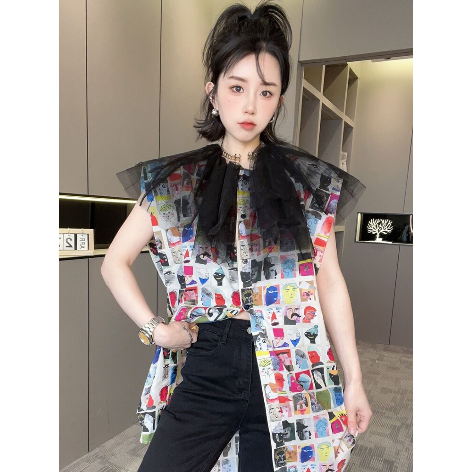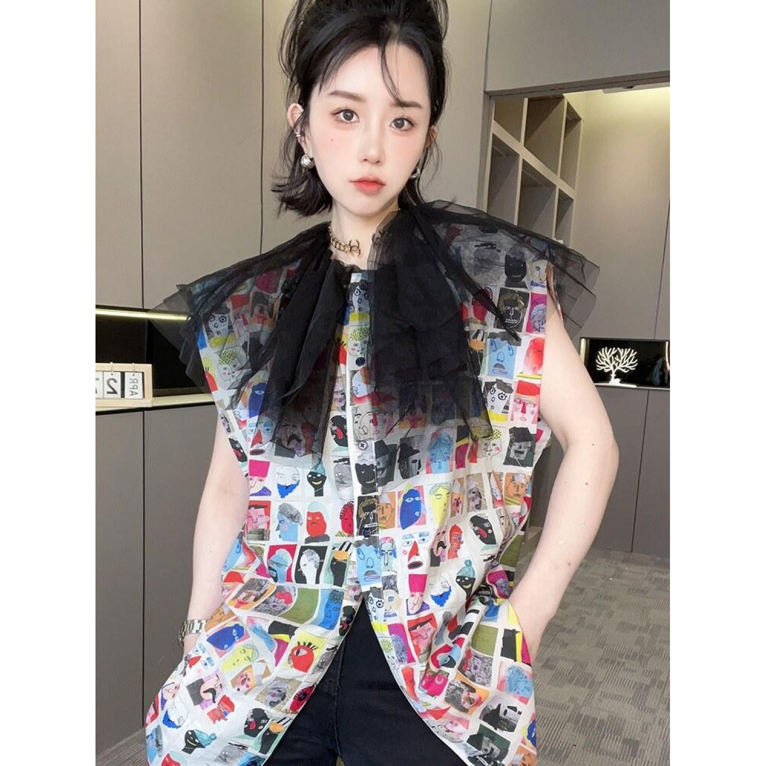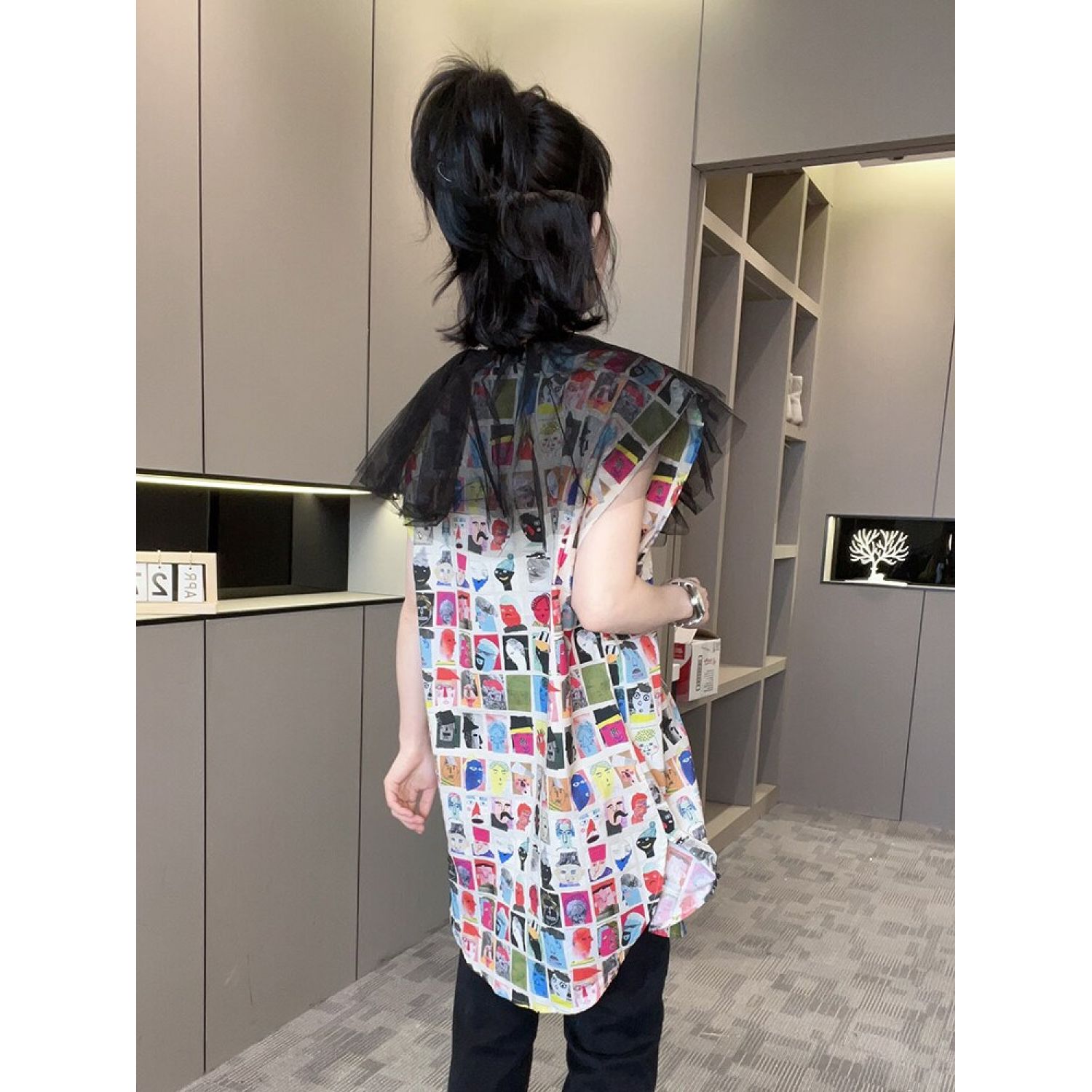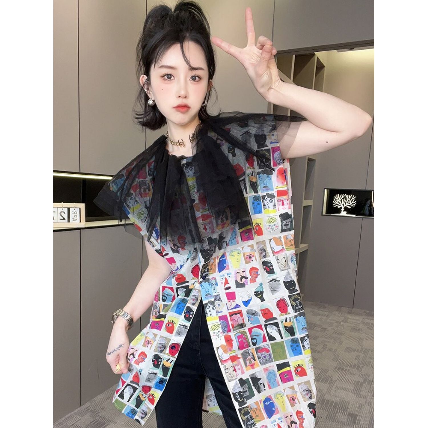 New Mid-length Cartoon Printed Mesh Patchwork Top Printing S