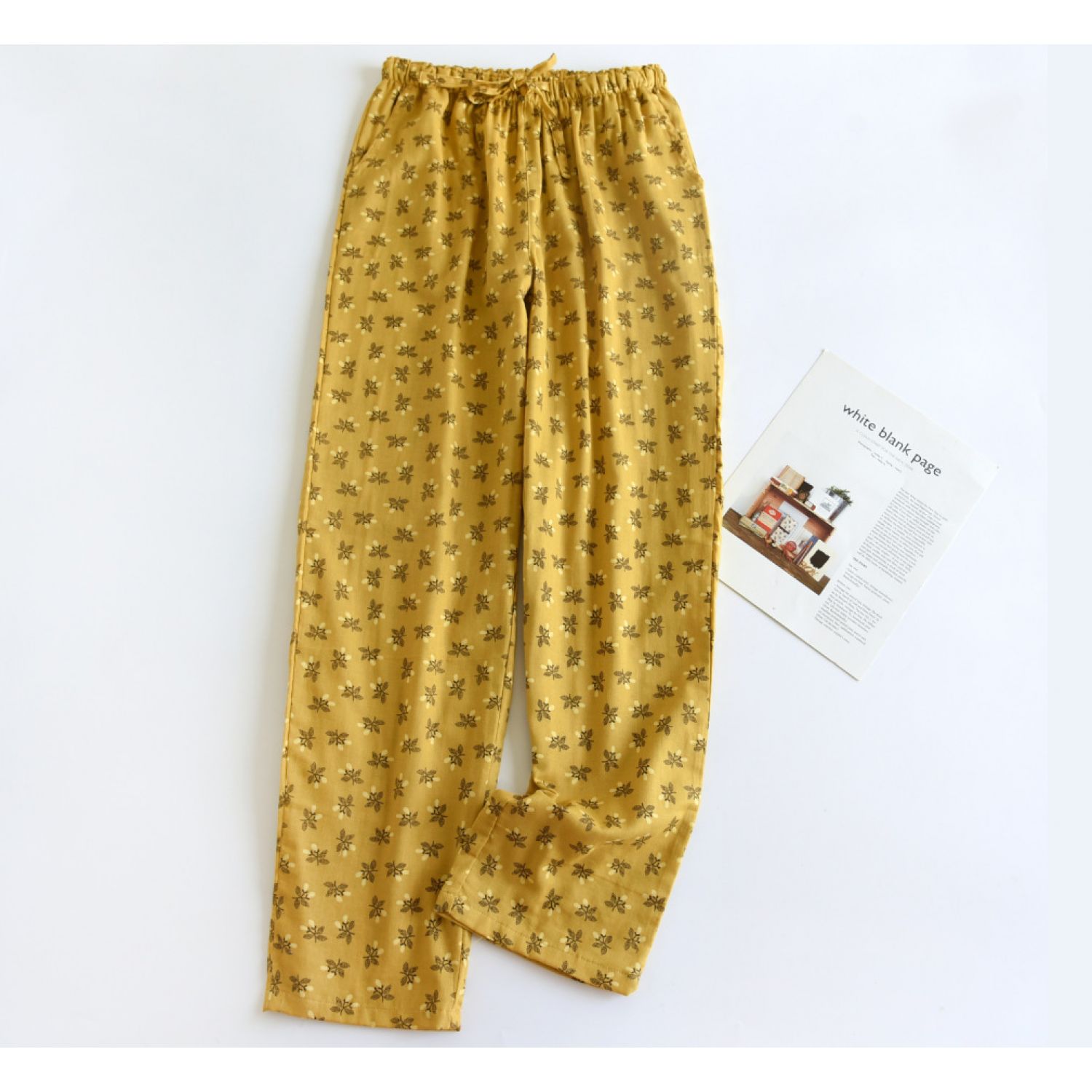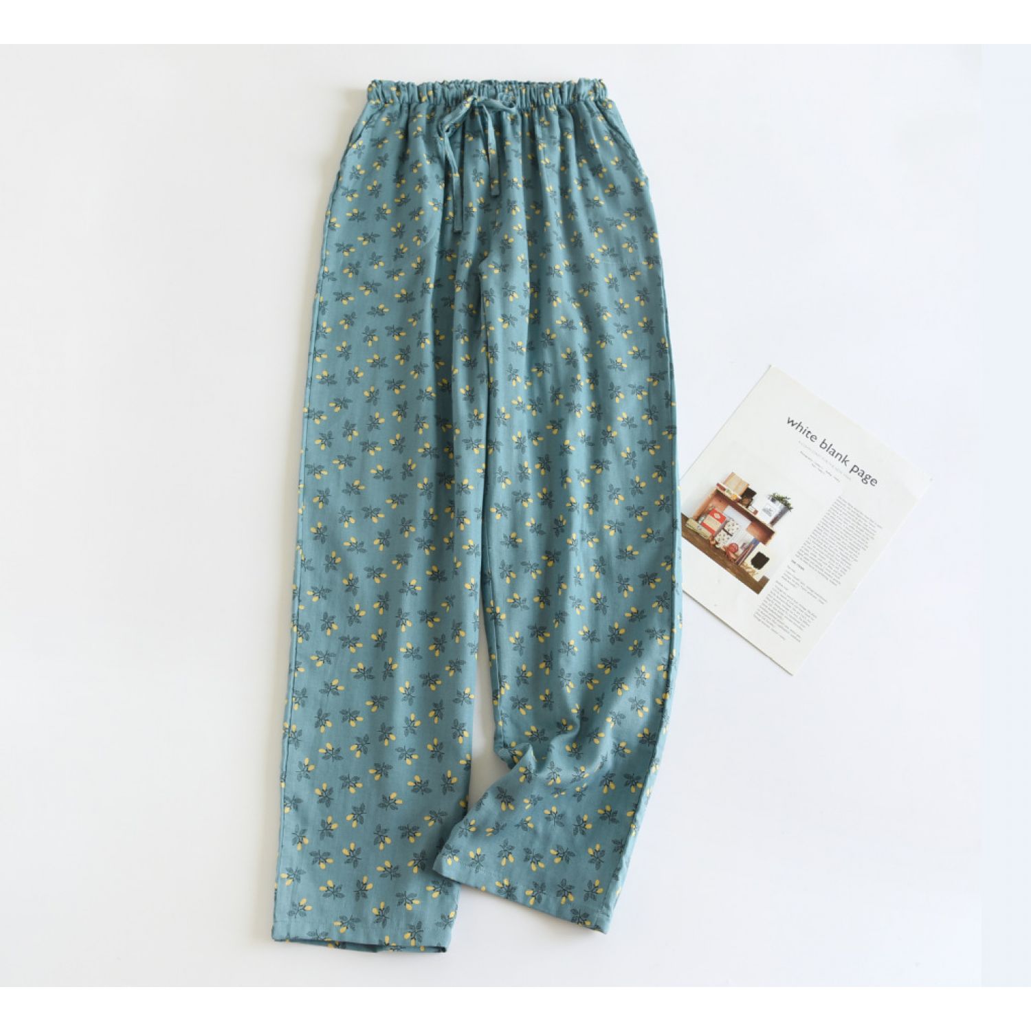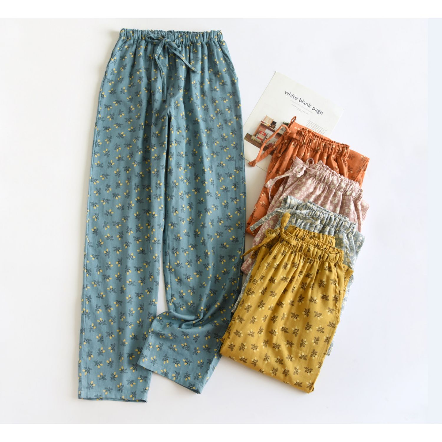 Color: dark blue fruitful gauze pajama pants, yellow fruitful gauze pajama pants, orange fruitful gauze pajama pants, Lisa Blue Flower gauze pajama pants, Lisa crushed flower gauze pajama pants