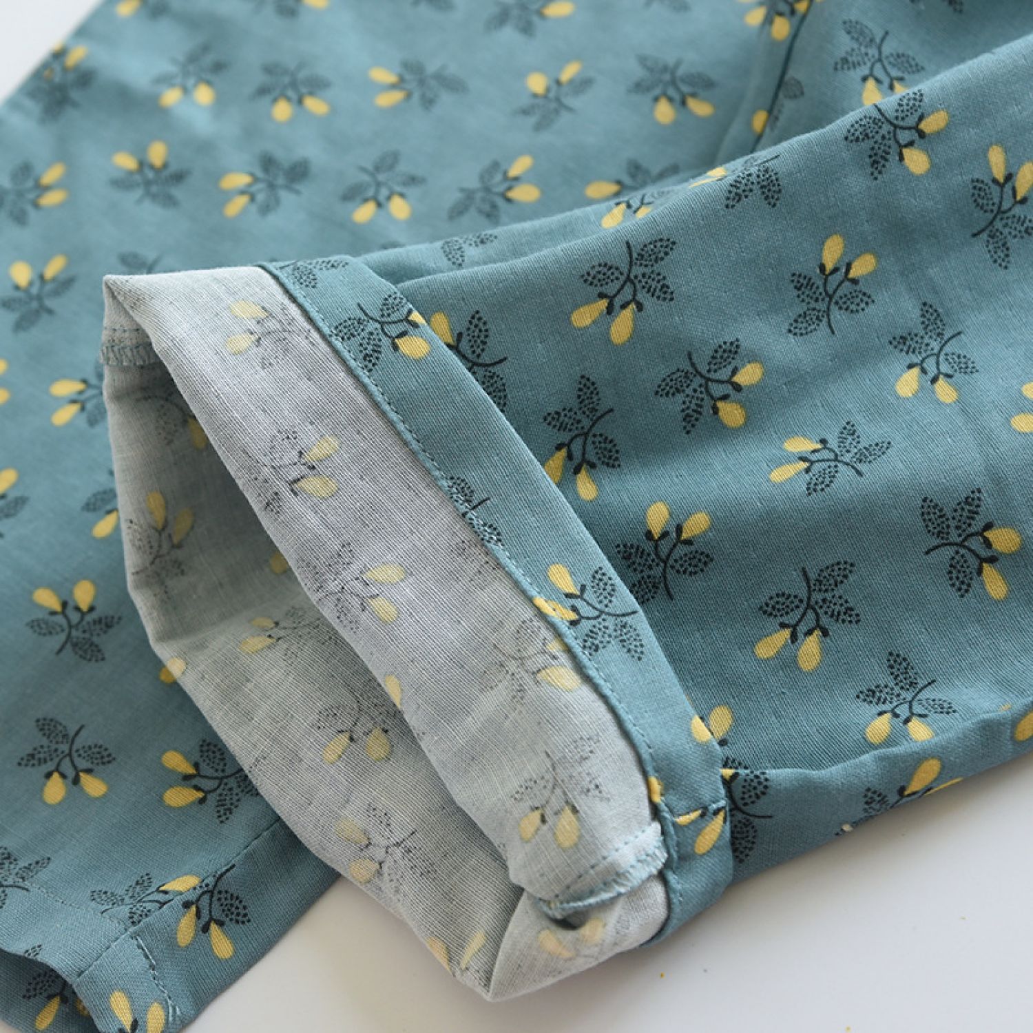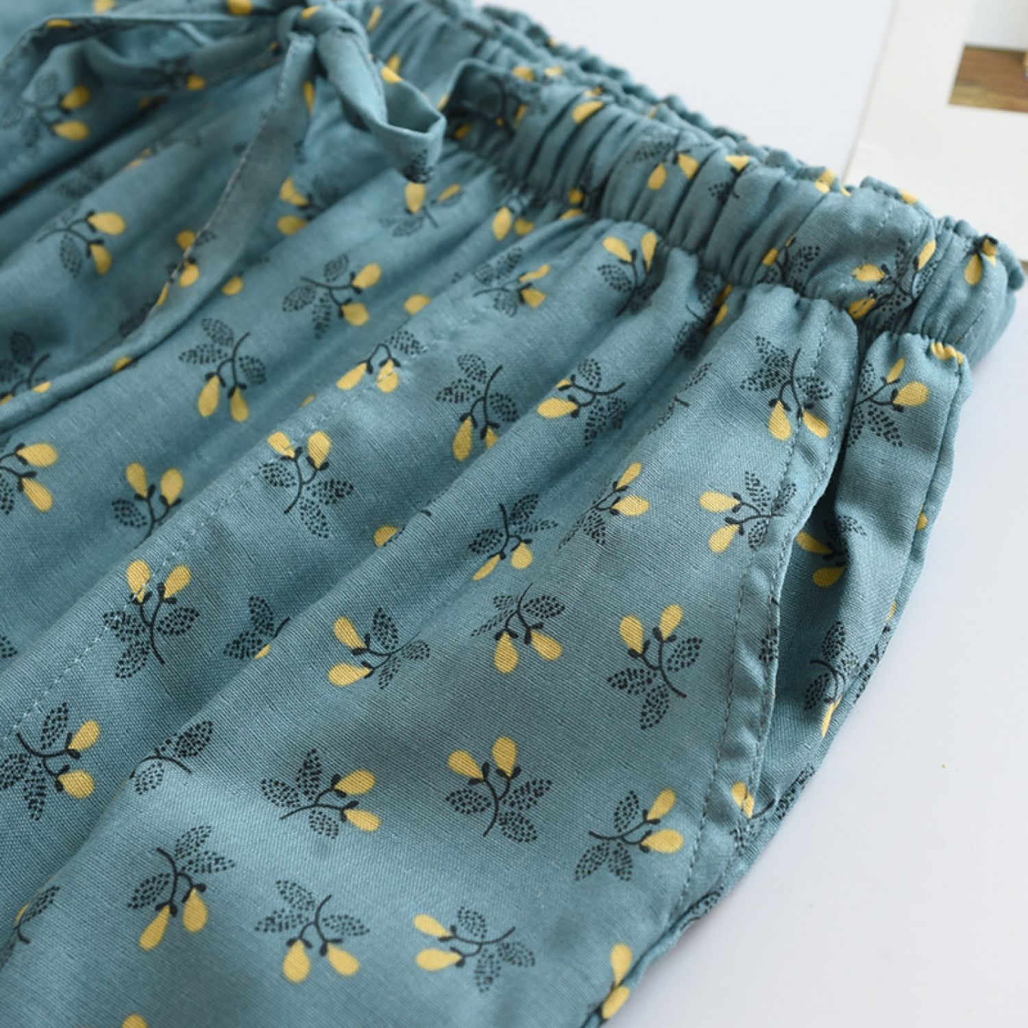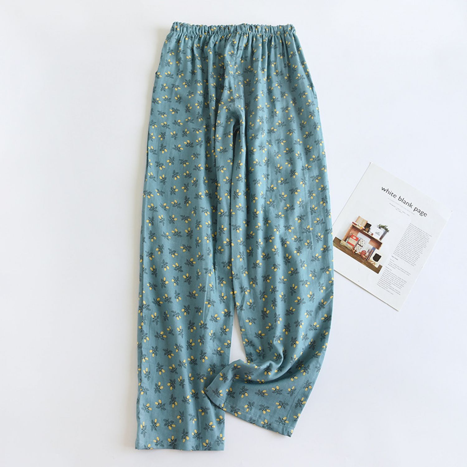 Color: dark blue fruitful gauze pajama pants, yellow fruitful gauze pajama pants, orange fruitful gauze pajama pants, Lisa Blue Flower gauze pajama pants, Lisa crushed flower gauze pajama pants