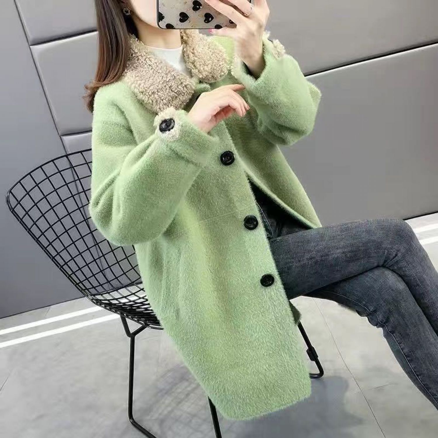 New Single-breasted Mid-length Knitted Coat Loose White One size