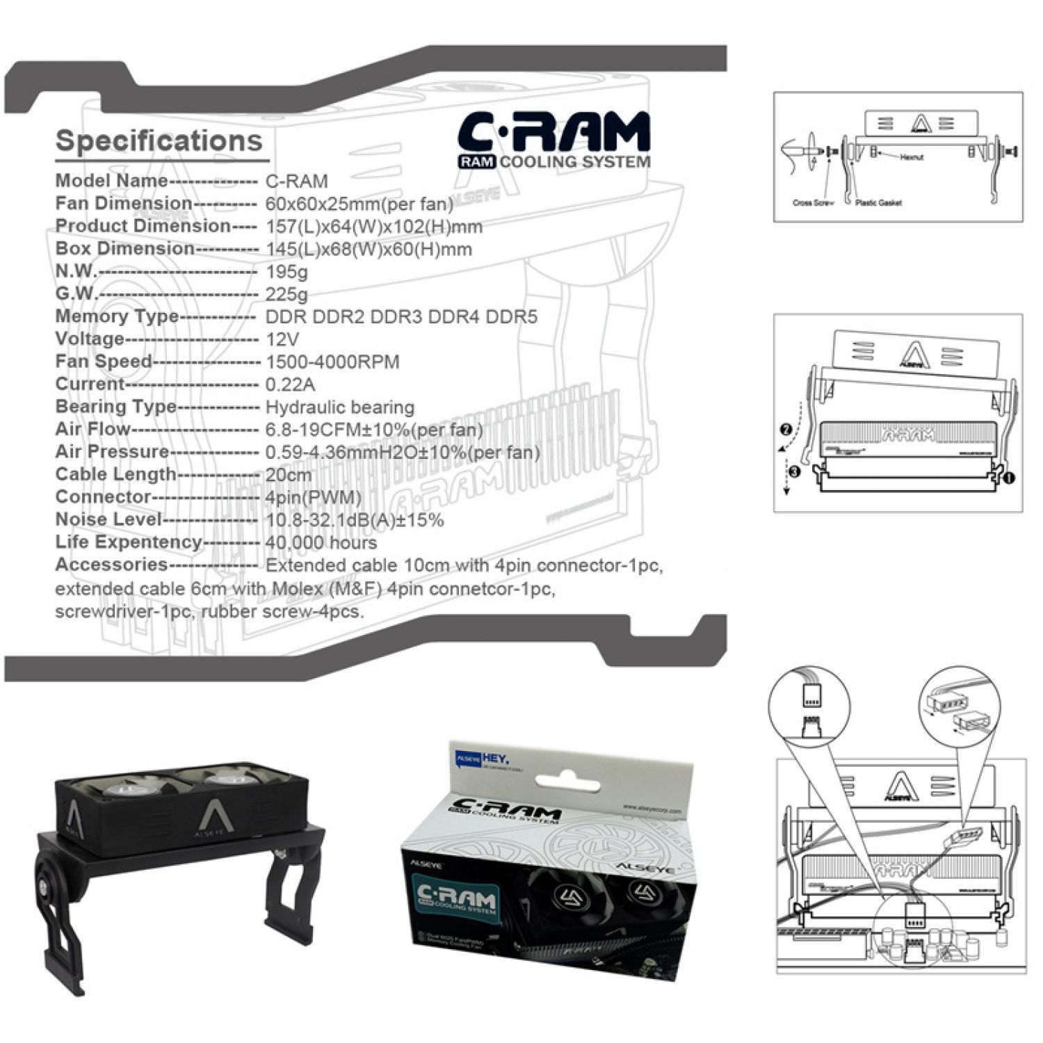 Accessories: 10cm 4pin extension cable, 6cm 4pin 4pin MOLEX (male / female) extension cable,