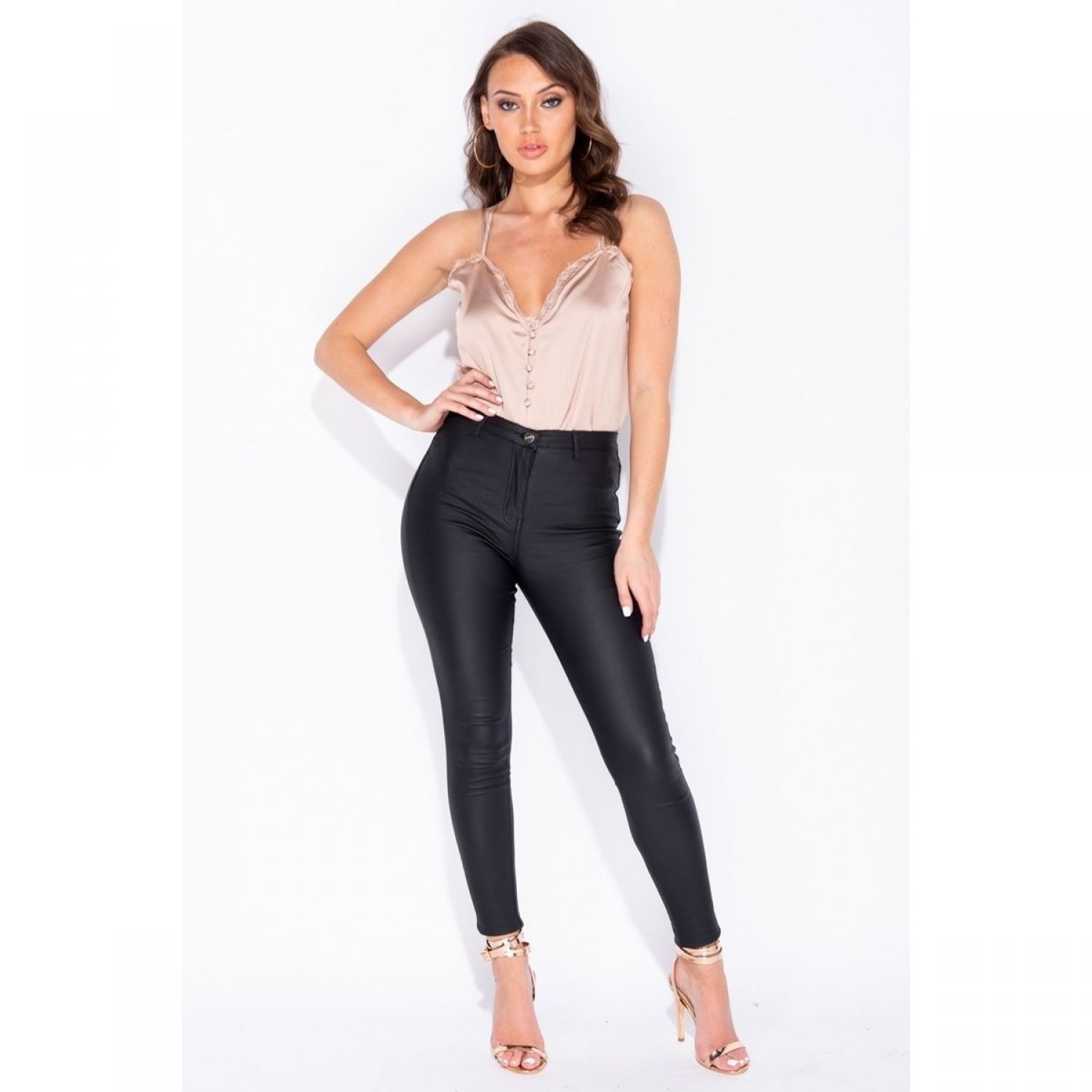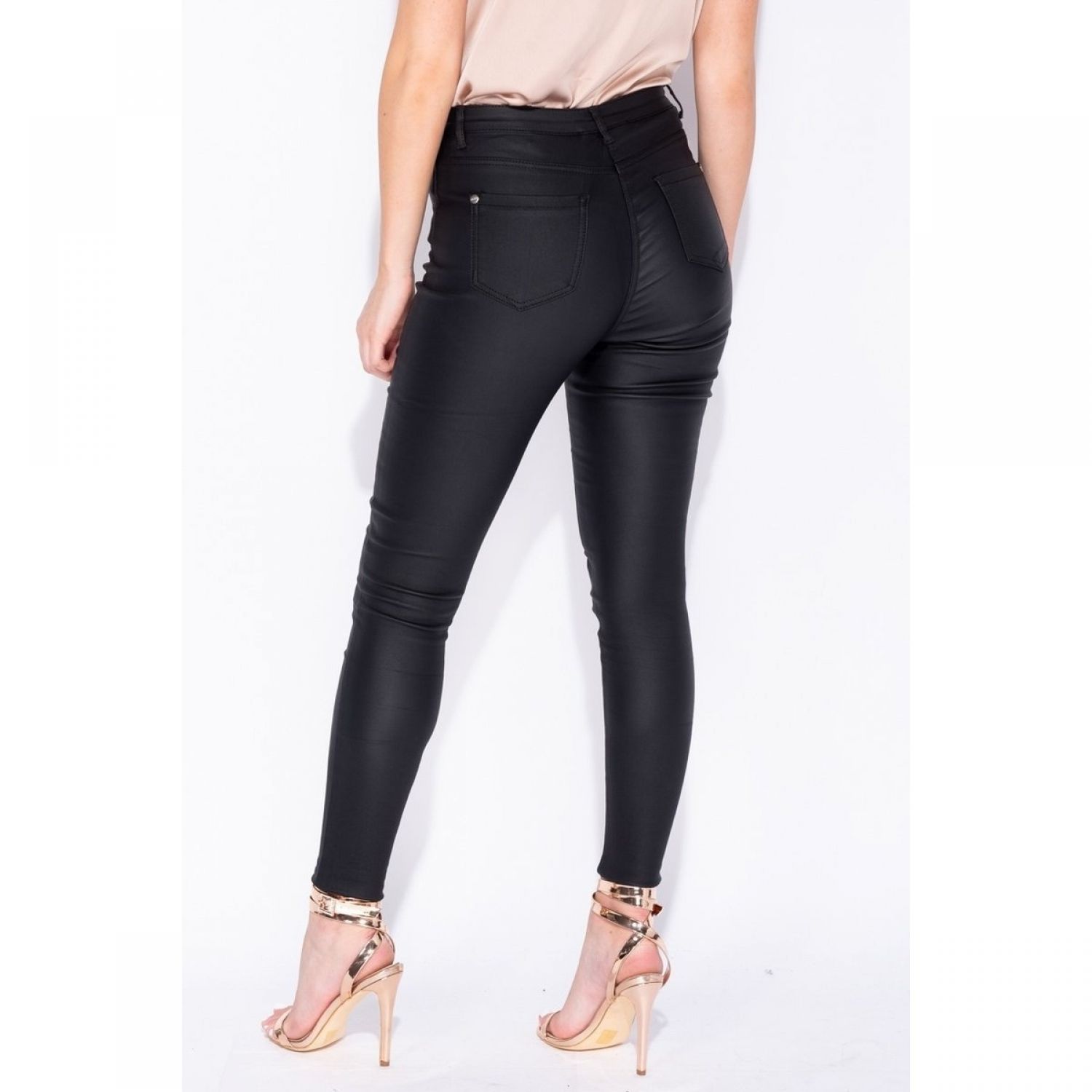 Leather-look jeggings are fast becoming the style staple. Get your wardrobe fix with this coated pair featuring a high waist & zip detail. For a night out look picture perfect & style them with a crop top & heels.