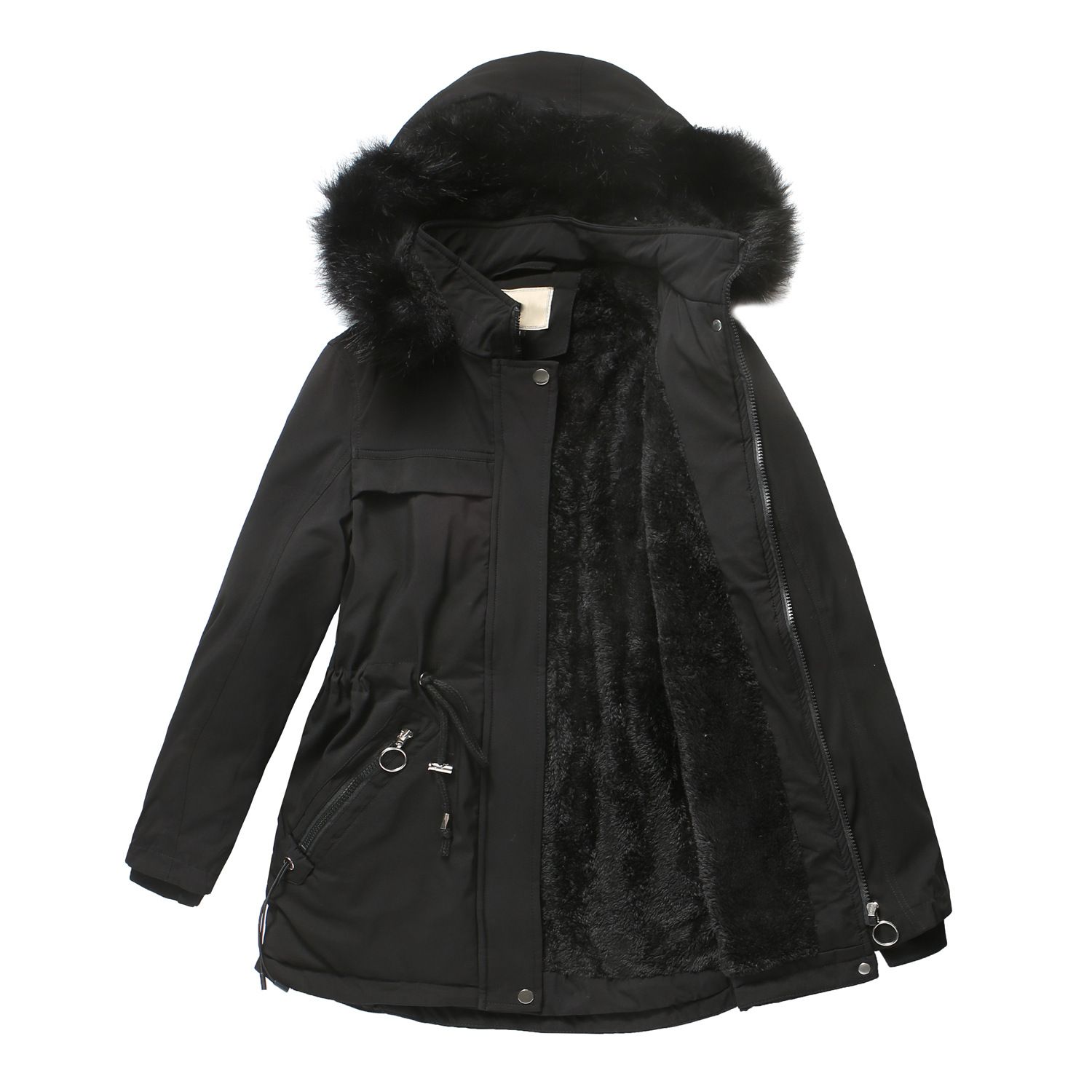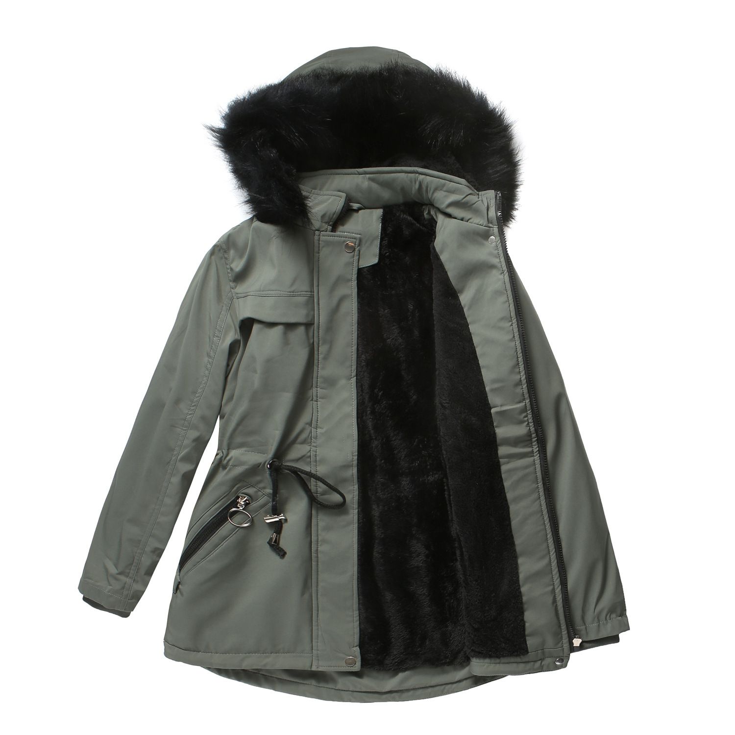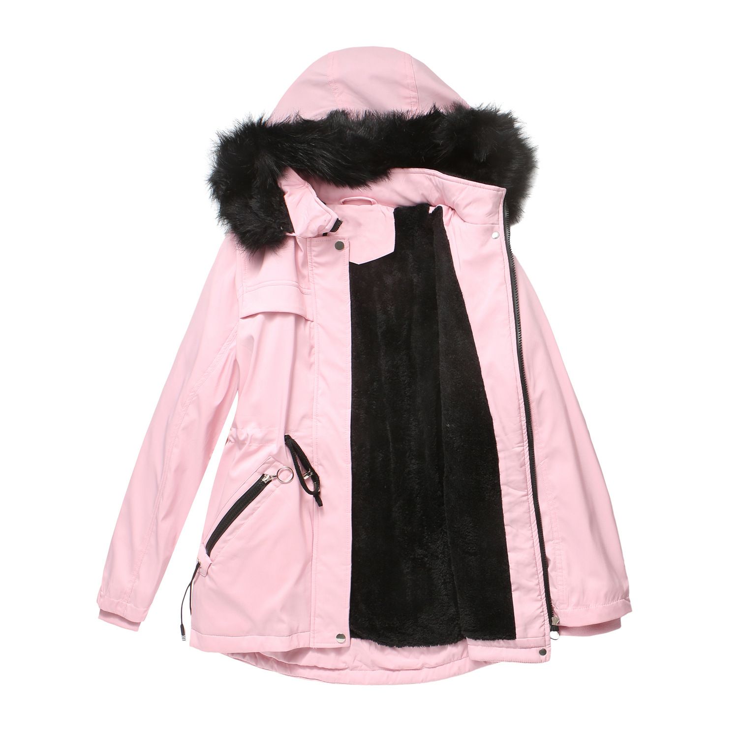 Clothing style details: zipper, pocket, with fur collar