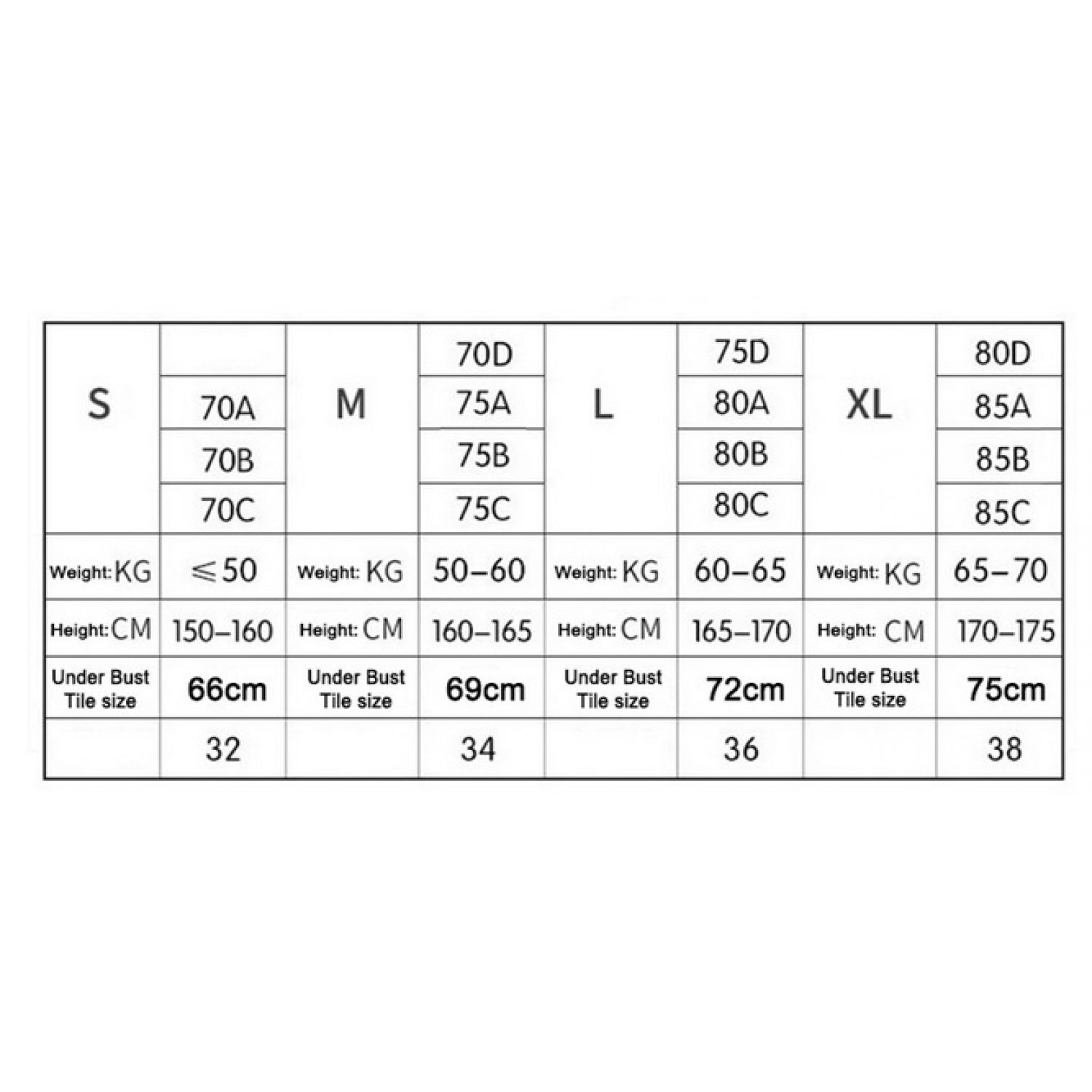 Size: S(32/70ABC),M(34/75ABC),L(36/80ABC),XL(38/85ABC),XXL(40/90ABC)