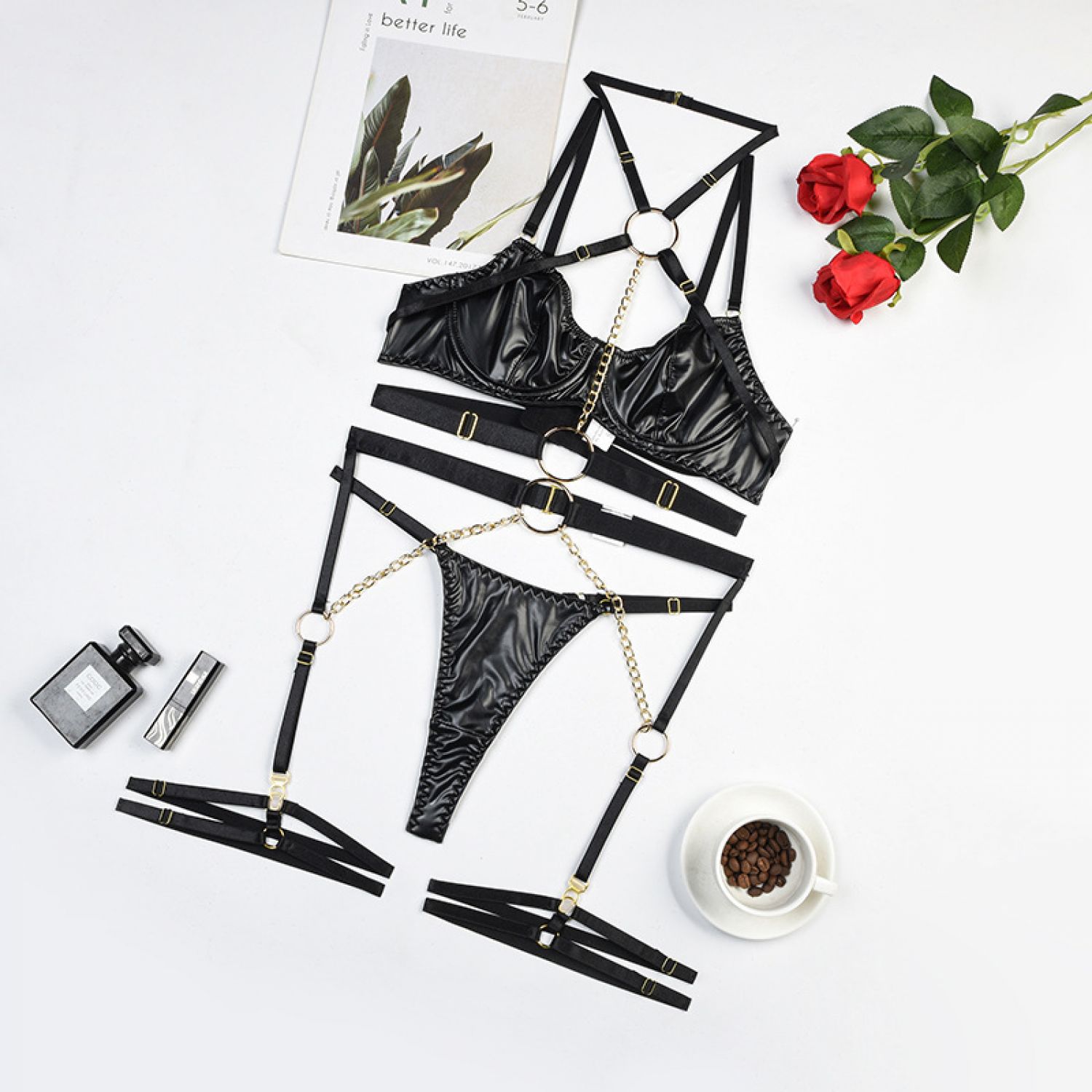 Bra*1 Panties*1 Garter belt*1 Leg ring*1pair