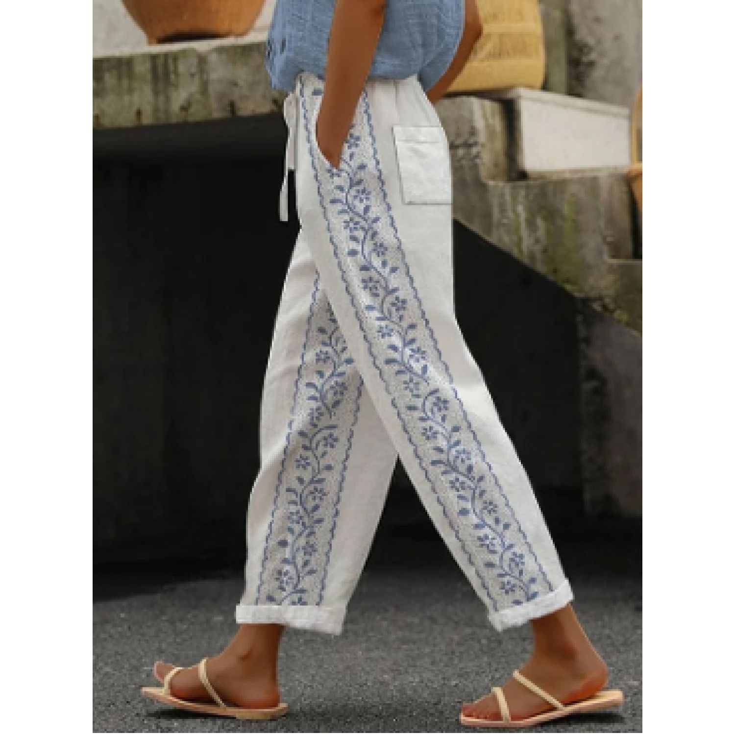 Color: blue, white, khaki, gray, black, white flower