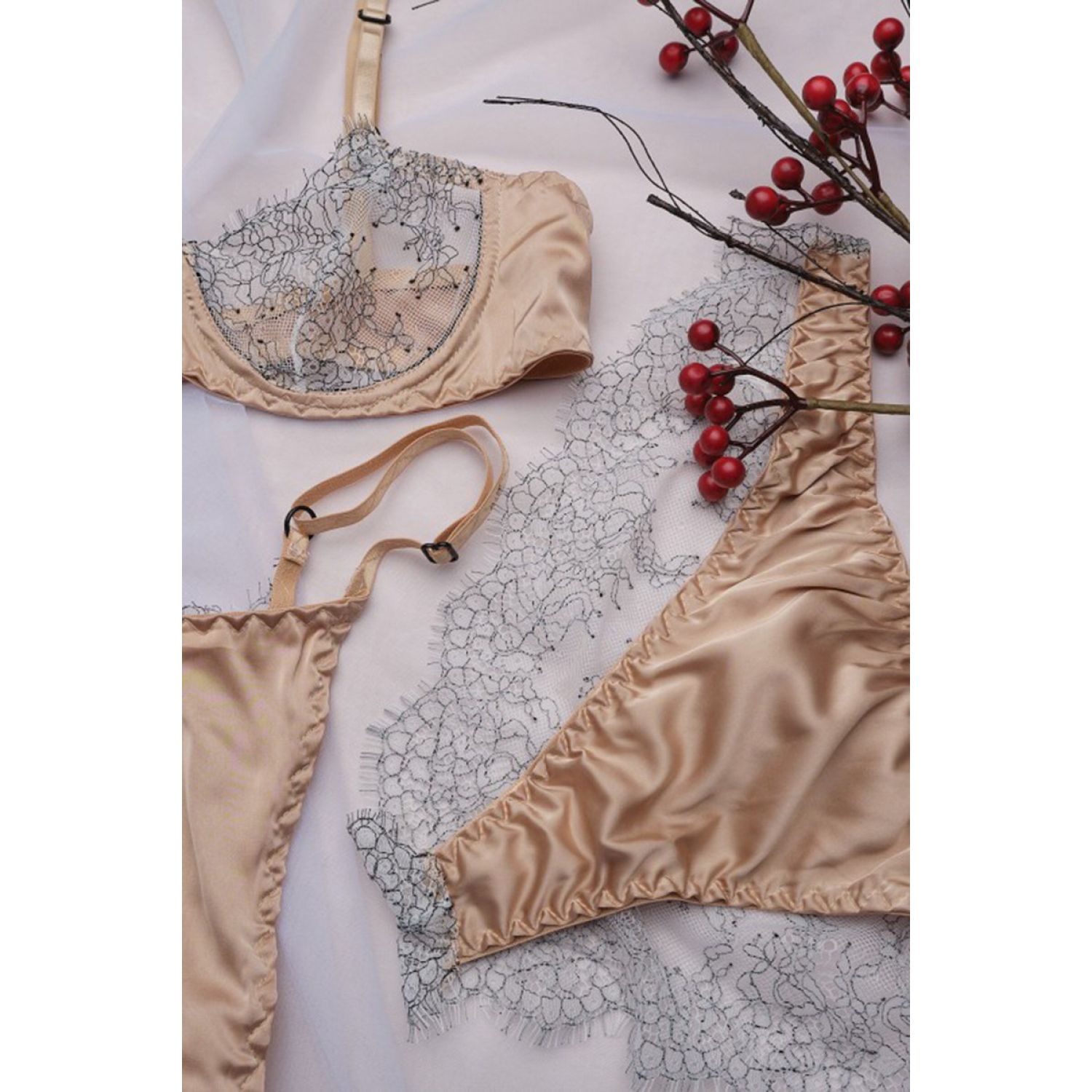 Ultra-thin Steel Ring See-through Lace Stitching Eyelash Underwear Three-piece Set Apricot S